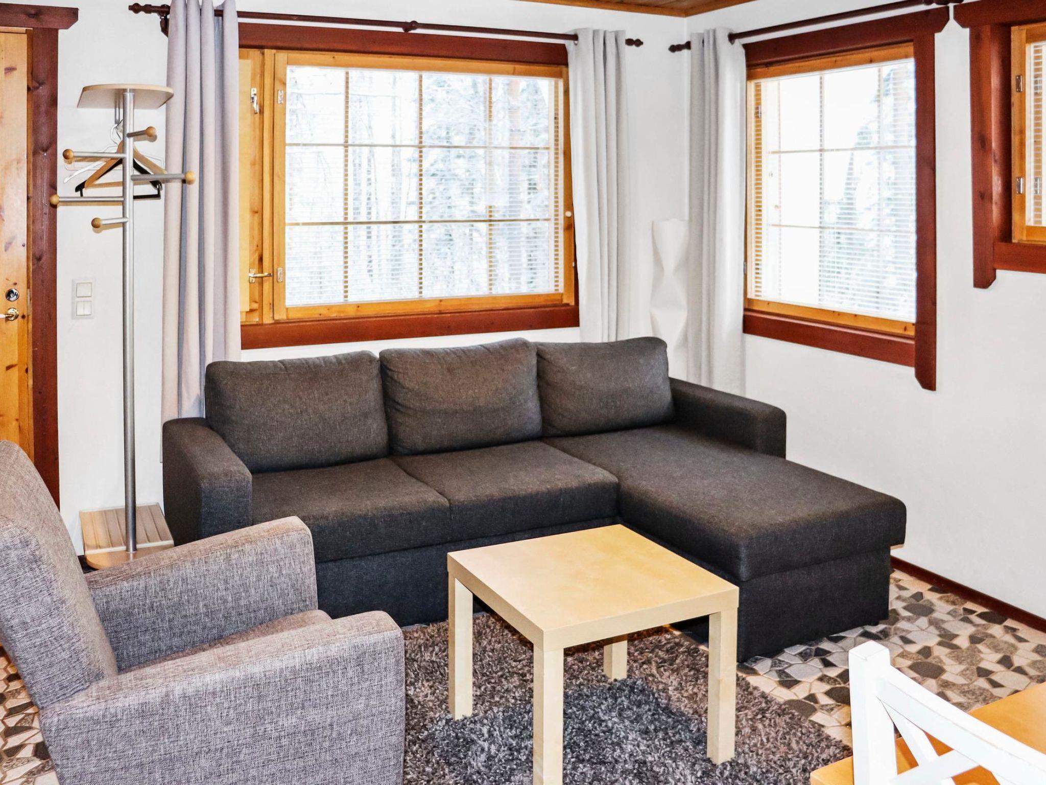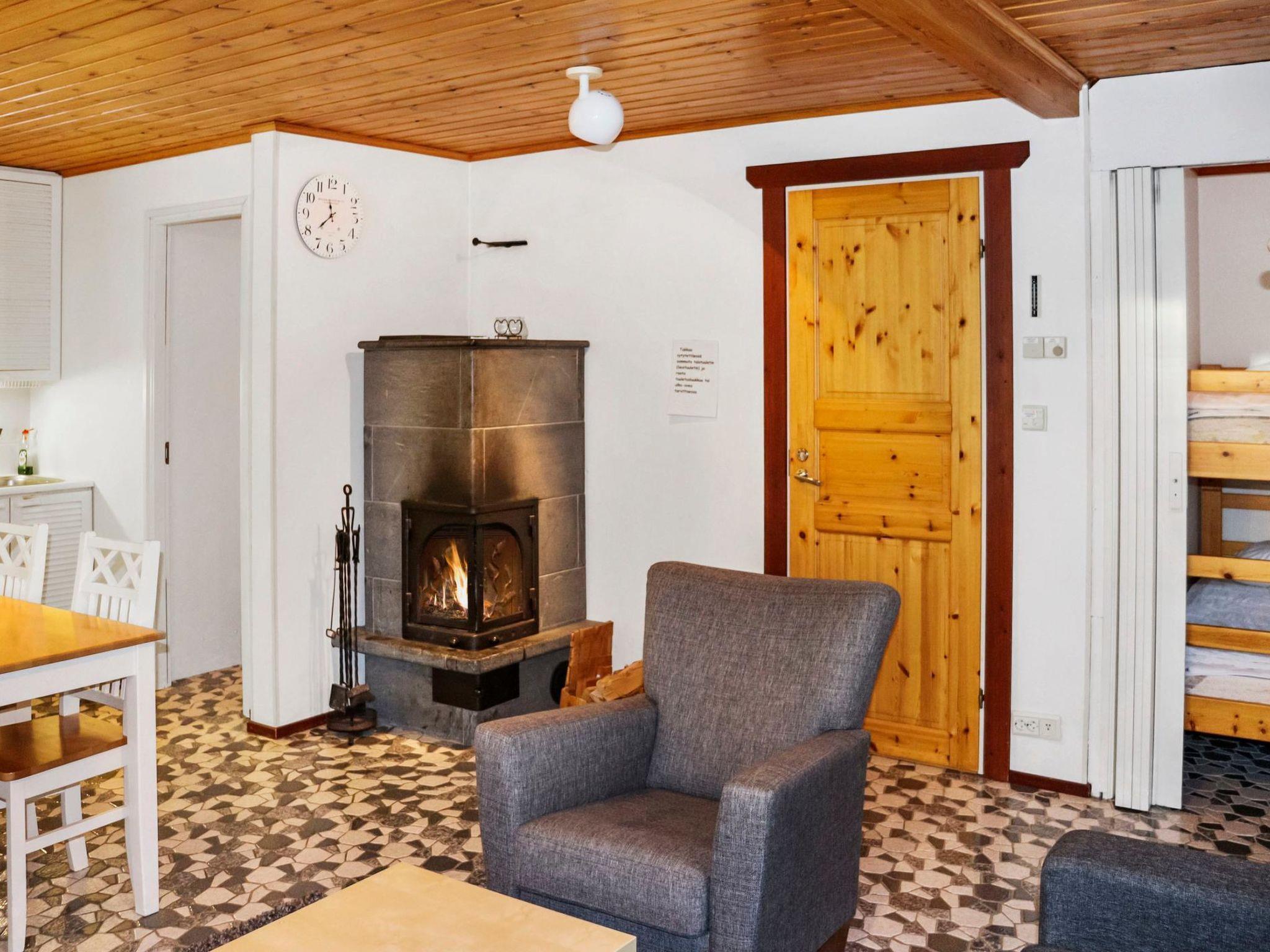 The downstairs of a semi-detached house located in the Ukkohalla tourism centre, 4 + 2 persons, 42m2 built in 1991, kitchen, bedroom with two beds, sleeping corner with a bunk bed, sauna, shower room/toilet, vestibule, terrace, fireplace, sofa-bed in the living room.