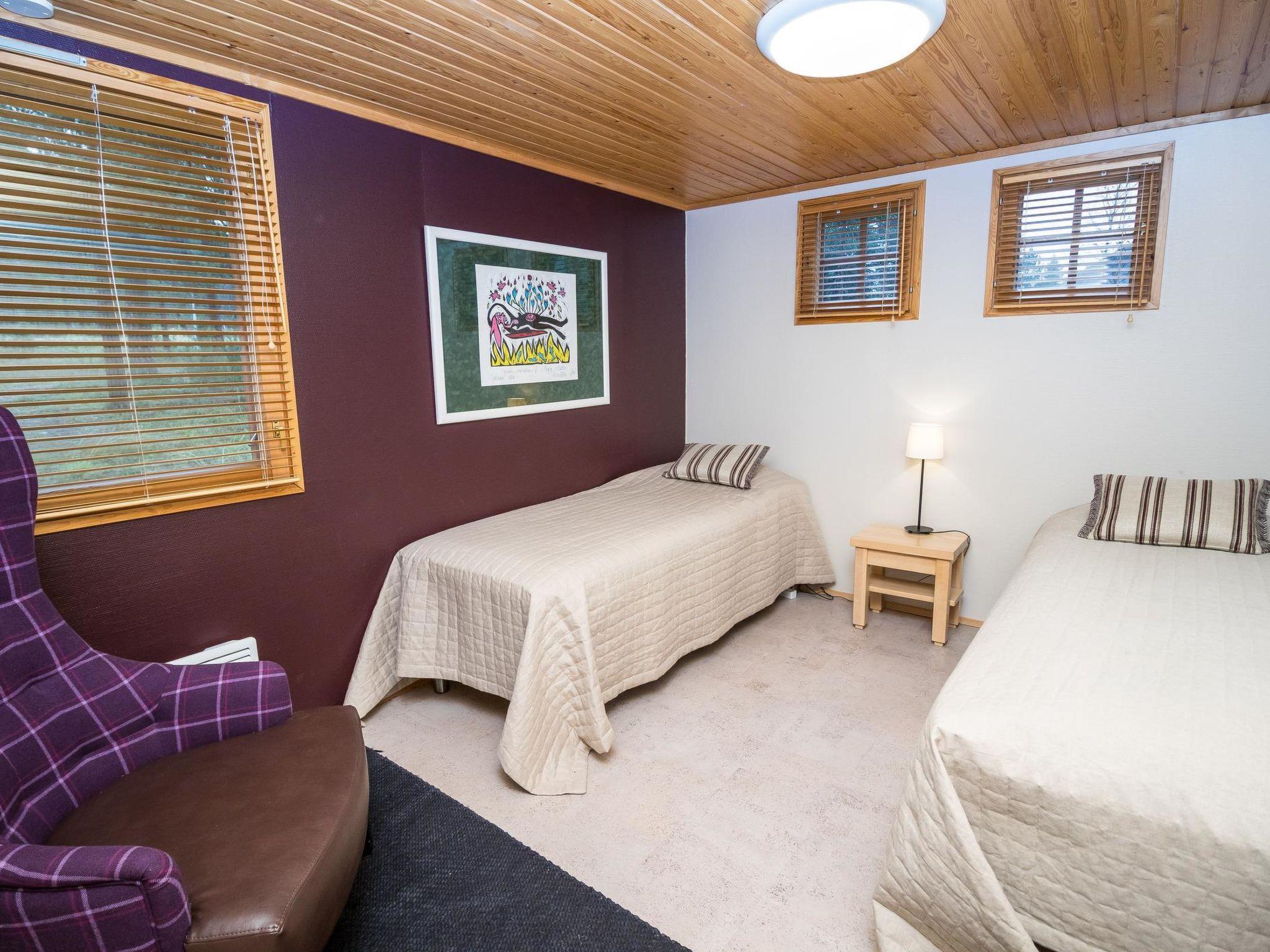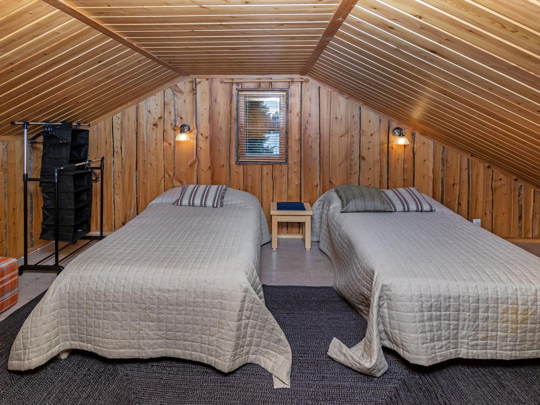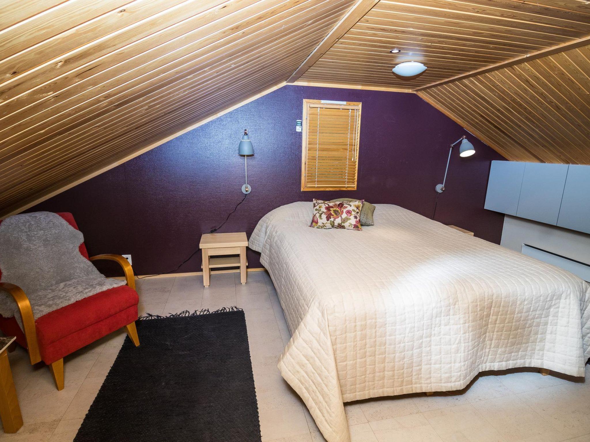 On the upper floor, there is a bedroom with two 80 cm wide beds and own WC. Another bedroom features two 110 cm wide beds and a TV. Additionally, the loft features a cozy living area. The upper floor area is approximately 70 m².