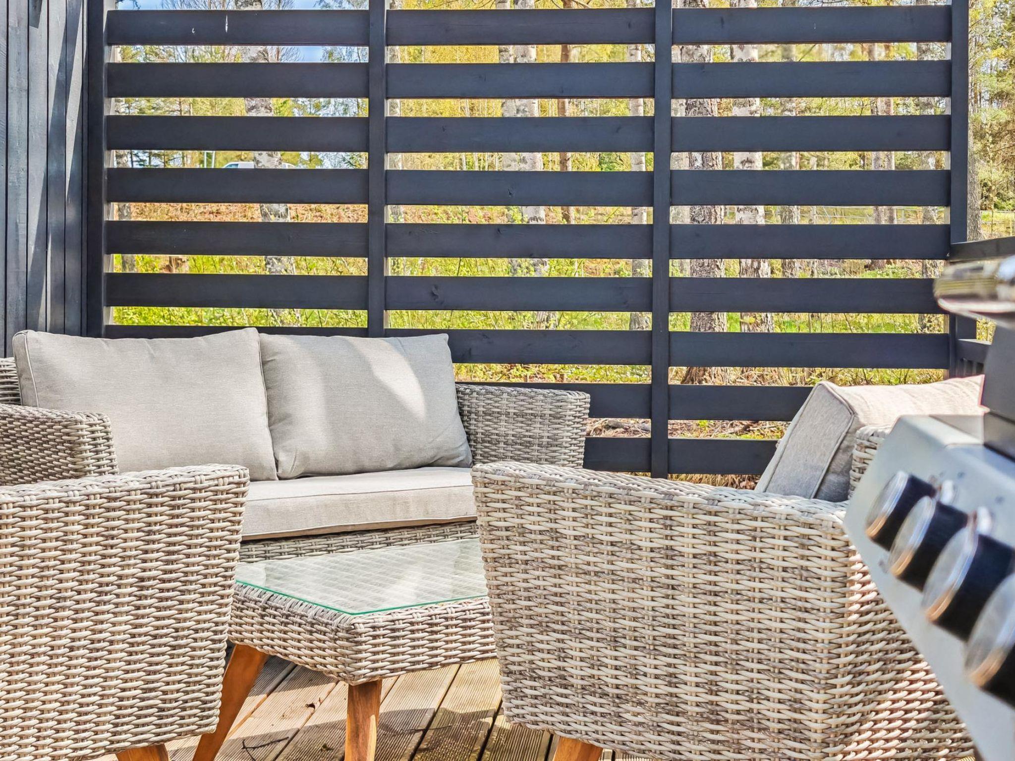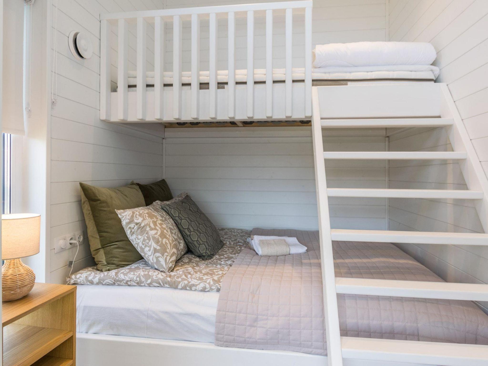 The villa has a unified living room and open-plan kitchen, with access to a spacious terrace. It features an air source heat pump, a bedroom with a bunk bed (lower bed 140x200 cm, upper bed 90x200 cm), and a low loft with two beds. The loft can be accessed via a movable ladder. The bathroom has a shower, WC, and washing machine (the villa does not have its own sauna). The spacious terrace is furnished with high-quality garden furniture, a gas grill, and a sunshade.