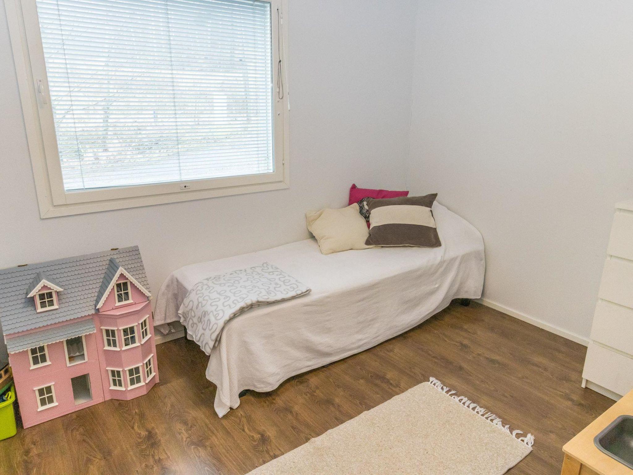 The lower floor includes a spacious living area with a fireplace and direct access to the backyard, a bathroom with WC, an electric sauna, a utility room, and one bedroom with a fixed double bed. The beach area consists of a 20-meter stretch of sandy, gently sloping shoreline that transitions into a soft-bottomed, deeper section.