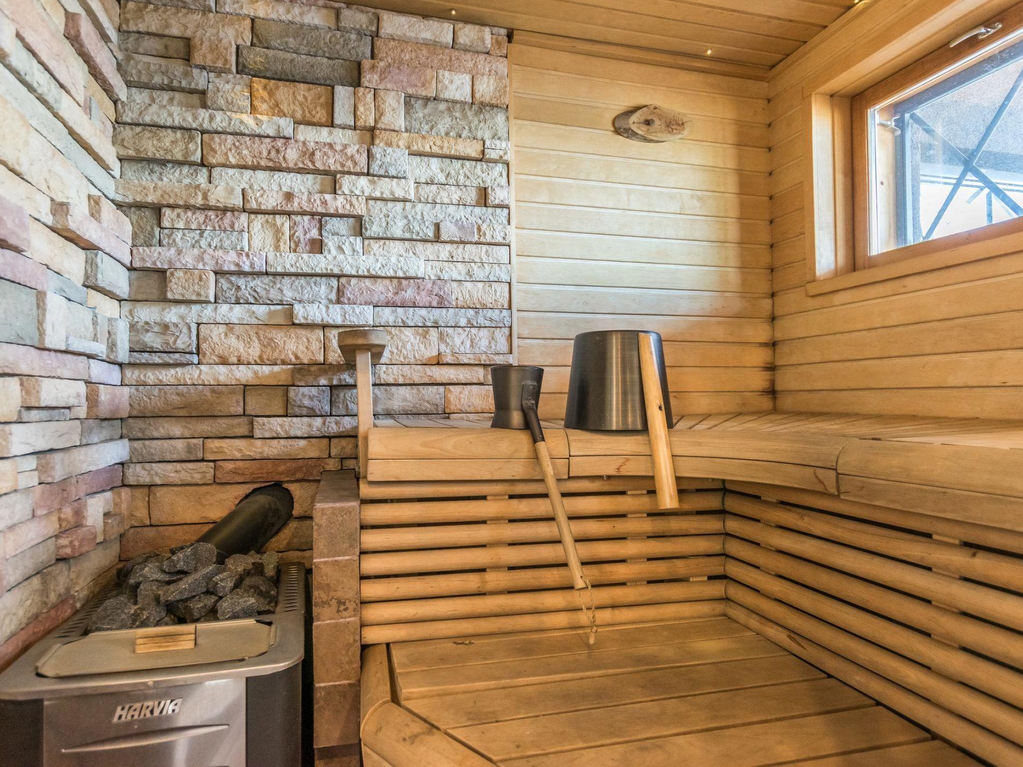 The sauna features a wood-burning stove, and the washroom has a shower, a WC, and a washing machine. A door opens to the terrace, furnished with ample seating, a sofa, and the hot tub.