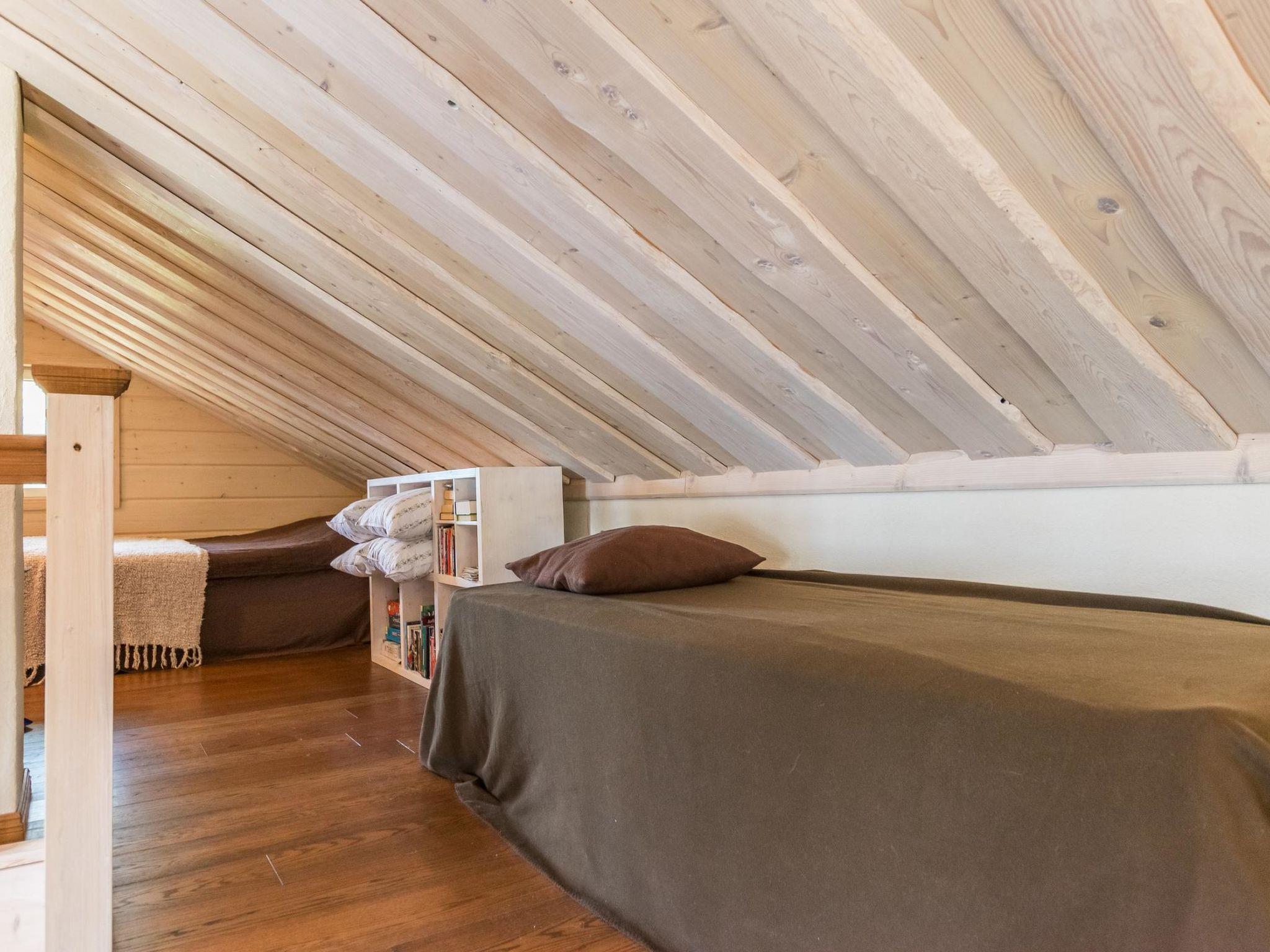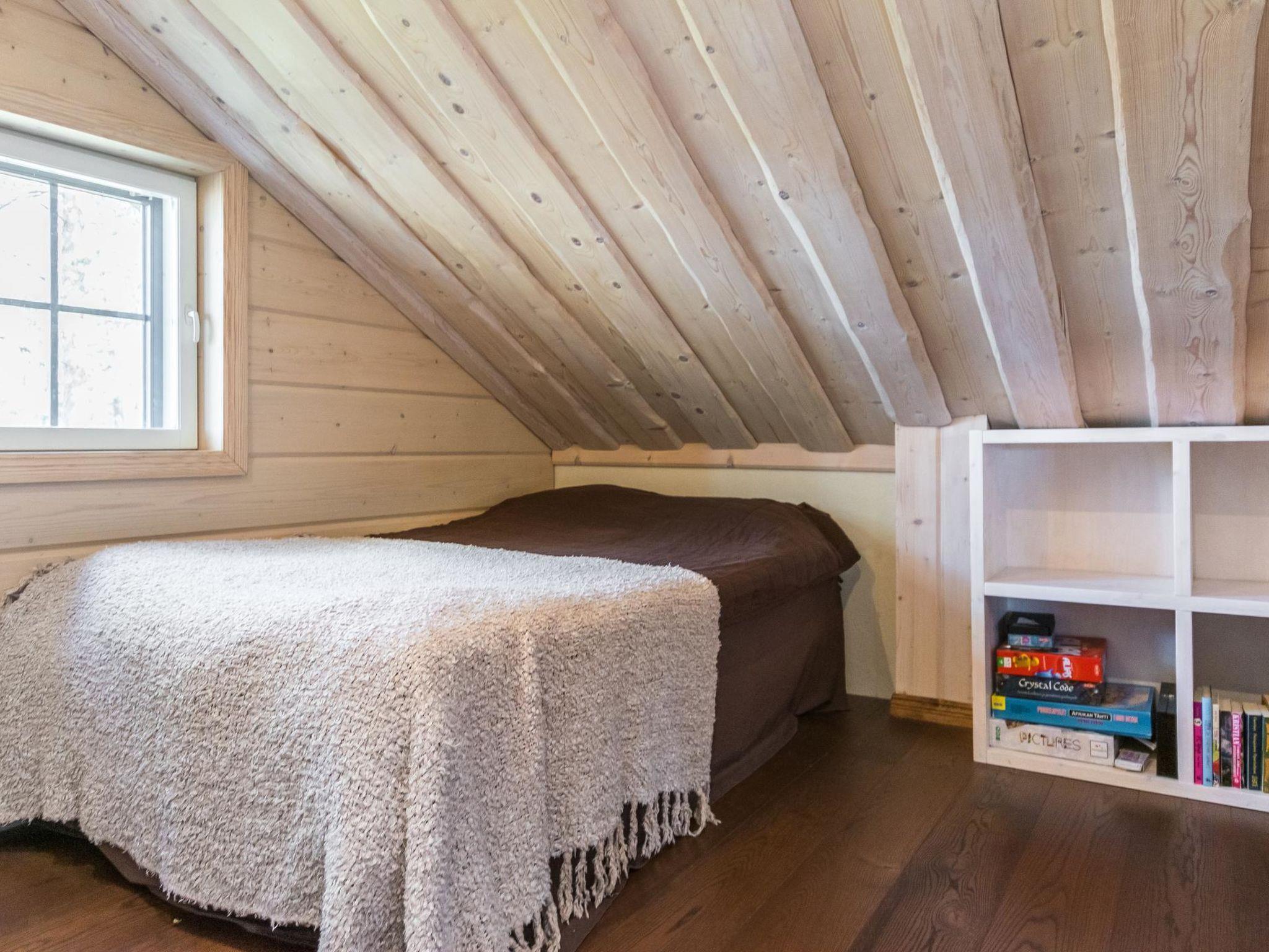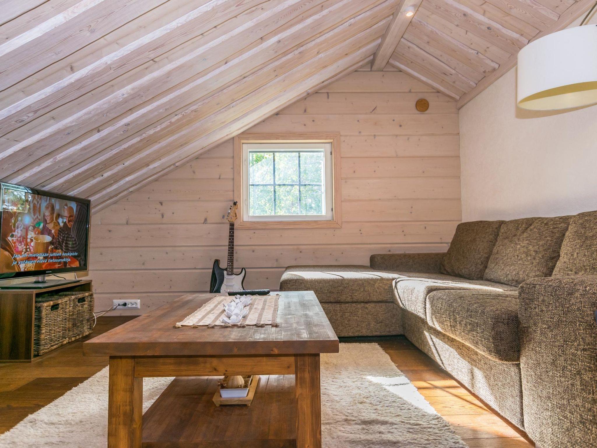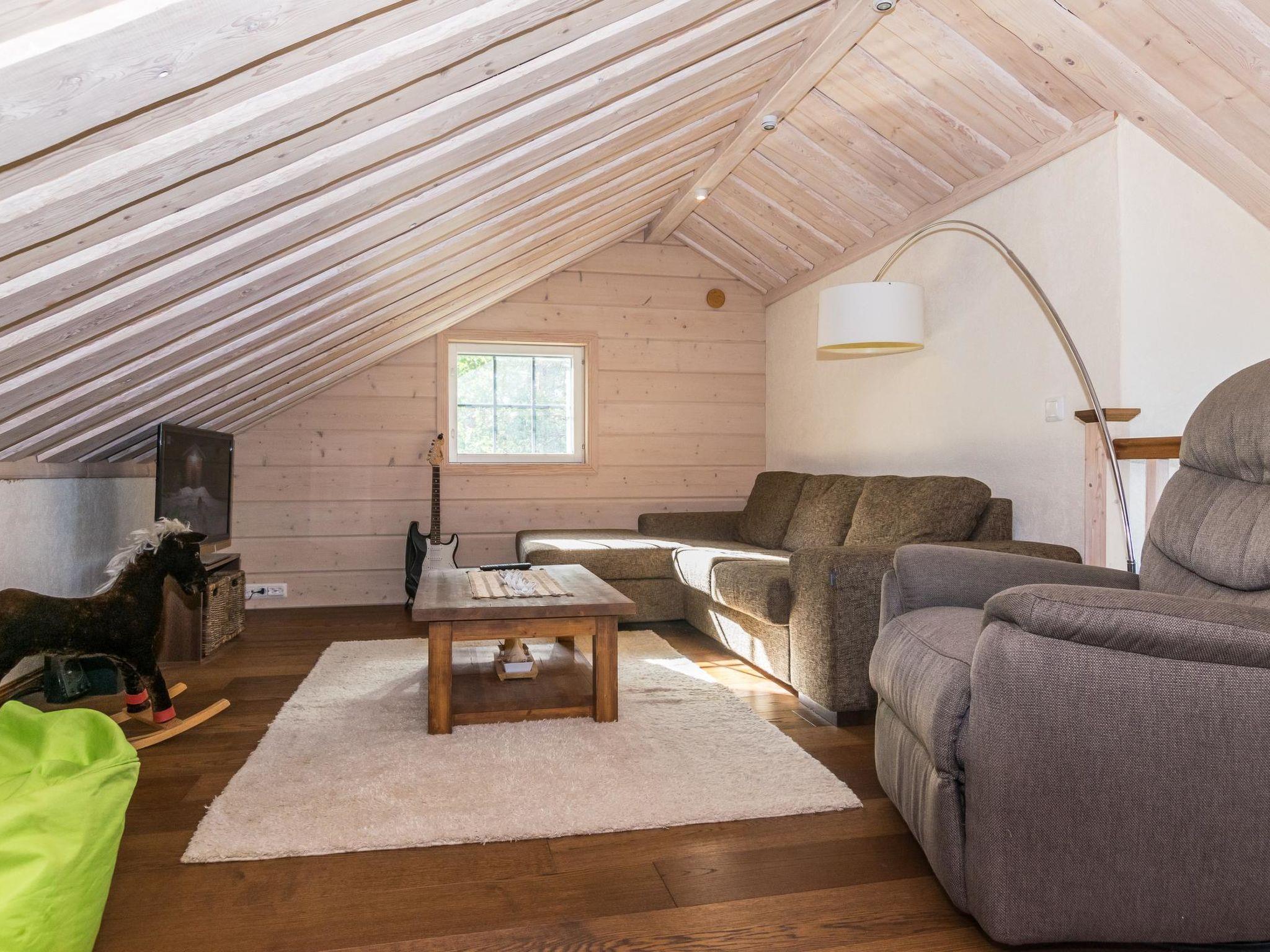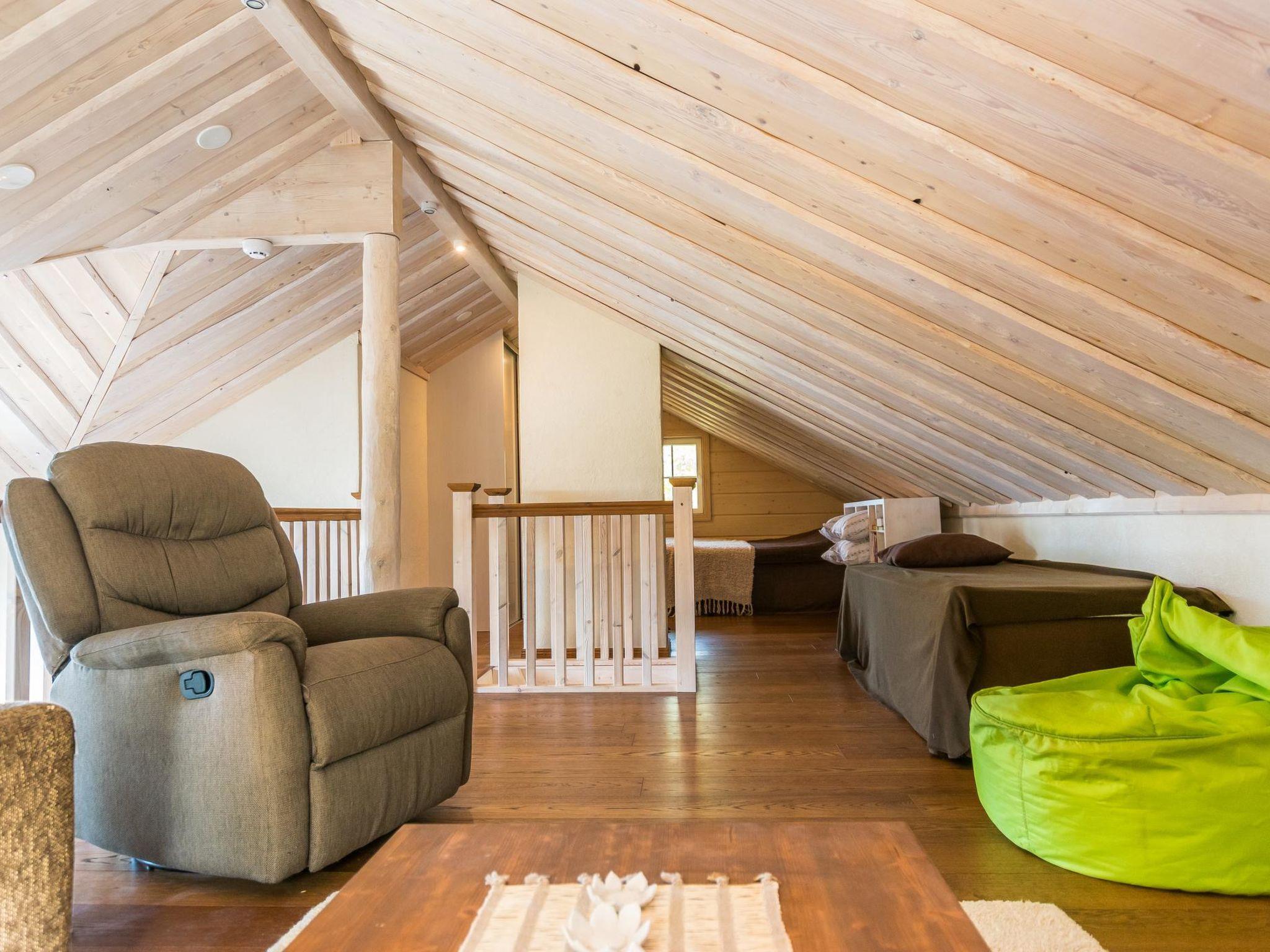 The upper floor has two beds (120 x 200 cm and 80 x 200 cm). The upper floor also includes a cozy lounge area with a sofa, armchair, and TV. The stairs to the upper level are quite steep. The cabin has internet access via Wi-Fi.