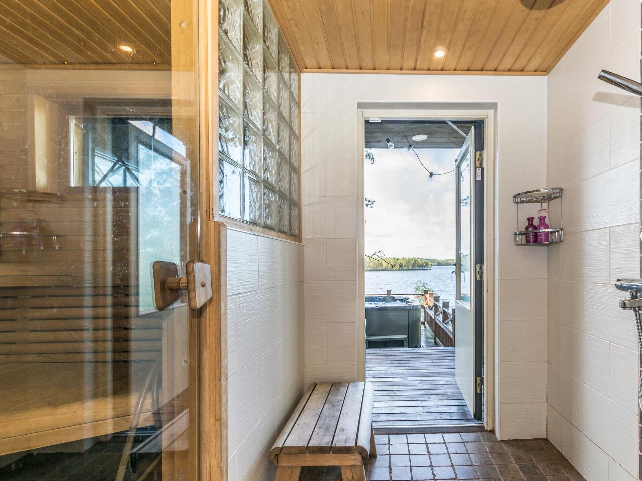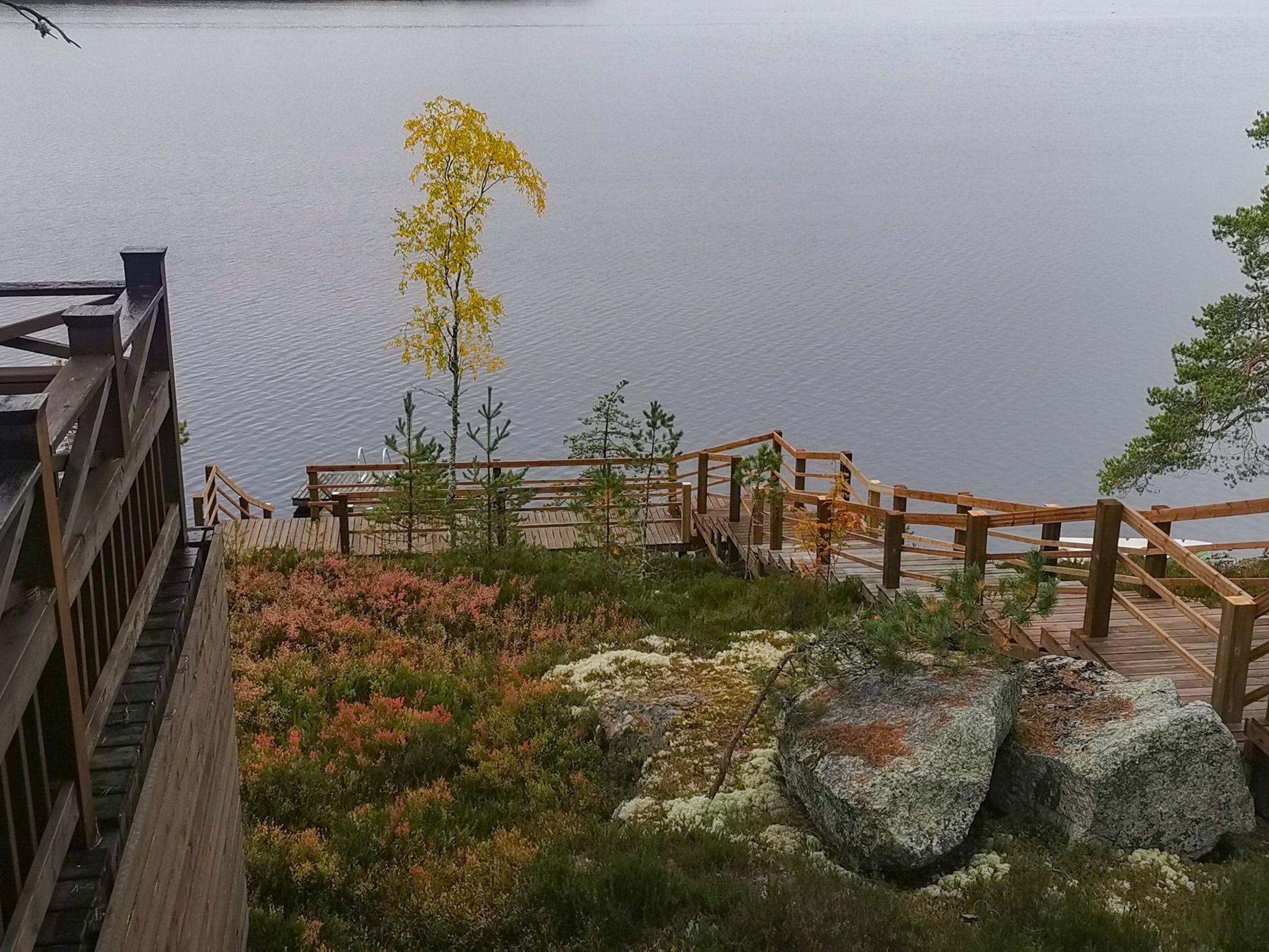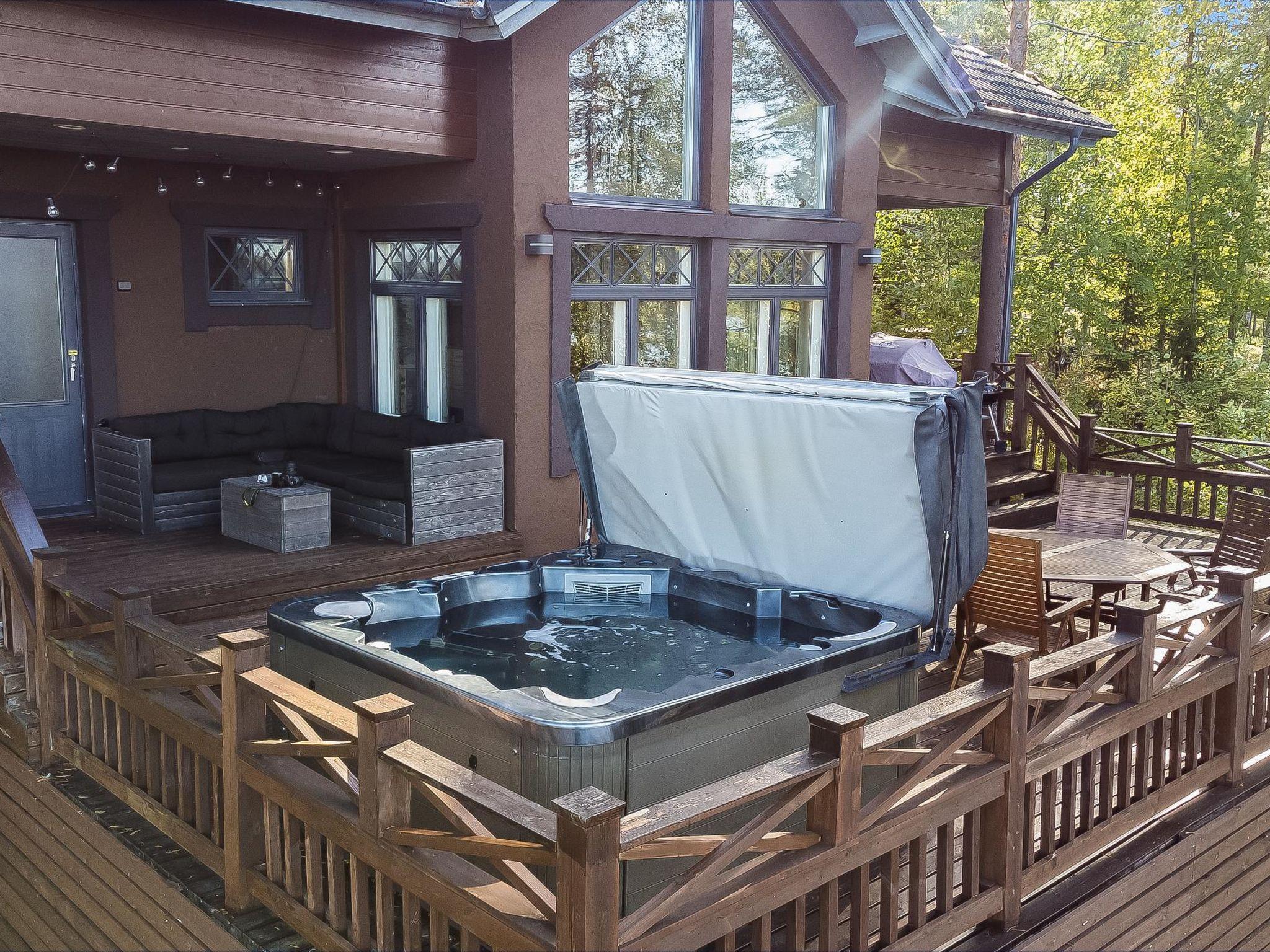 The spacious terrace of the cabin offers a stunning view of the lake. There is a large outdoor hot tub available for rent on the terrace. From the hot tub, you can enjoy the beautiful lake scenery at different times of the day. It’s just a few steps from the hot tub to the washroom and sauna. The rocky beach and the lake are beautiful in every season. Pets are welcome at the cabin.
