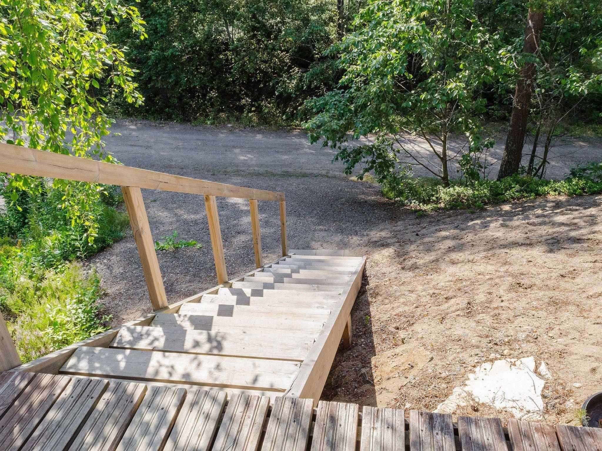 The scenic terrace has garden furniture and a ski storage area. From the parking area, there are stairs leading to the cabin.