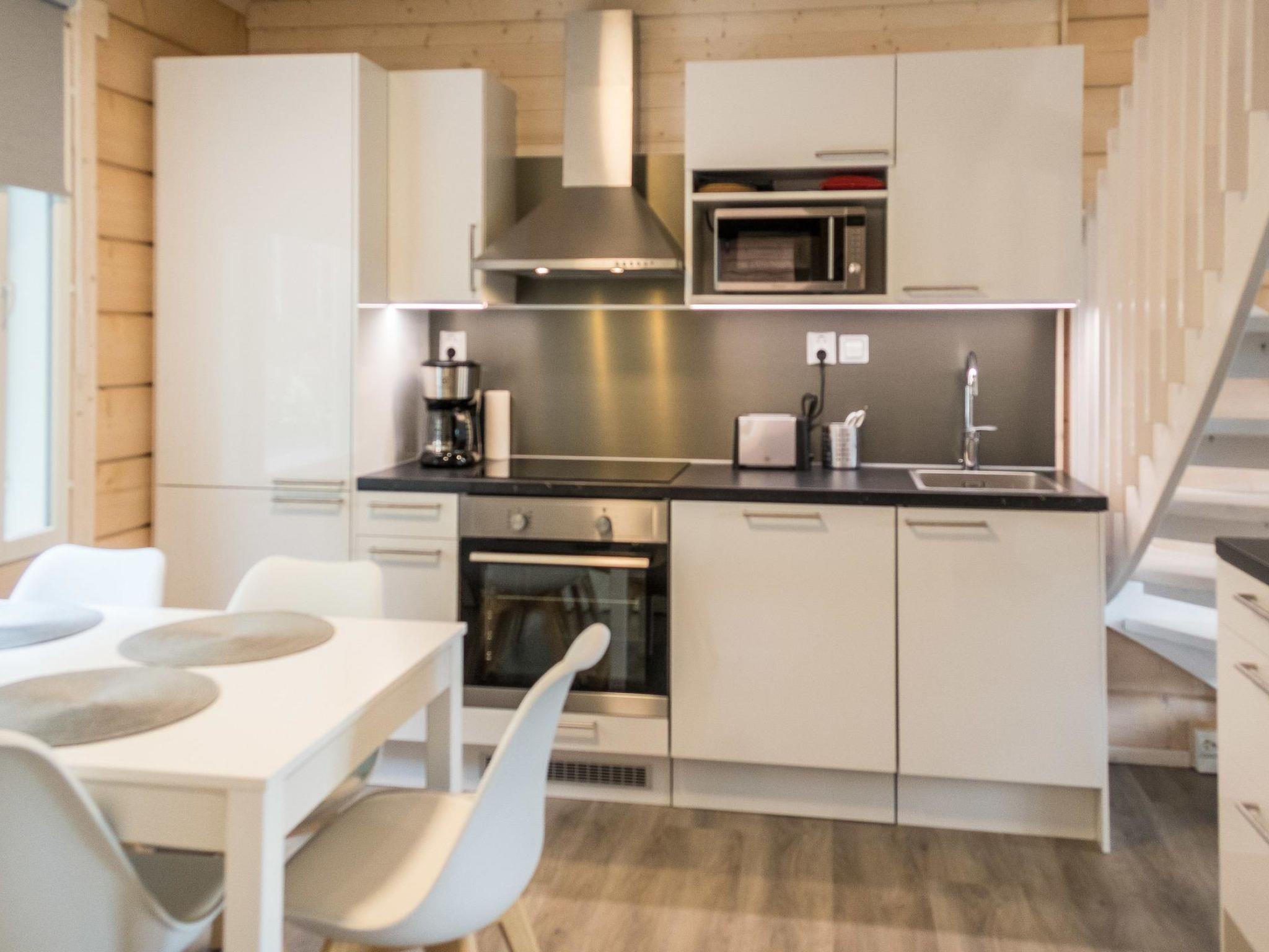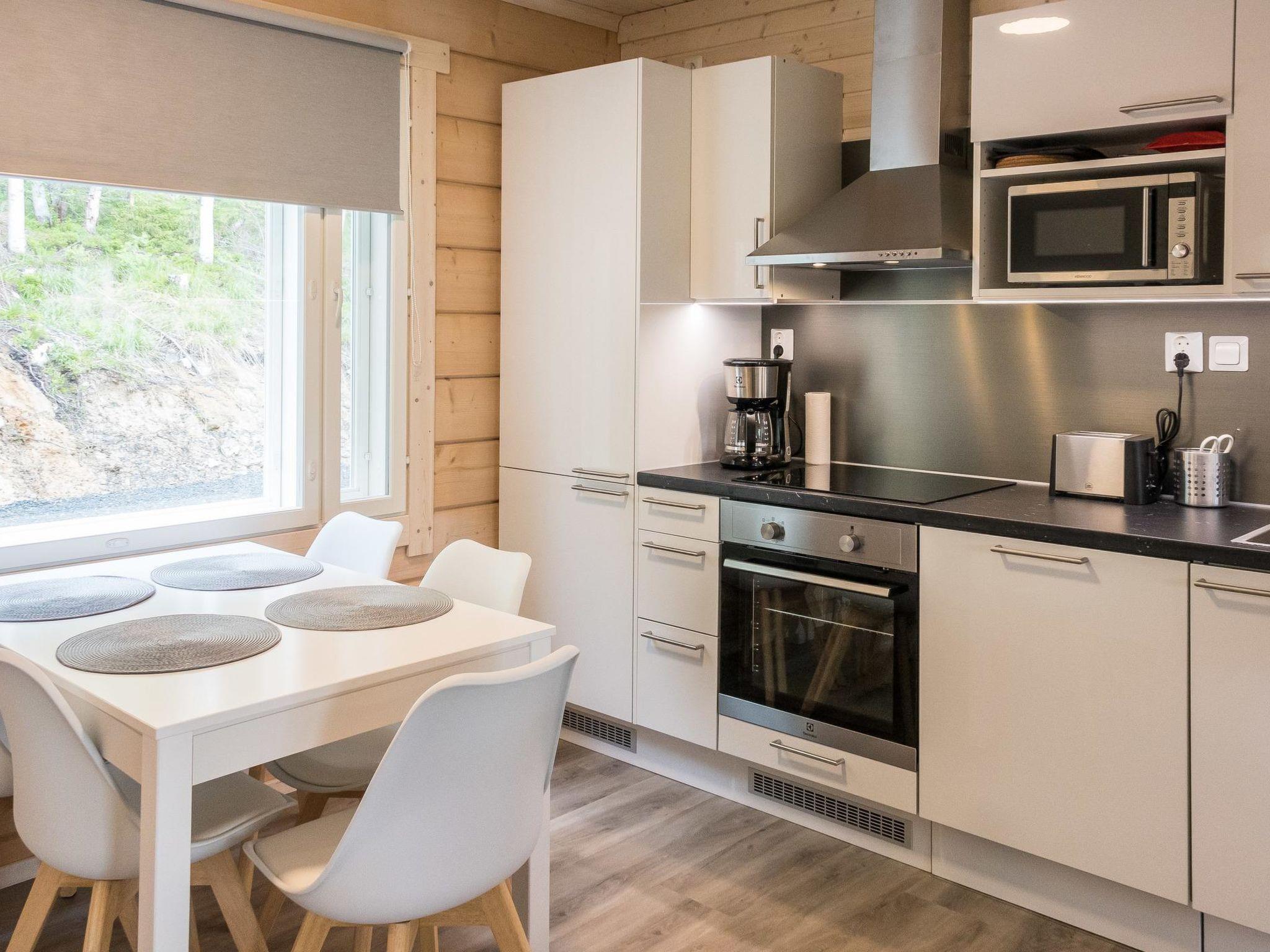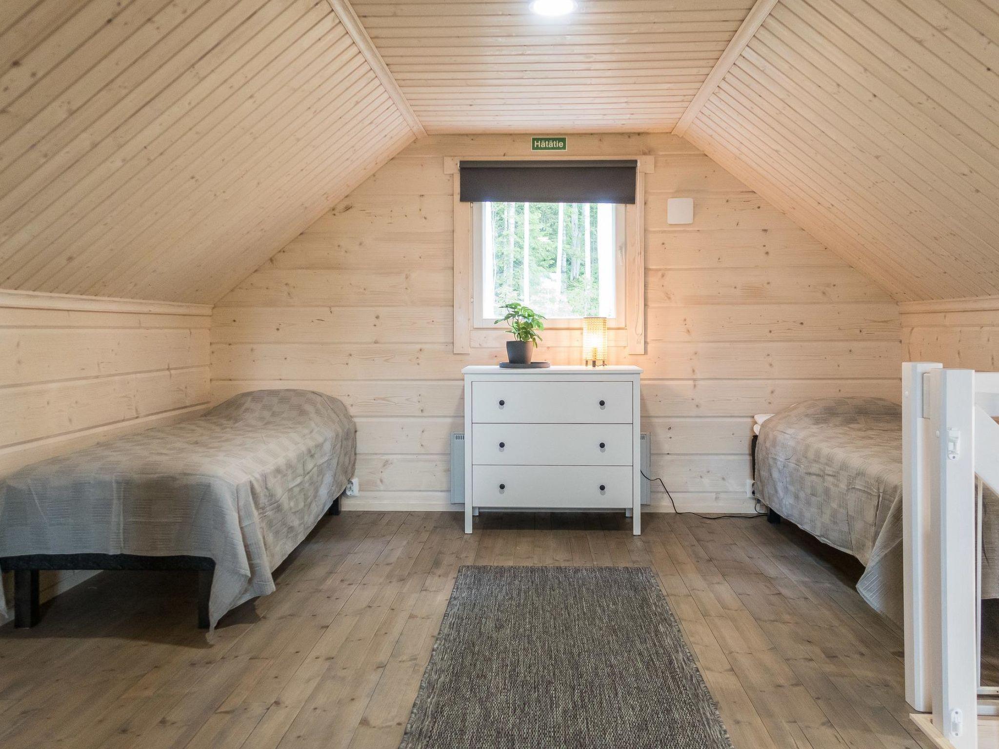 The living area of the cabin is 66 m², including the loft. Living room/kitchen, dining group for 5, heat storing fireplace. On the ground floor, bedroom with double bed, 3 x 80 cm wide beds in the loft. Washroom/WC, sauna (electric sauna stove).