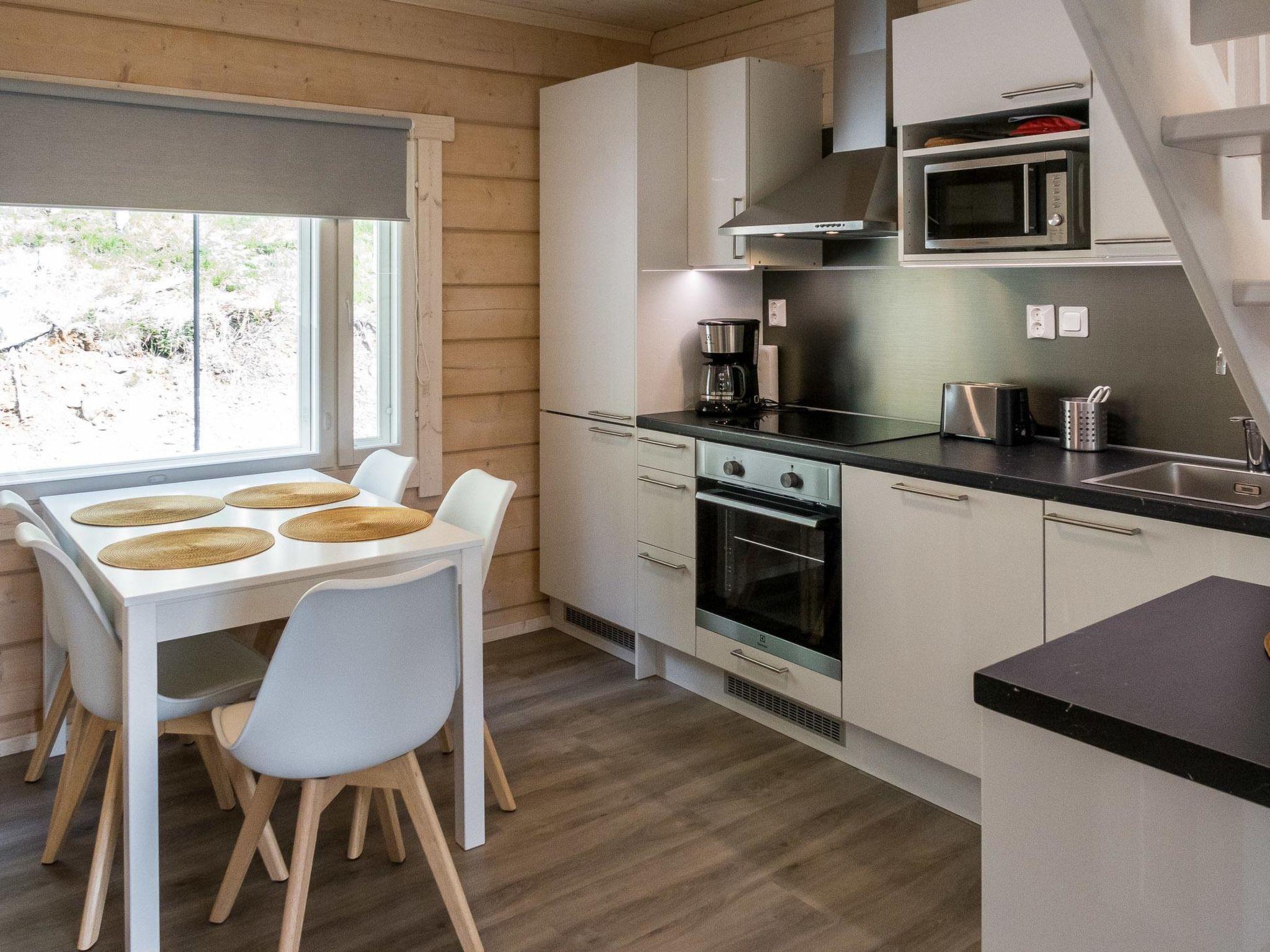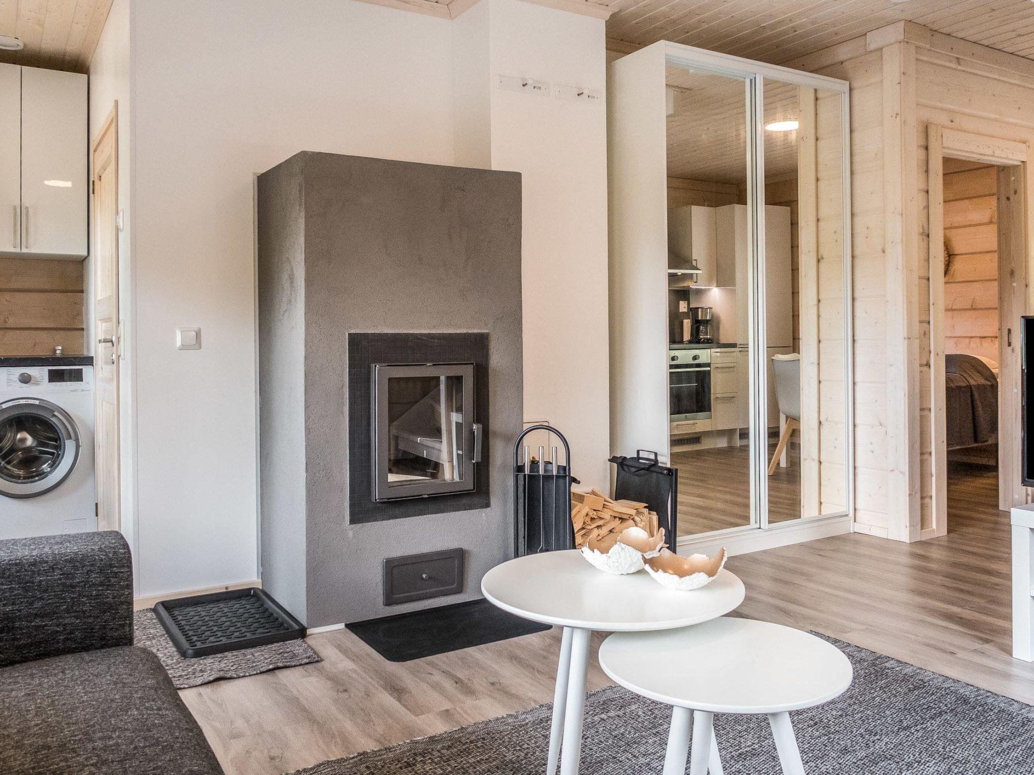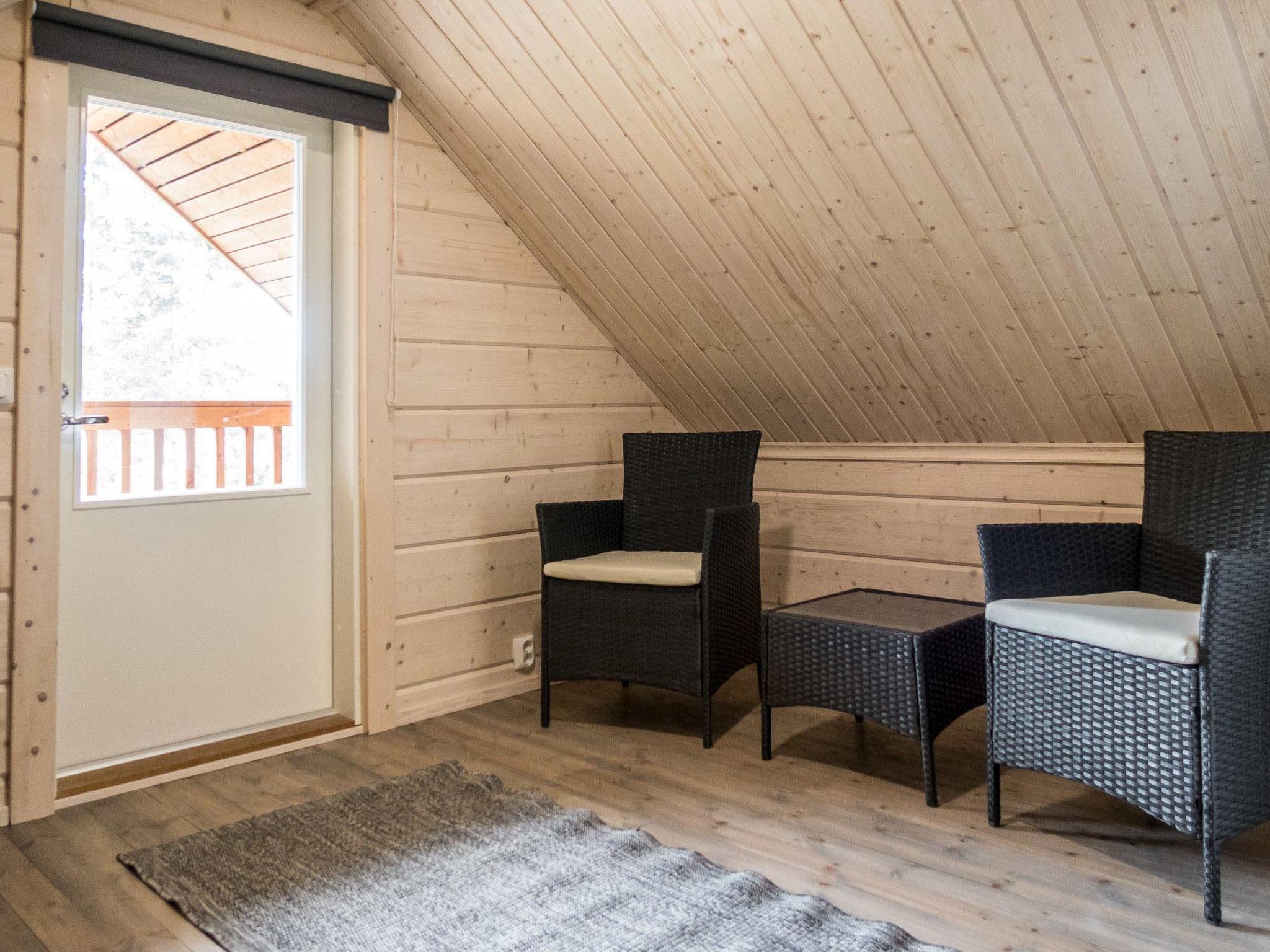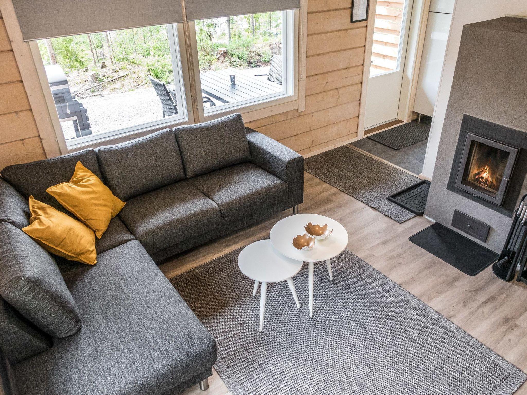 The living area of the cabin is 59 m², including the loft. Living room/kitchen, dining group for 5, heat storing fireplace. On the ground floor, bedroom with double bed, 3 x 80 cm wide beds in the loft. Washroom/WC, wood-burning sauna stove in the sauna.