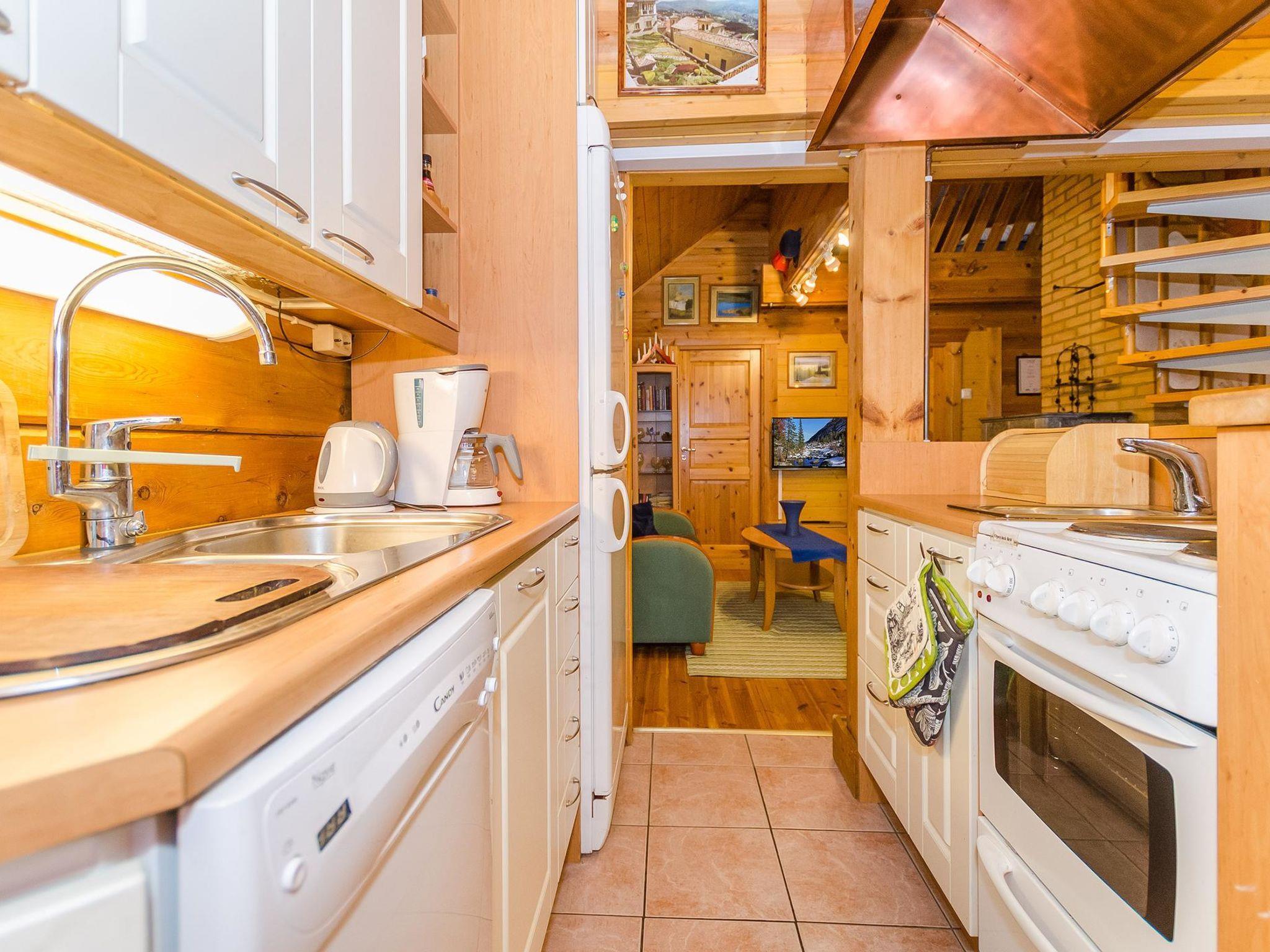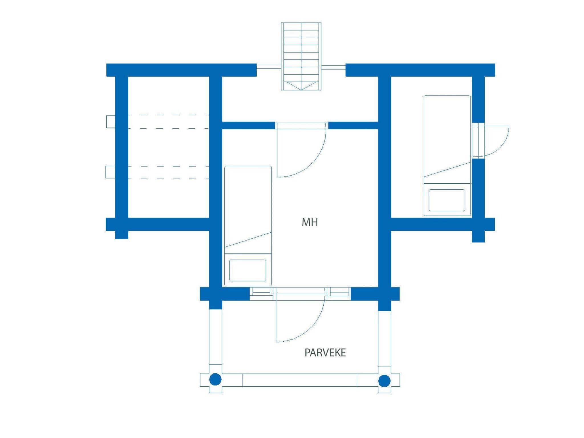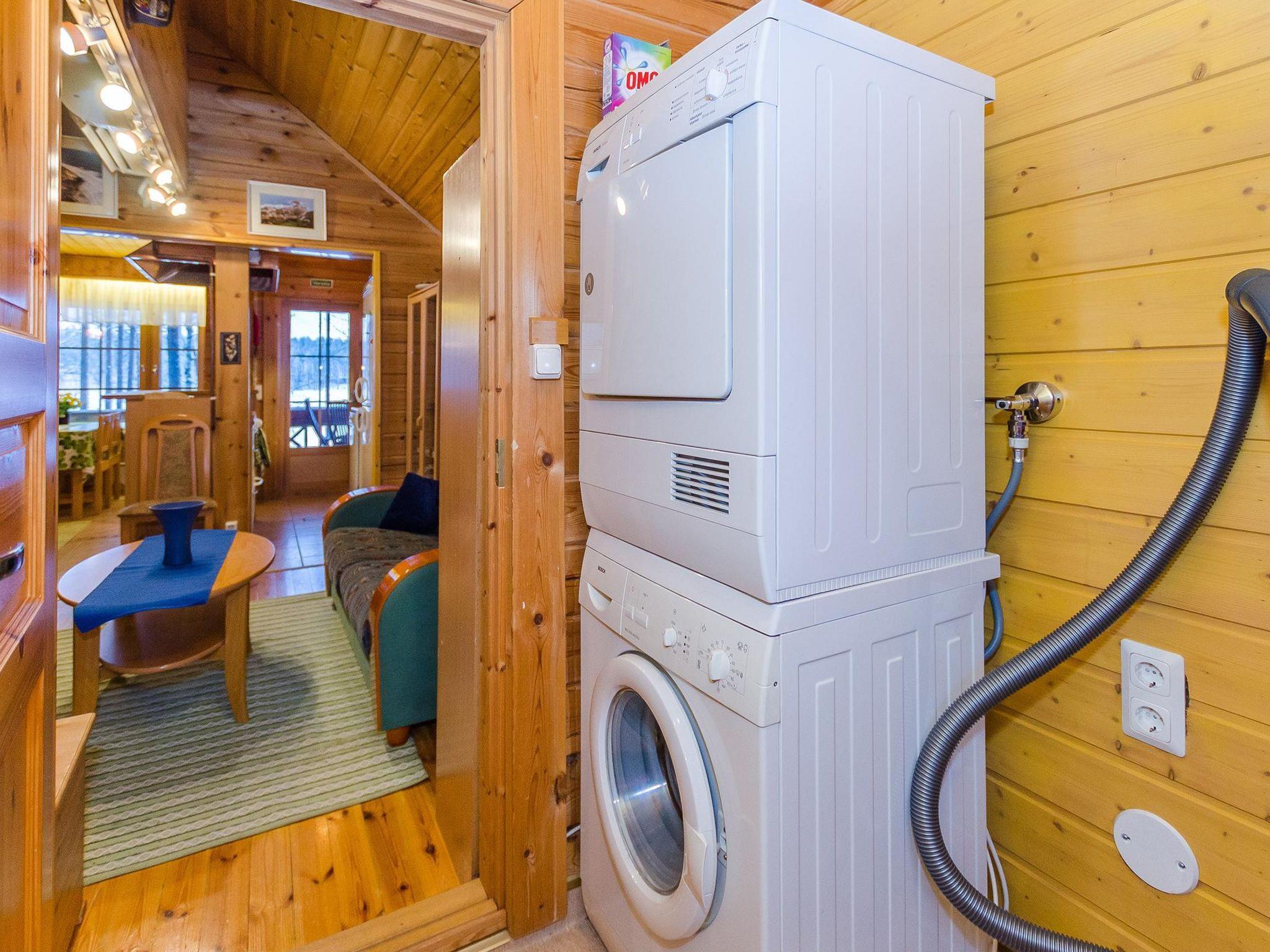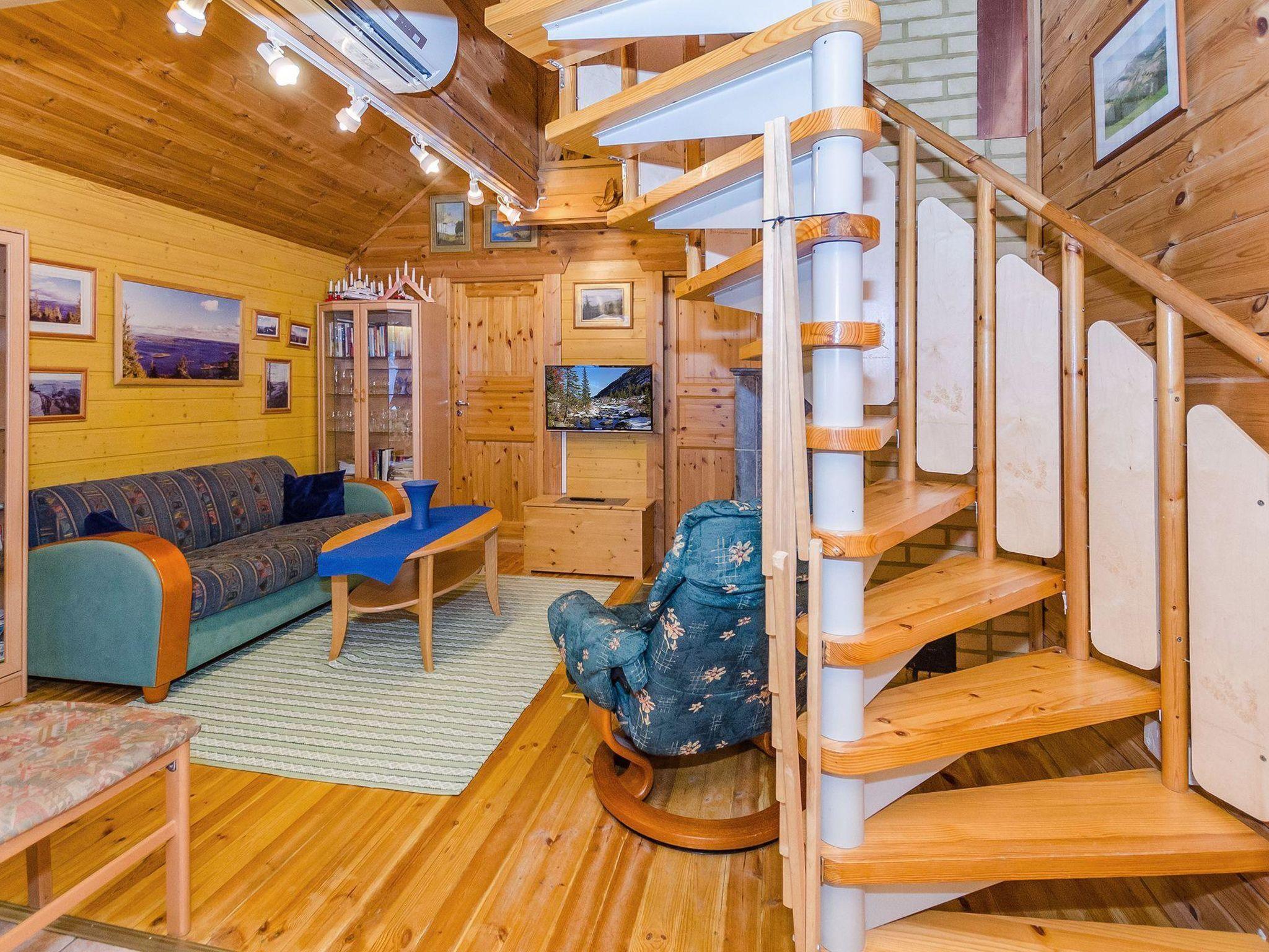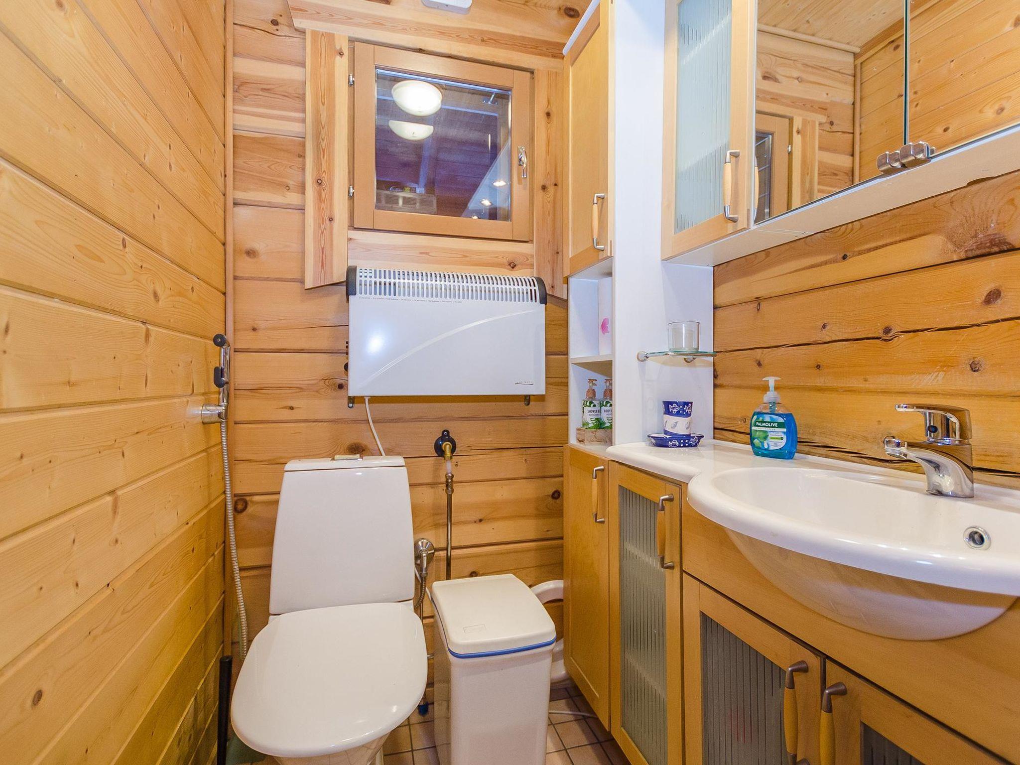 Log cabin 1992, extended in 2000. Living room/kitchen with sofa bed, bedroom with double bed, on the upper floor bedroom (small and low door, height 125 cm) with 120 cm wide bed and sleeping alcove with 80 cm wide bed, low loft (room height 143 cm) with 2 mattresses. Separate stairs to the loft and upper floor. Wood-heated sauna washroom, terrace, balcony.