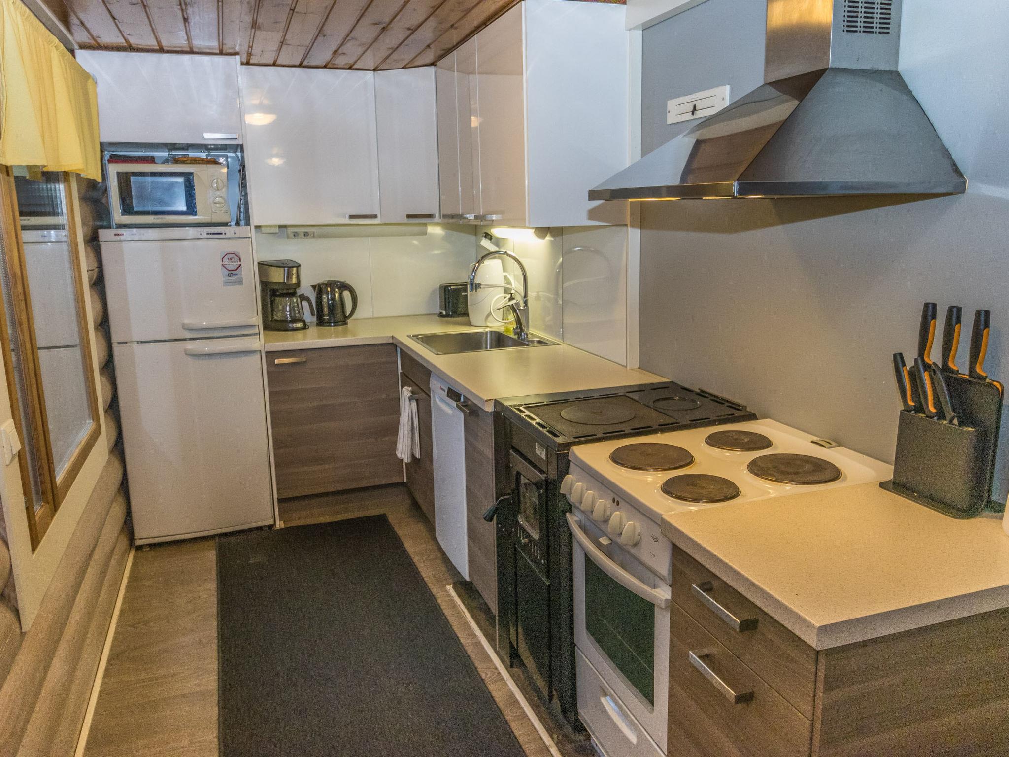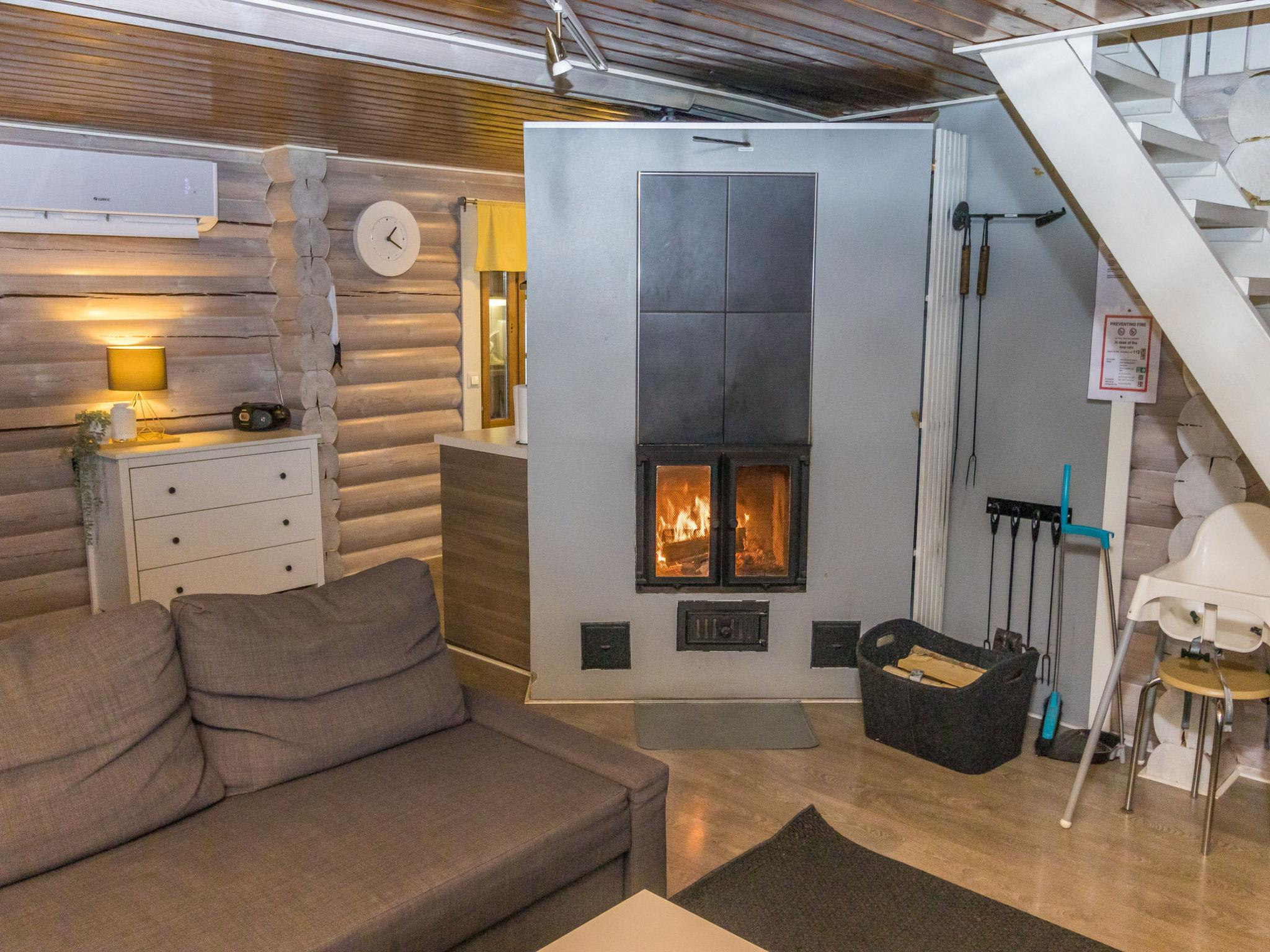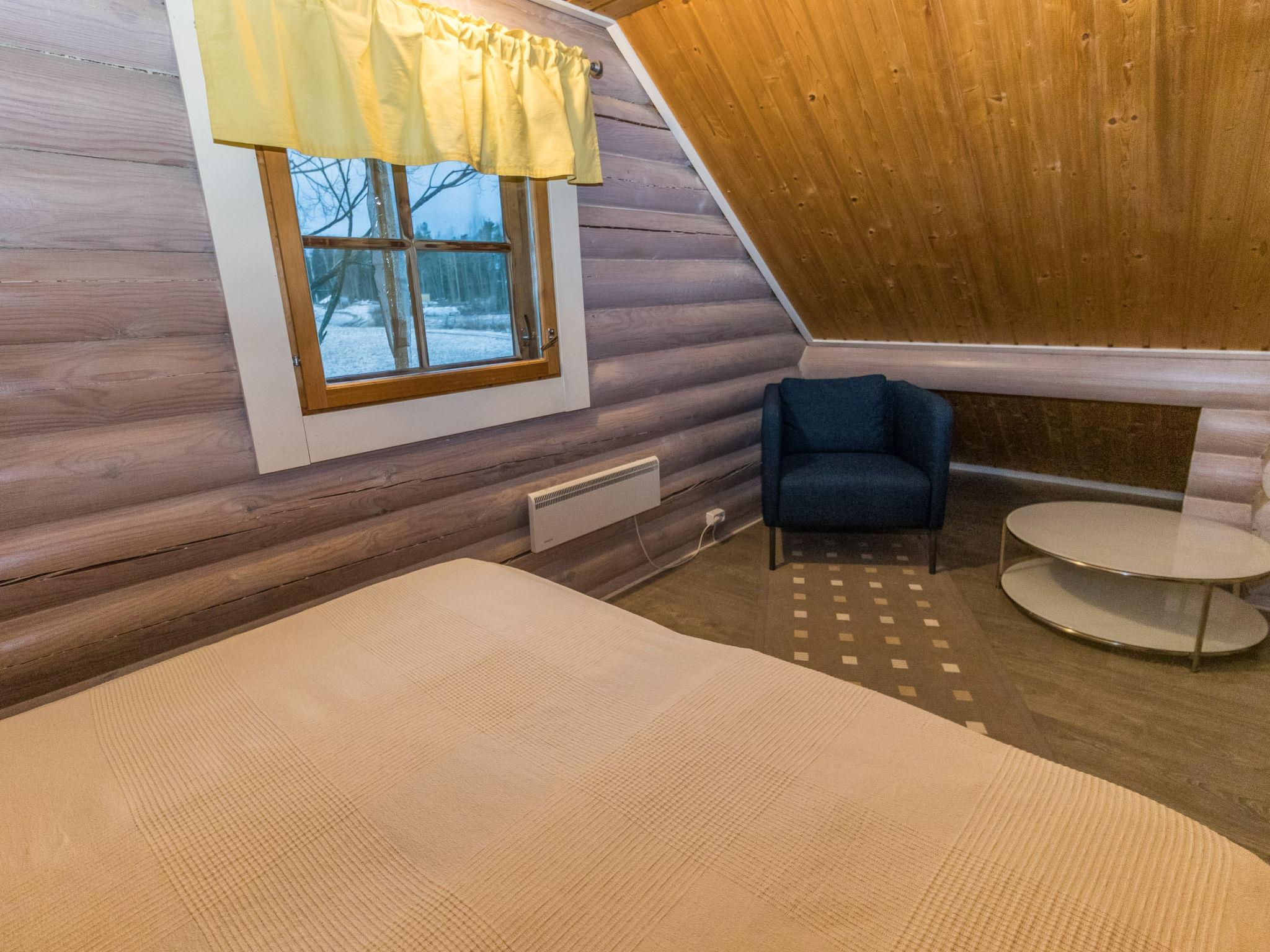 The ground floor features a cozy living area, a well-equipped kitchen, and a washroom with a WC and a traditional wood-heated sauna. On the upper floor, there is a bedroom with a double bed and its own balcony. The upstairs hall area includes another double bed and one single bed, making the cabin well-suited for larger groups as well.