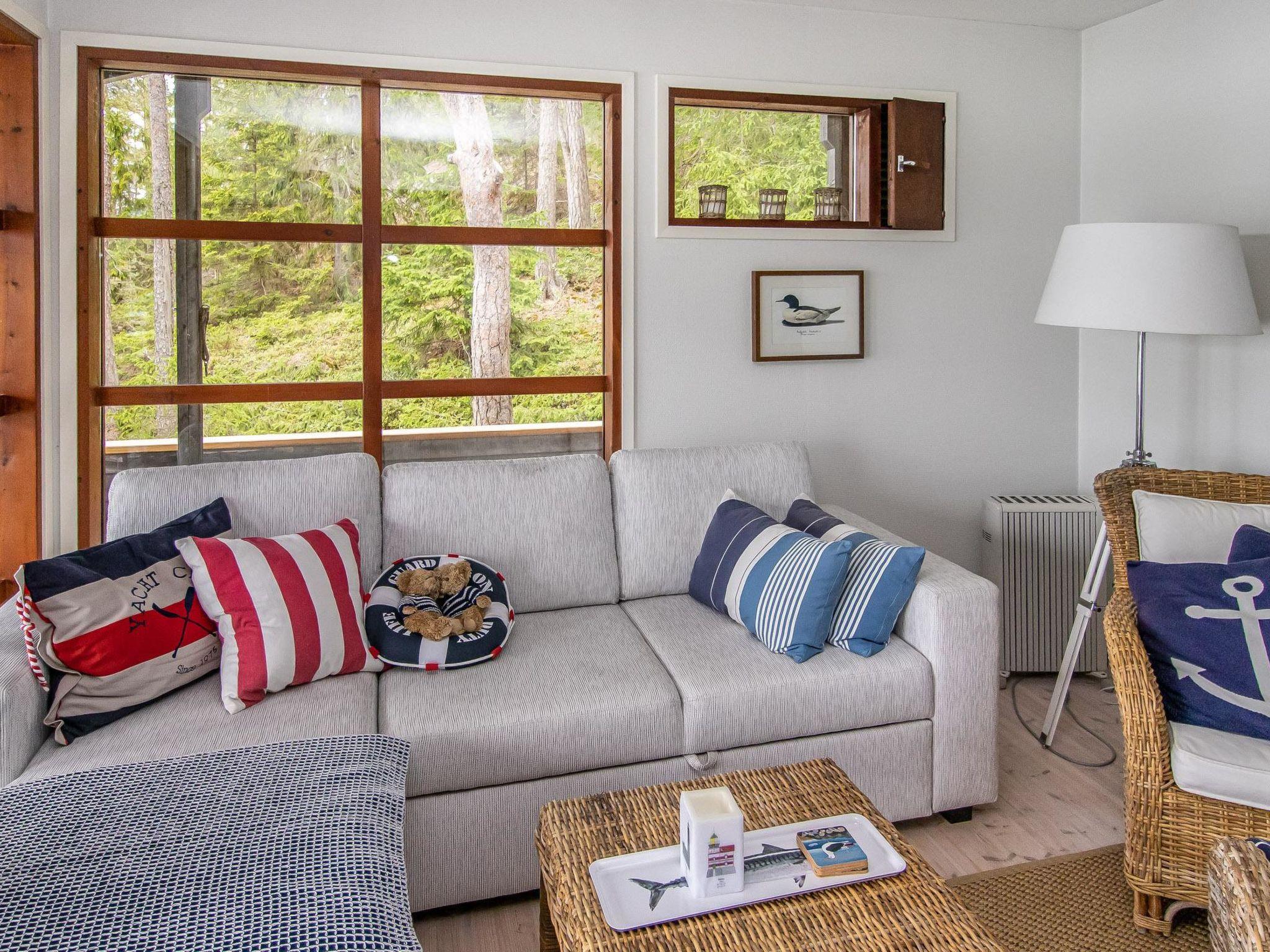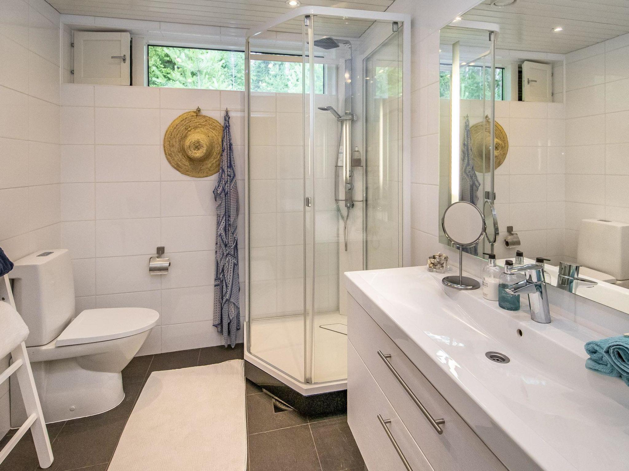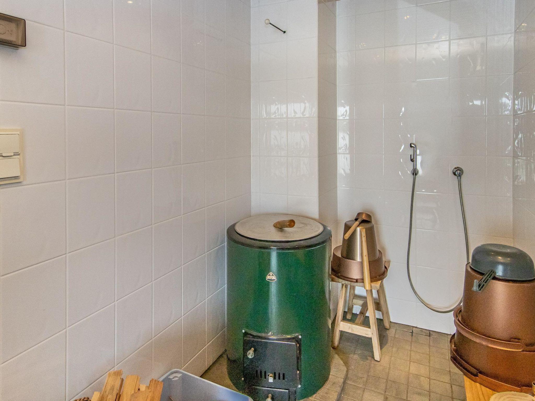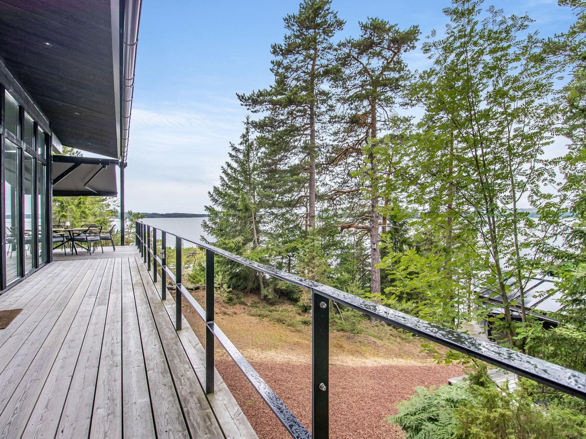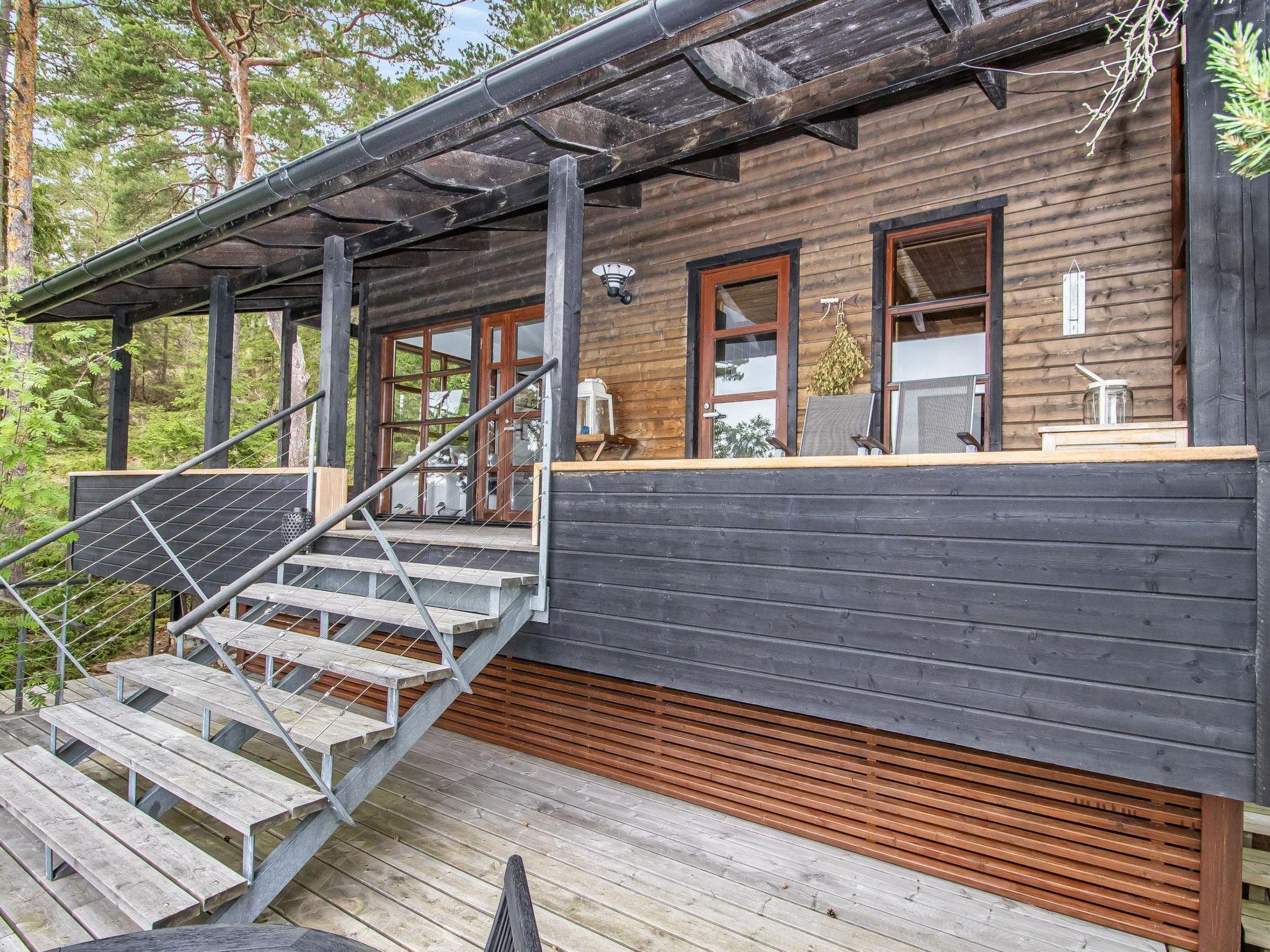 The partially covered terraces include an awning over the seating and dining area, along with a gas grill. The lakeside sauna building has a living area with a sofa bed (160cm), a wood-heated sauna, running water, and a heated water vessel for bathing. The sauna has its own furnished terrace facing the sea. The stairs to the rocky shore are quite steep. The best access to swimming is from the pier.