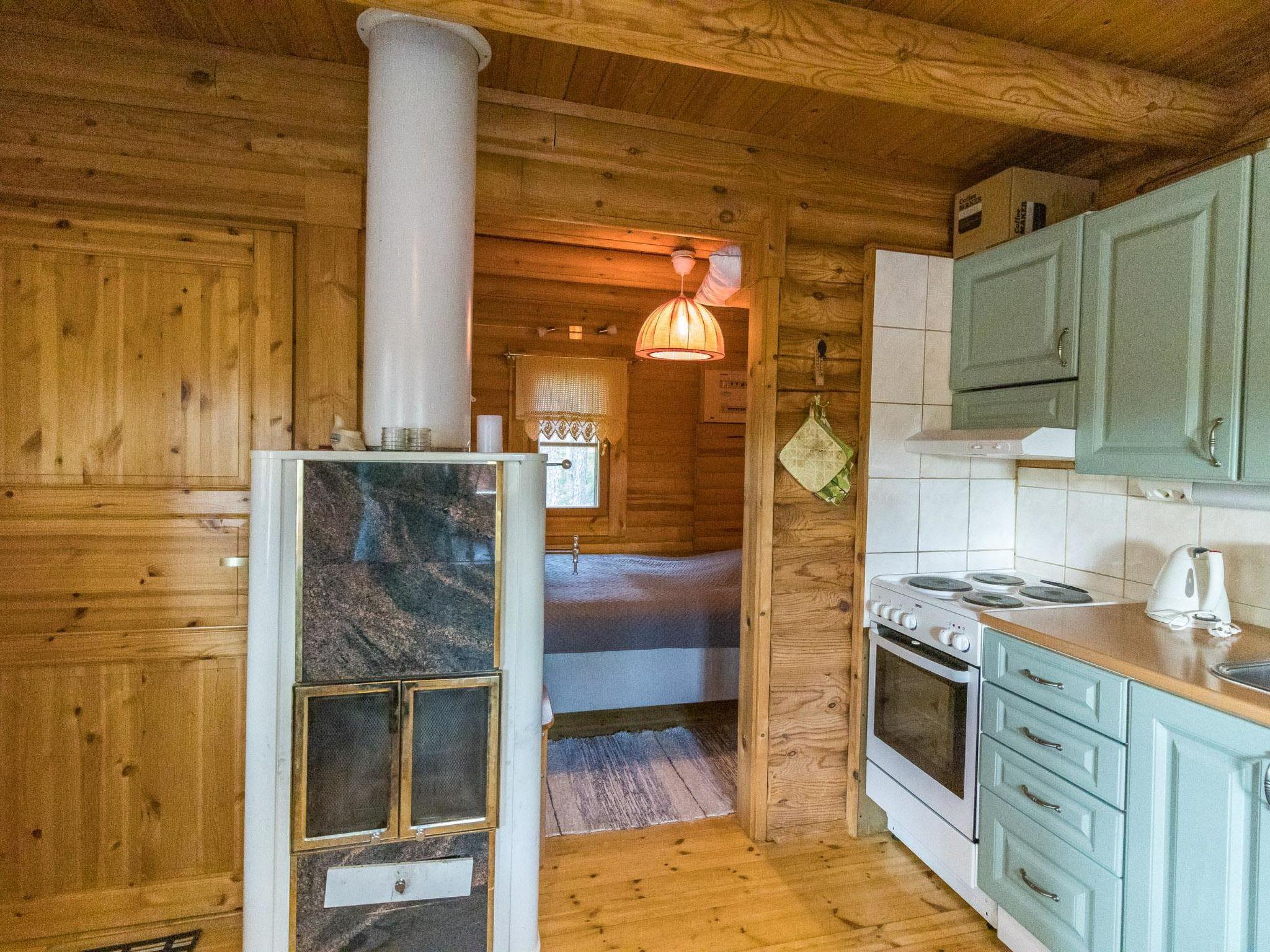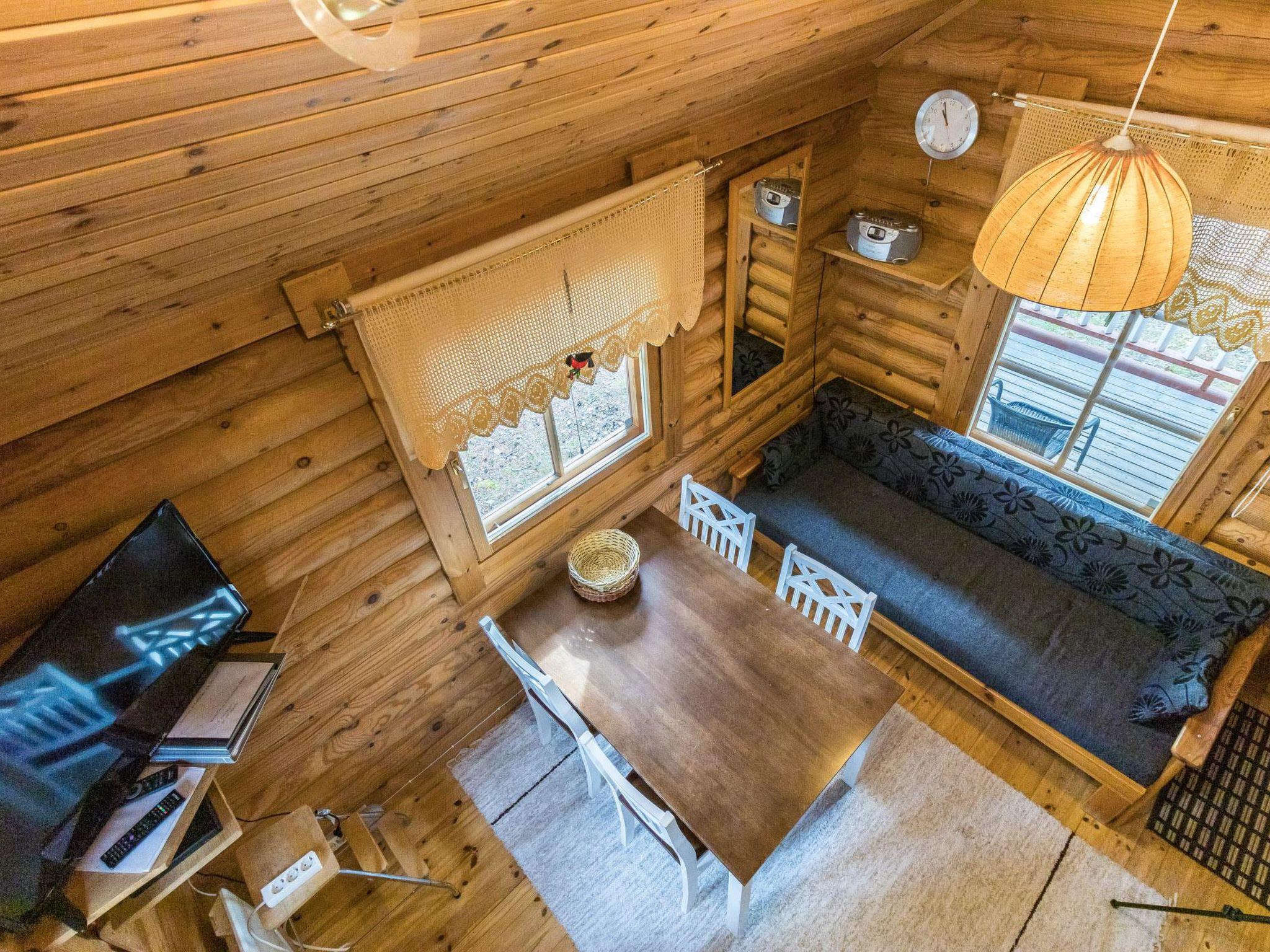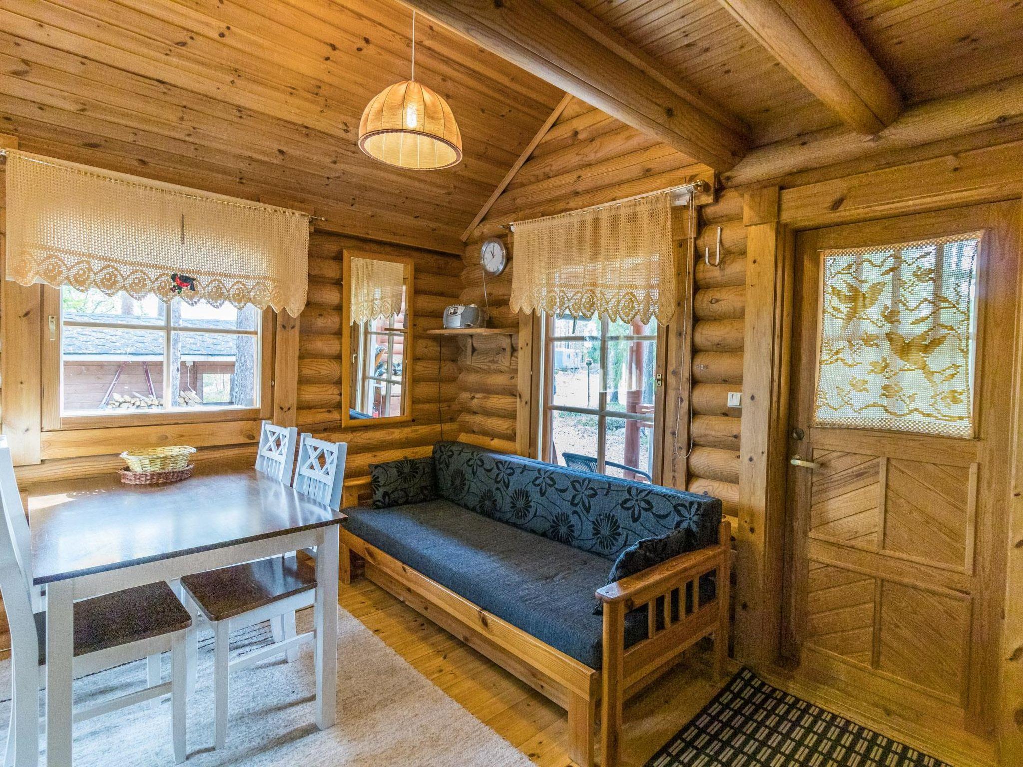 44 km north from Kemijärvi, round log cabin built in 2003. Downstairs kitchen/living room, alcove with 120cm wide bed, toilet, bathroom and sauna. Shallow loft with 2 mattresses. Steep stairs to the loft.