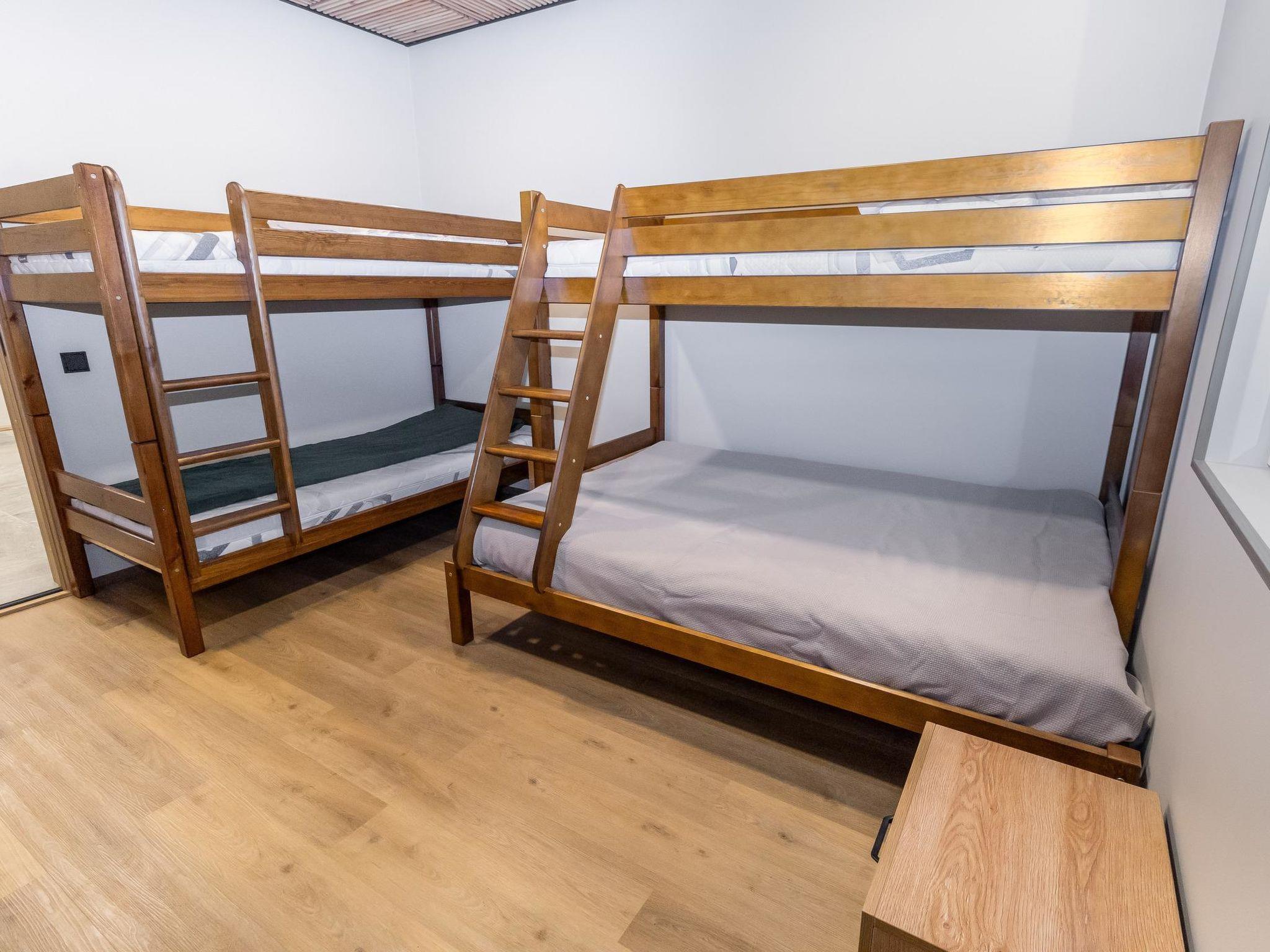 The villa has the following bedrooms: upstairs, there are three bedrooms, each with a double bed, and downstairs, there are two rooms – one with two bunk beds and the other with a double bed and a bunk bed. There’s enough privacy and space for everyone!