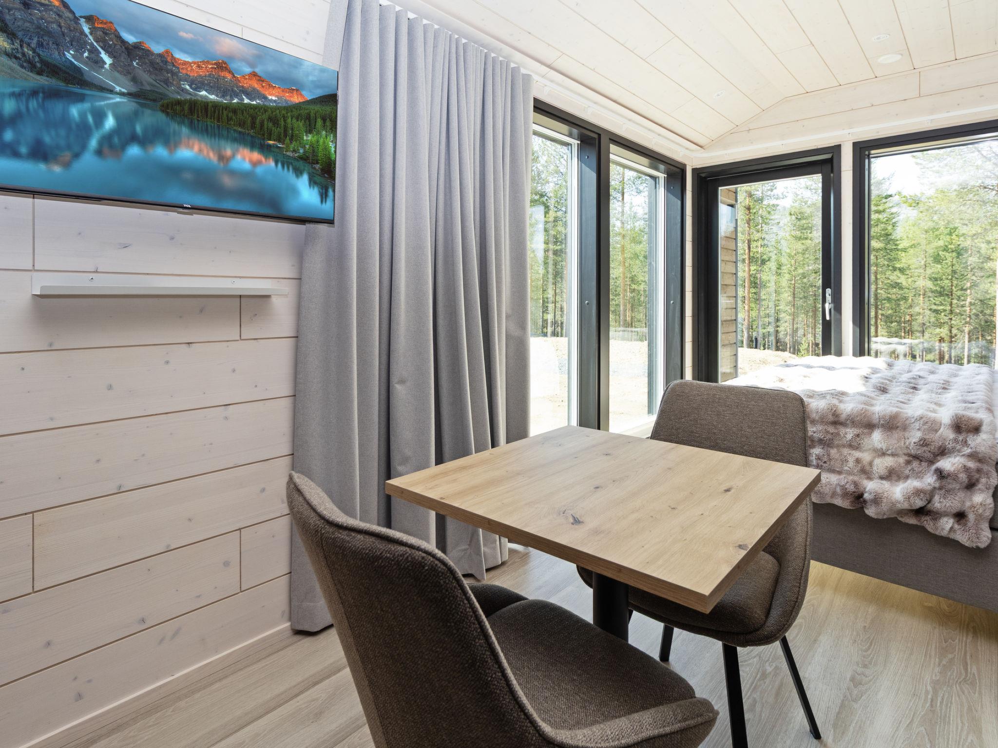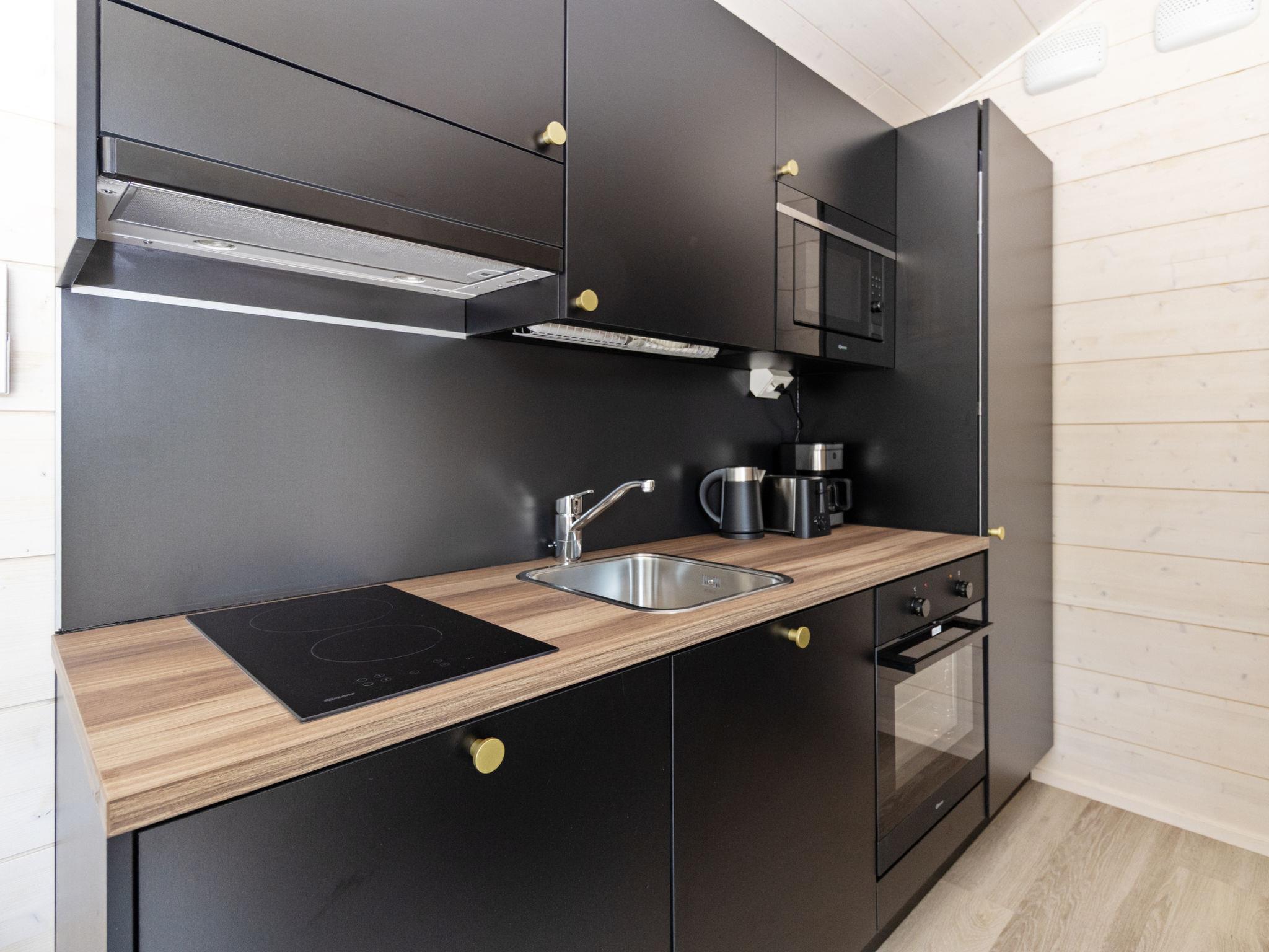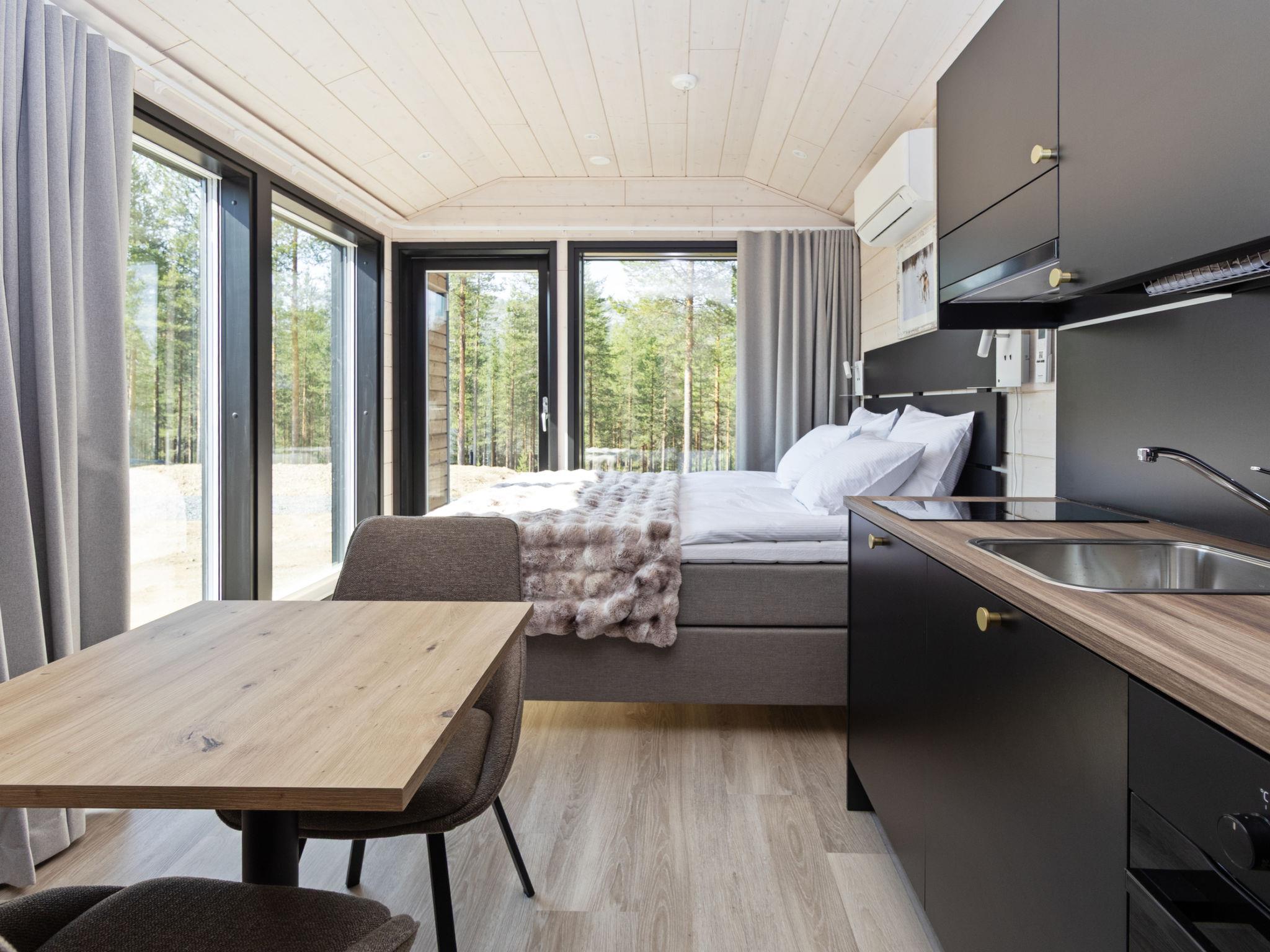 Built in 2025, the cabin has everything you need for a relaxing holiday. The combined living room/kitchen/sleeping area is practical and comfortable, and the bathroom includes a shower and WC. The sleeping area features a 160 cm wide bed for two. Large windows and a covered terrace bring the scenery into your stay. Heating is provided by underfloor heating and an air source heat pump, keeping the cabin comfortable in both winter's cold and summer heat.