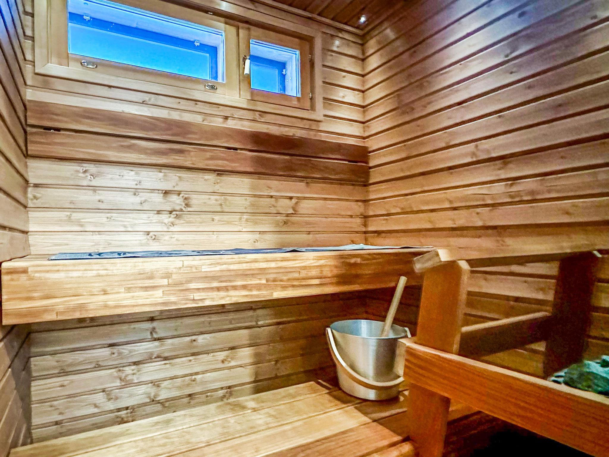 The apartment includes a combined kitchen/living room, one bedroom with two separate beds arranged as a double bed, a toilet, a shower, a sauna, a locked ski storage, a terrace, and a own parking place.