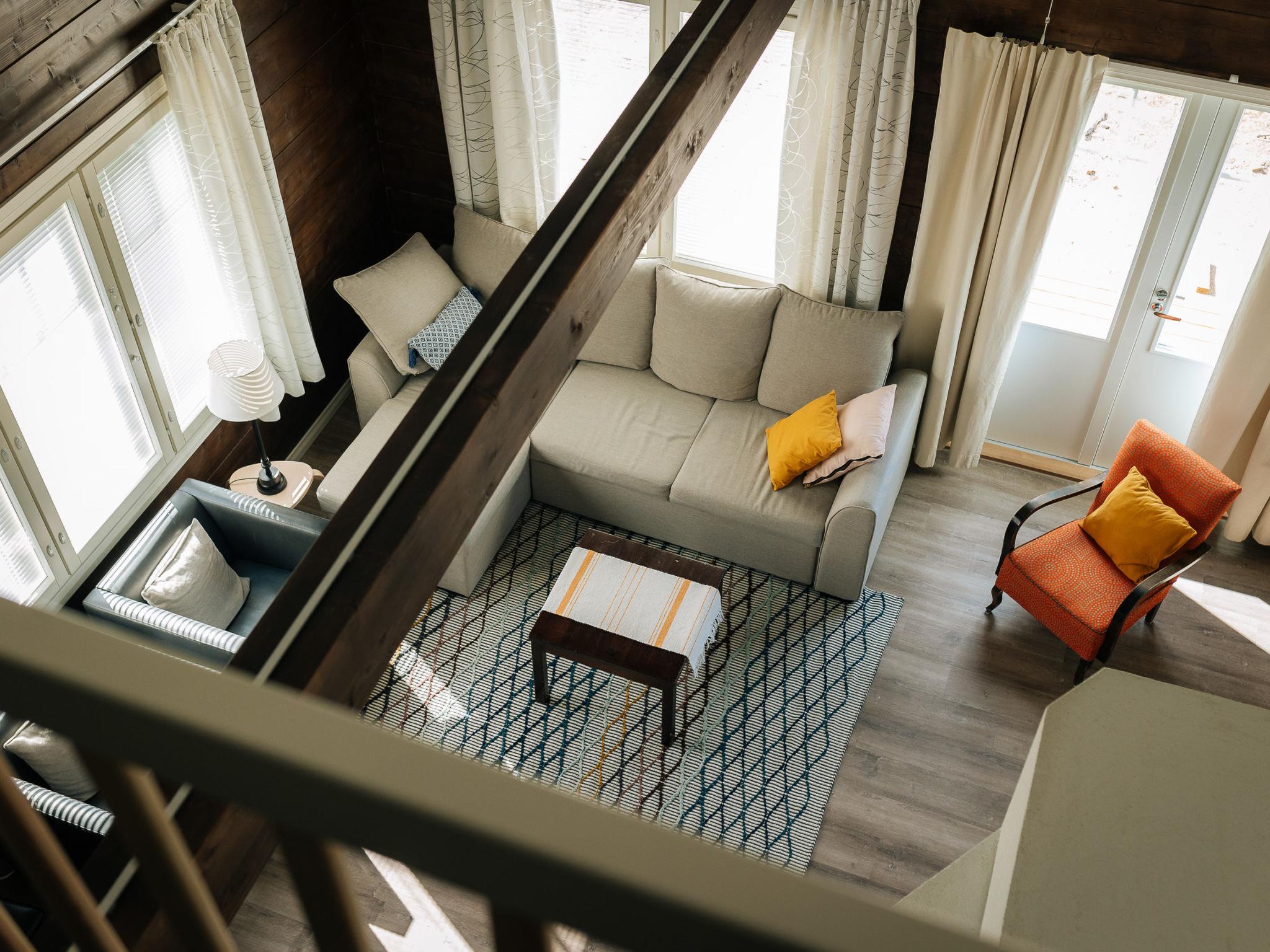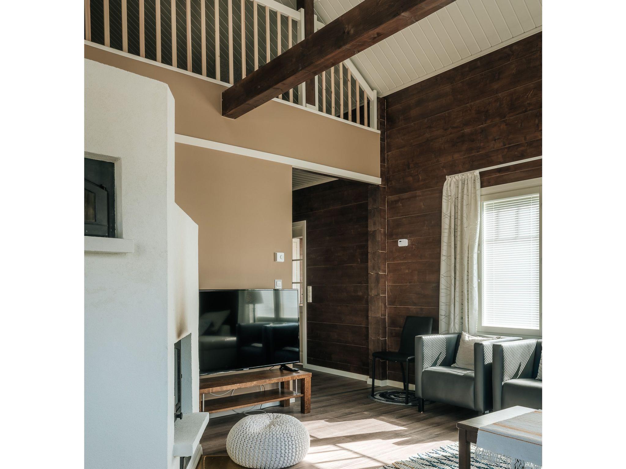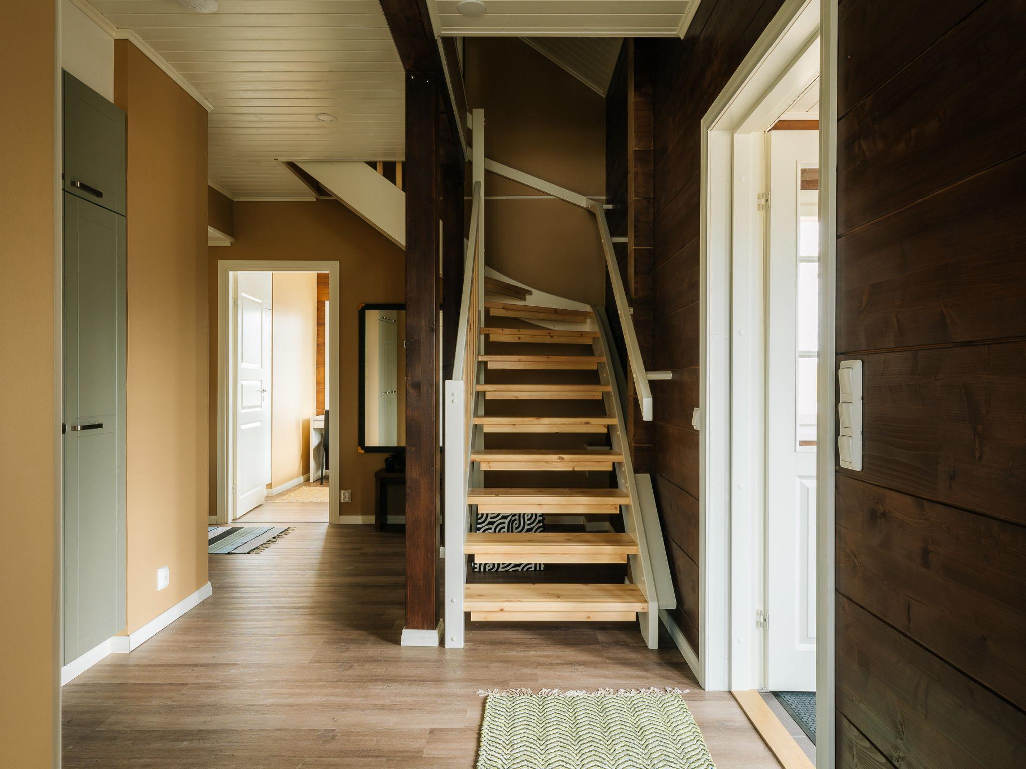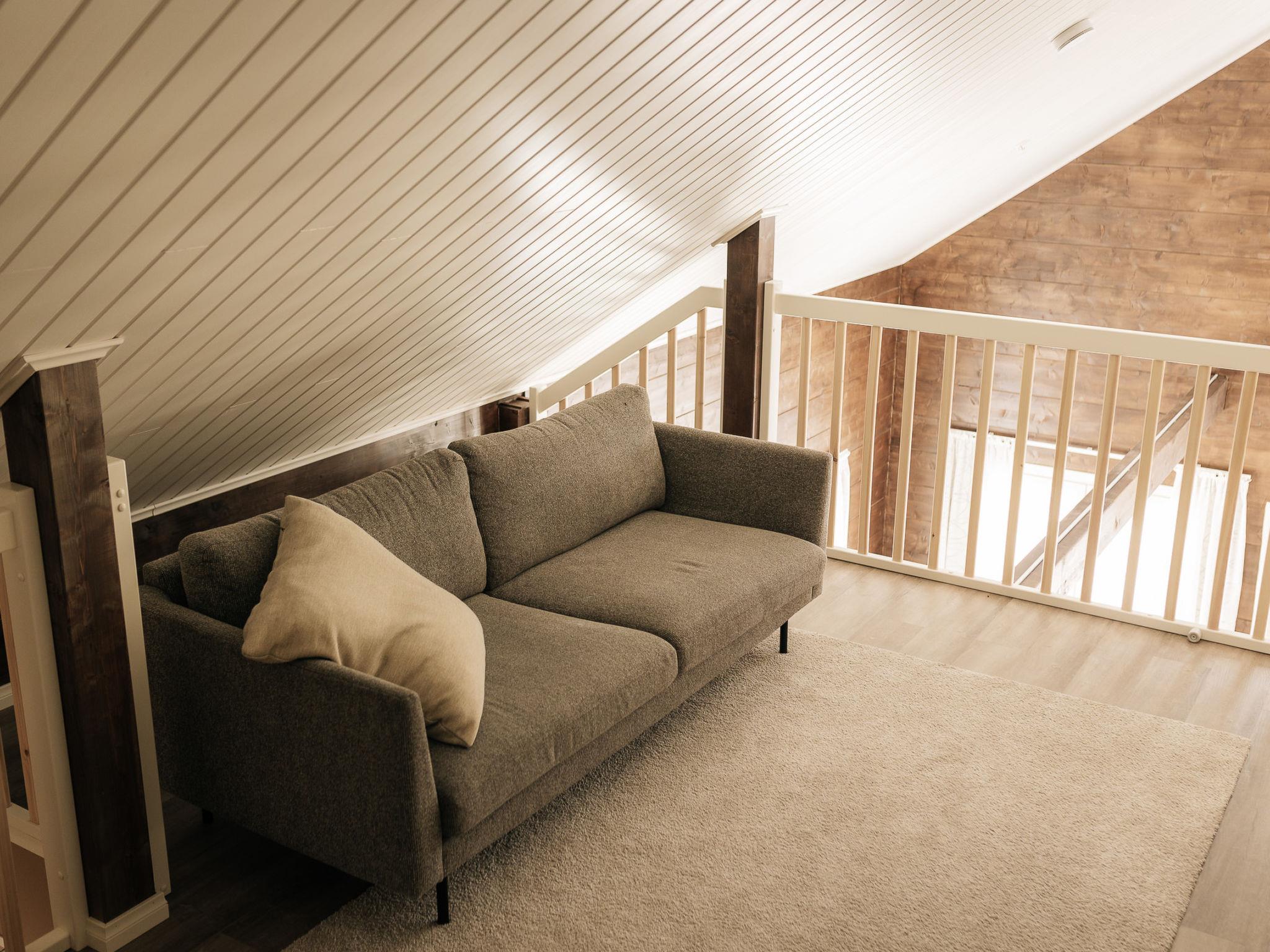 There are two bedrooms on the ground floor, each with two 90 cm king-size beds. The other has a desk for doing remote work. Upstairs there are two bedrooms, each with two 80 cm beds. The other also has a desk for remote work. The upper floor has nice views of the lower floor and the windows towards the lake. The lobby on the upper floor has a pull-out couch and a children's playground. Both floors have stylish, spacious toilets with bidet showers. The downstairs washroom has a shower and a sauna with an electric stove. In addition, you can wash your own laundry in the washing machine.