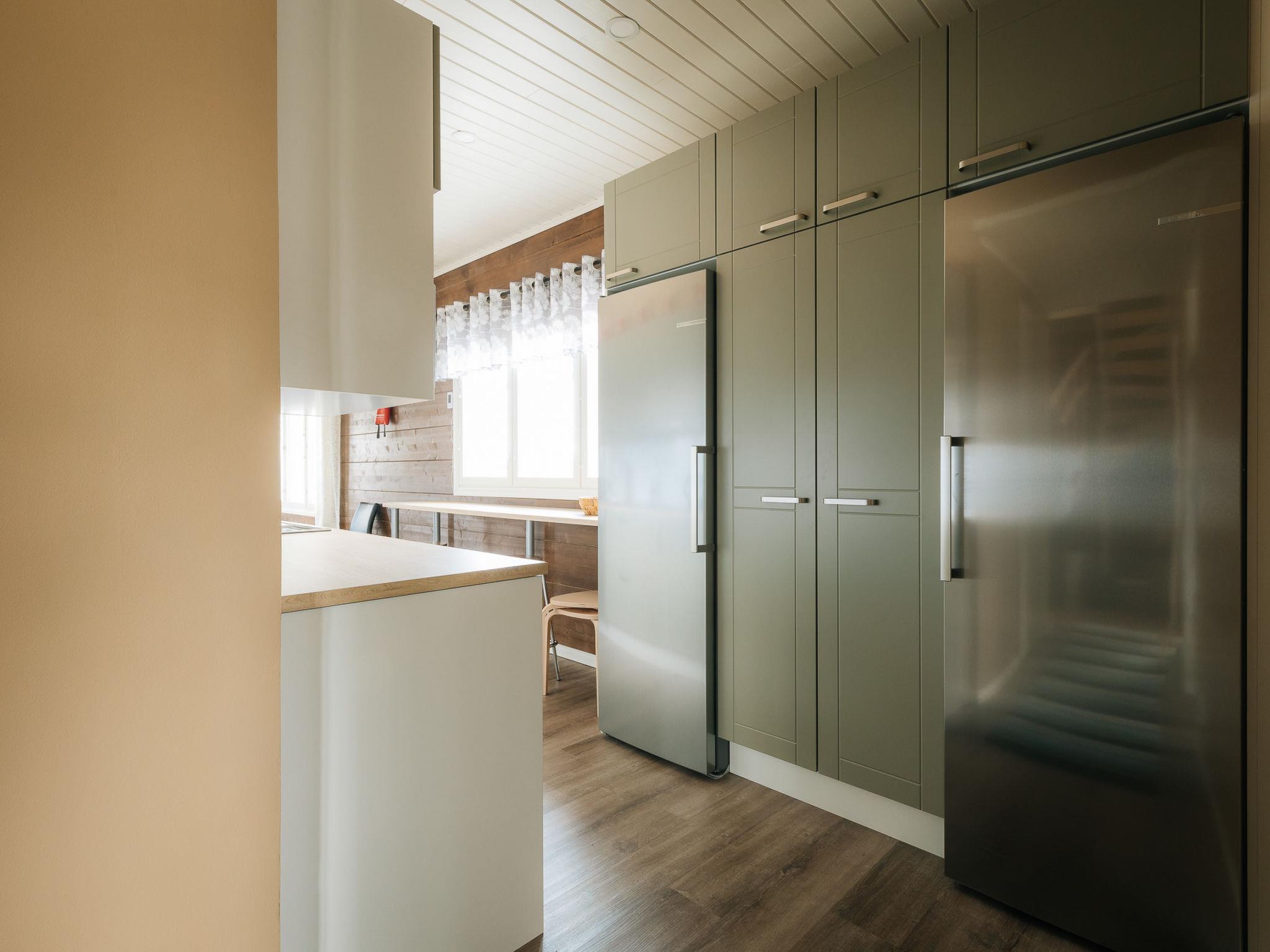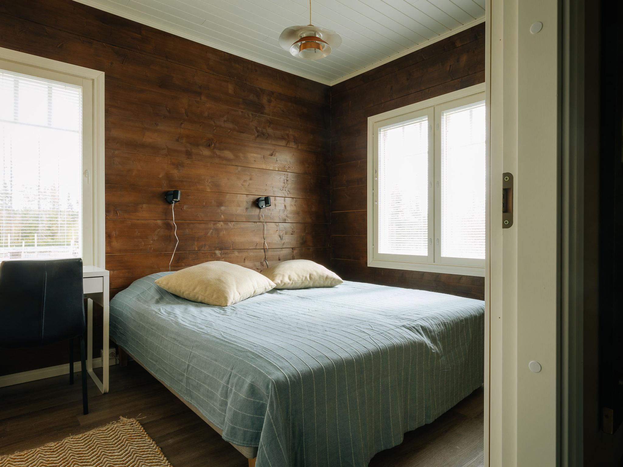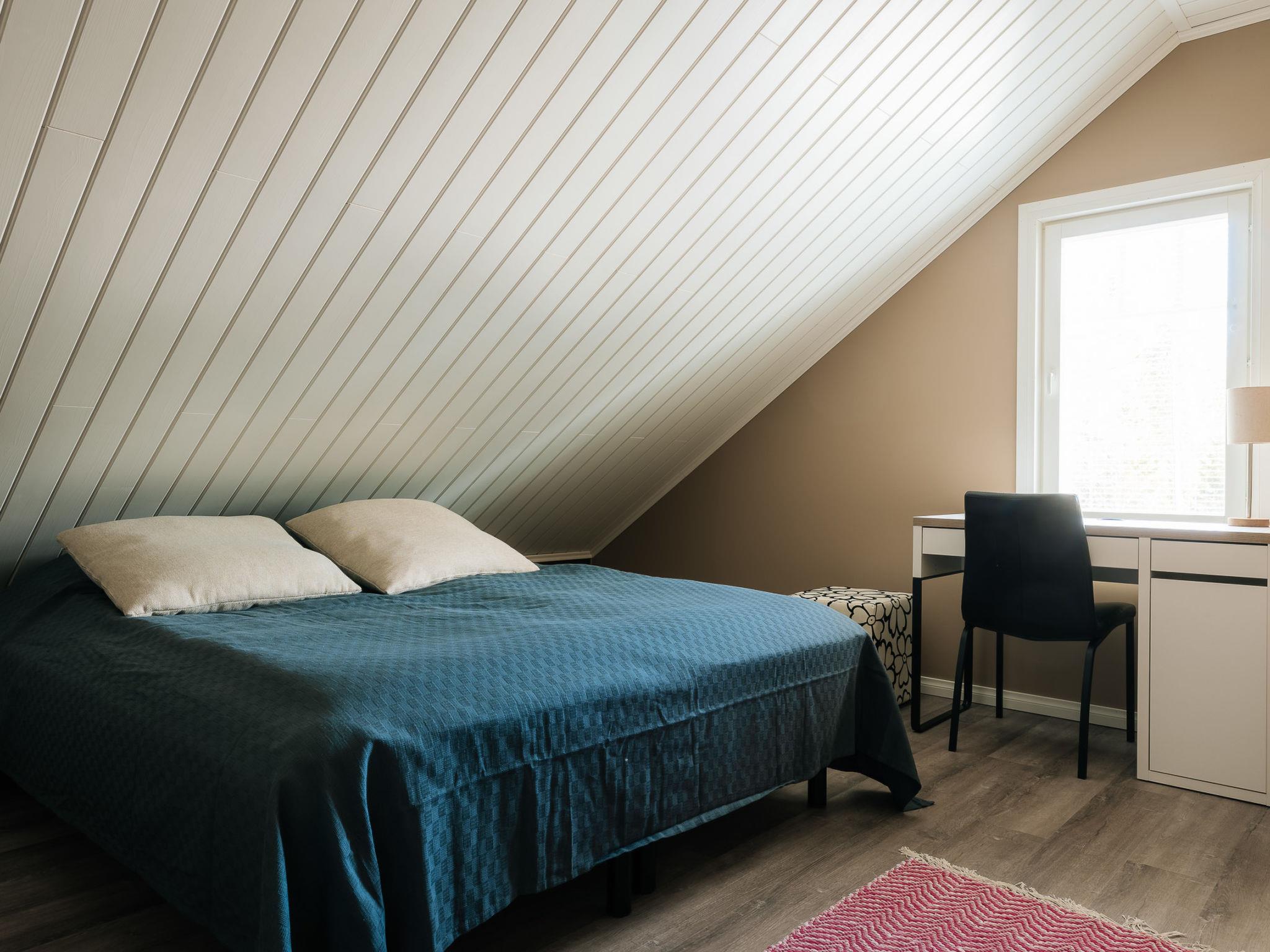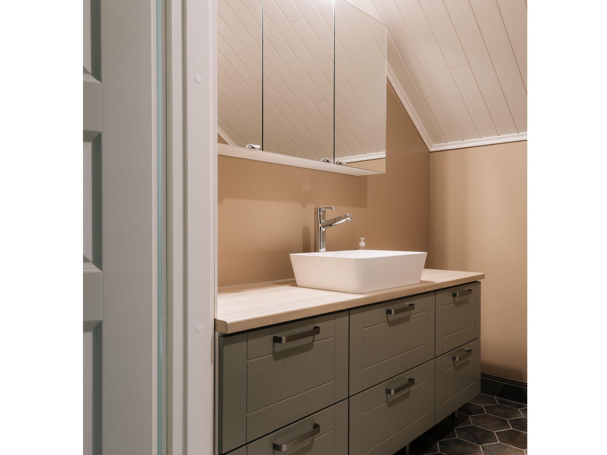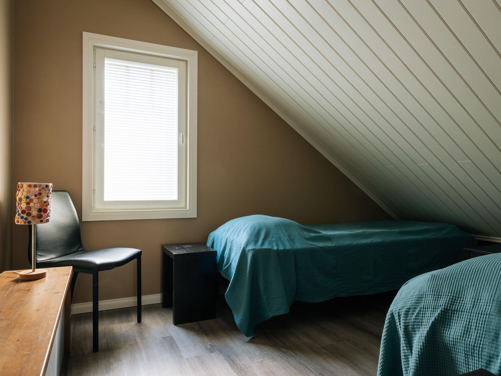 There are two bedrooms on the ground floor, each with two 90 cm king-size beds. The other has a desk for doing remote work. Upstairs there are two bedrooms, each with two 80 cm beds. The other also has a desk for remote work. The upper floor has nice views of the lower floor and the windows towards the lake. The lobby on the upper floor has a pull-out couch and a children's playground. Both floors have stylish, spacious toilets with bidet showers. The downstairs washroom has a shower and a sauna with an electric stove. In addition, you can wash your own laundry in the washing machine.