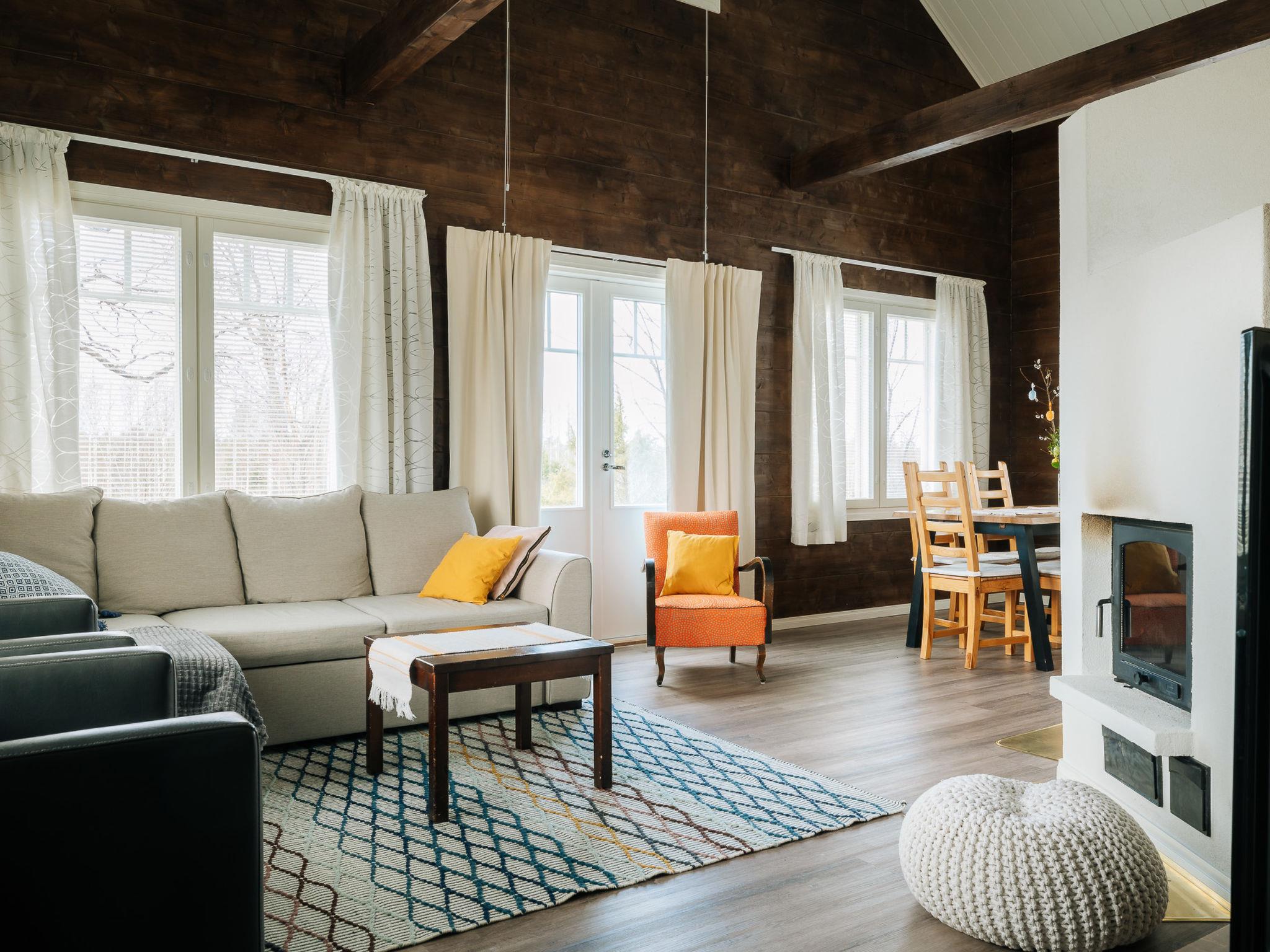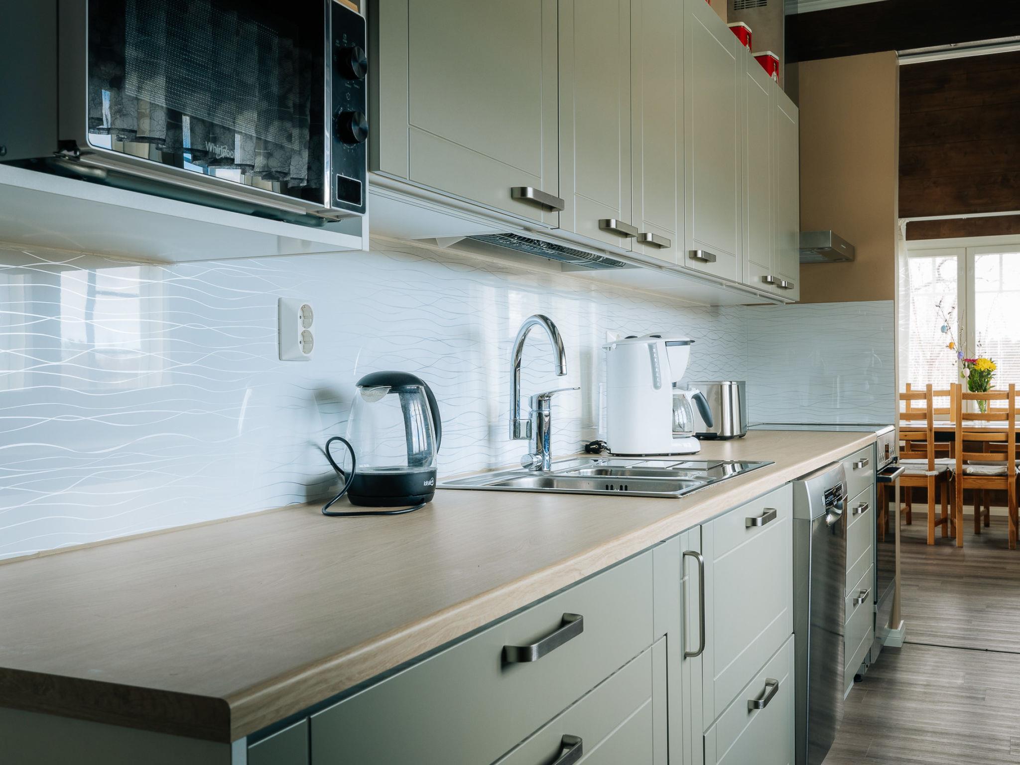 The cottage can accommodate a larger group for vacationing, partying and remote work. The living room is a two-story high, spacious space with armchairs, a pull-out sofa, a fireplace and a smart TV that connects to the Wi-Fi network. The living room is connected to the dining area as an extension of the long model kitchen with dining tables. It has a 60 cm baking oven and a wood stove with extractor fans. The kitchen has a ceramic stove with convection oven and extractor fan, Siemens dishwasher, refrigerator and freezer, microwave oven and radio/CD player. The breakfast table in the kitchen has open field views. The recycling possibilities at the waste point are good. The living room leads to a large open terrace, where you can enjoy cooling off or your morning coffee. The windowed hallway is spacious.