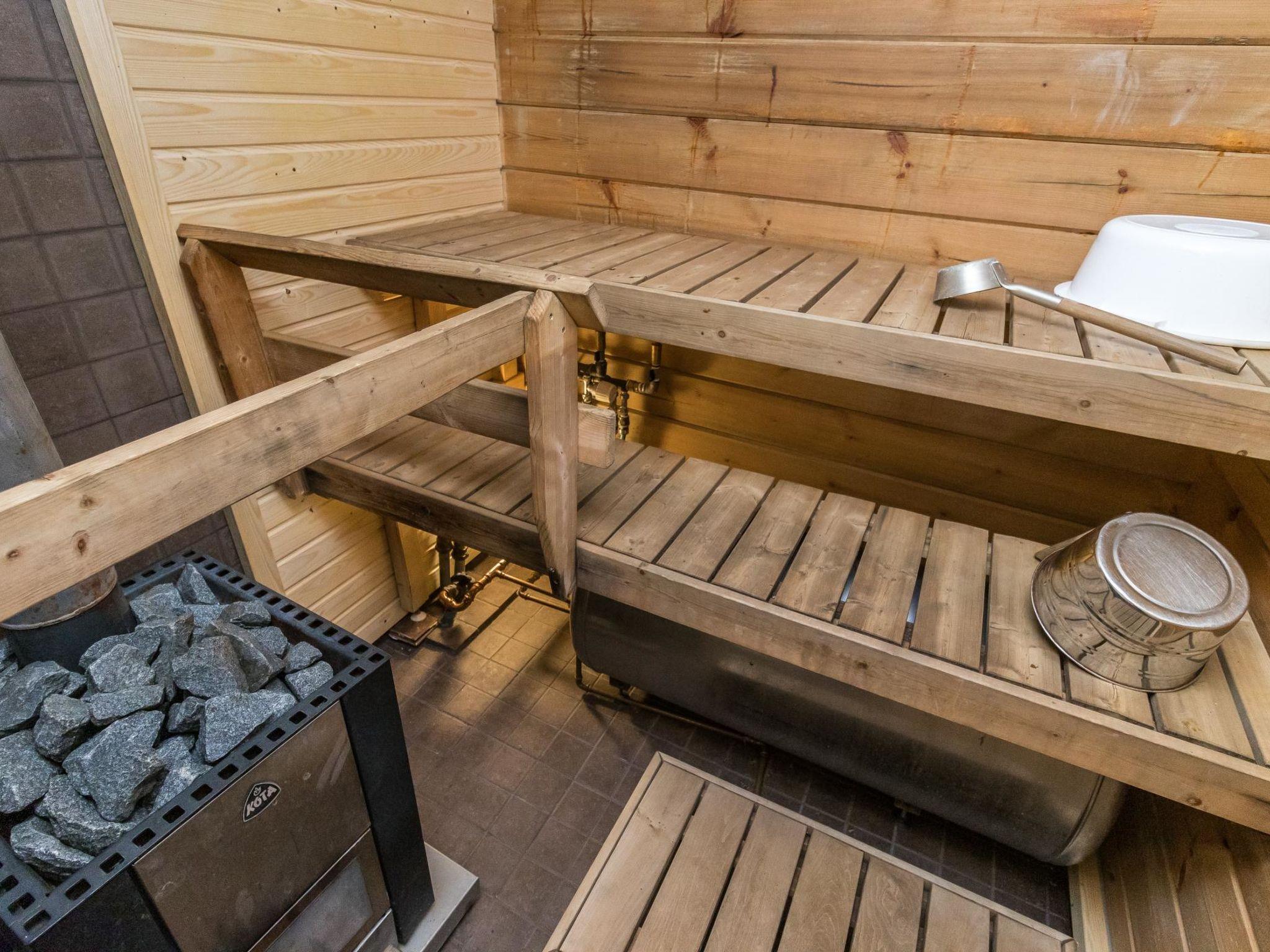 On the beach, there is a separate sauna building with a wood-heated sauna stove, a washing room, a living area, and a loft. Terrace facing the lake. If needed, you can sleep in the loft of the sauna building (note the steep ladder). The living area has a sink and a workspace.