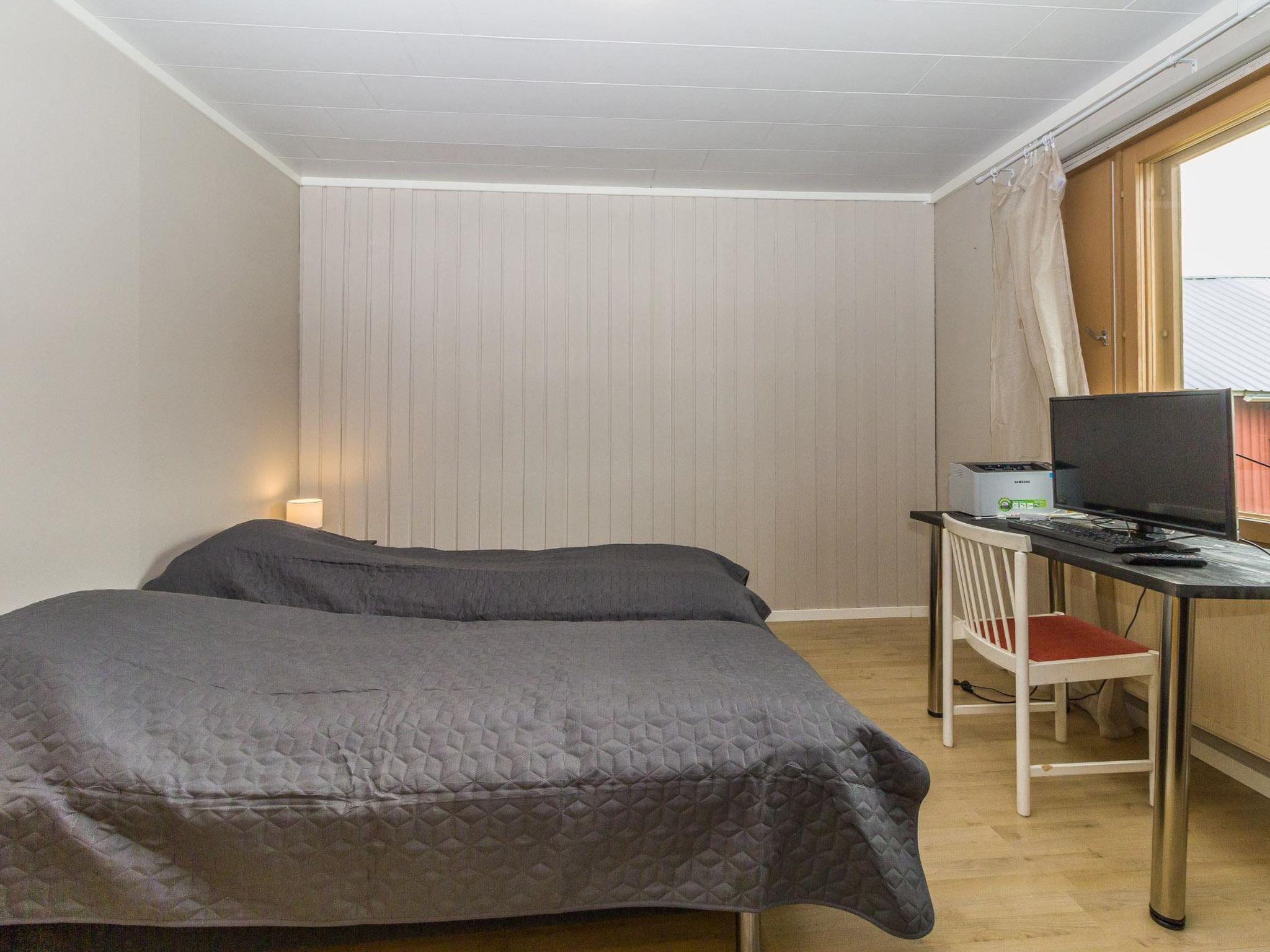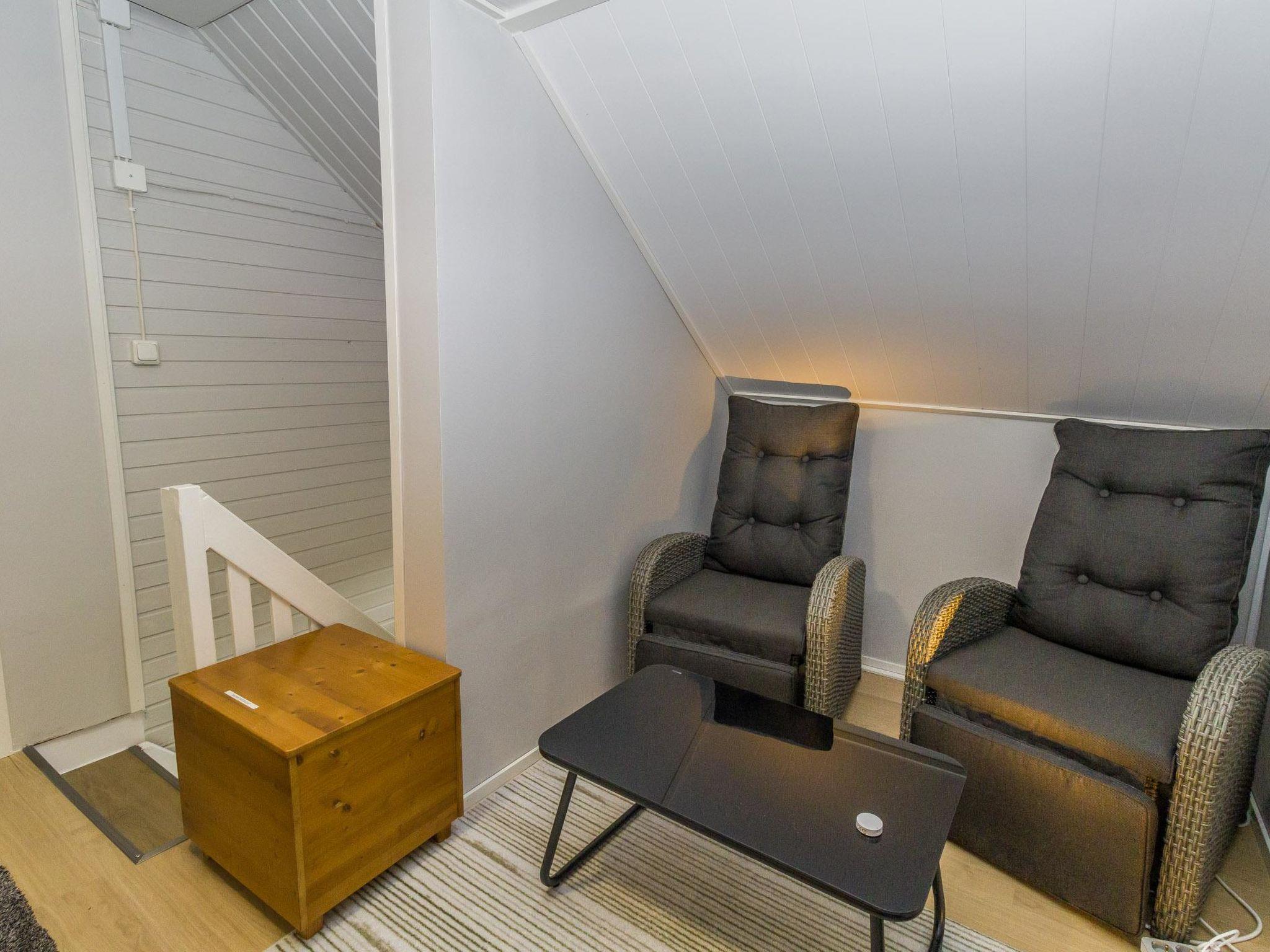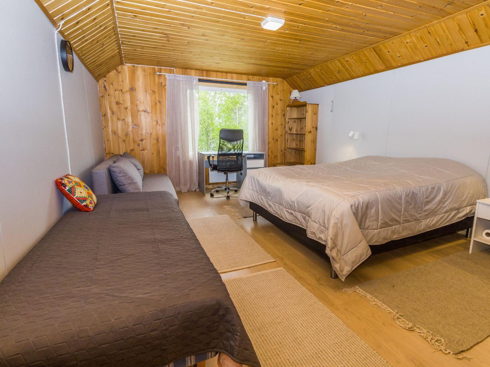 On the upper floor, there’s more accommodation in two bedrooms. The smaller room has two 80 cm wide beds. The larger room comfortably sleeps a bigger group with a 160 cm wide double bed, an 80 cm bed, and a sofa bed that opens to a 140 cm wide sleeping space. The upper floor also features its own bathroom and a sauna — perfect for unwinding at the end of the day.