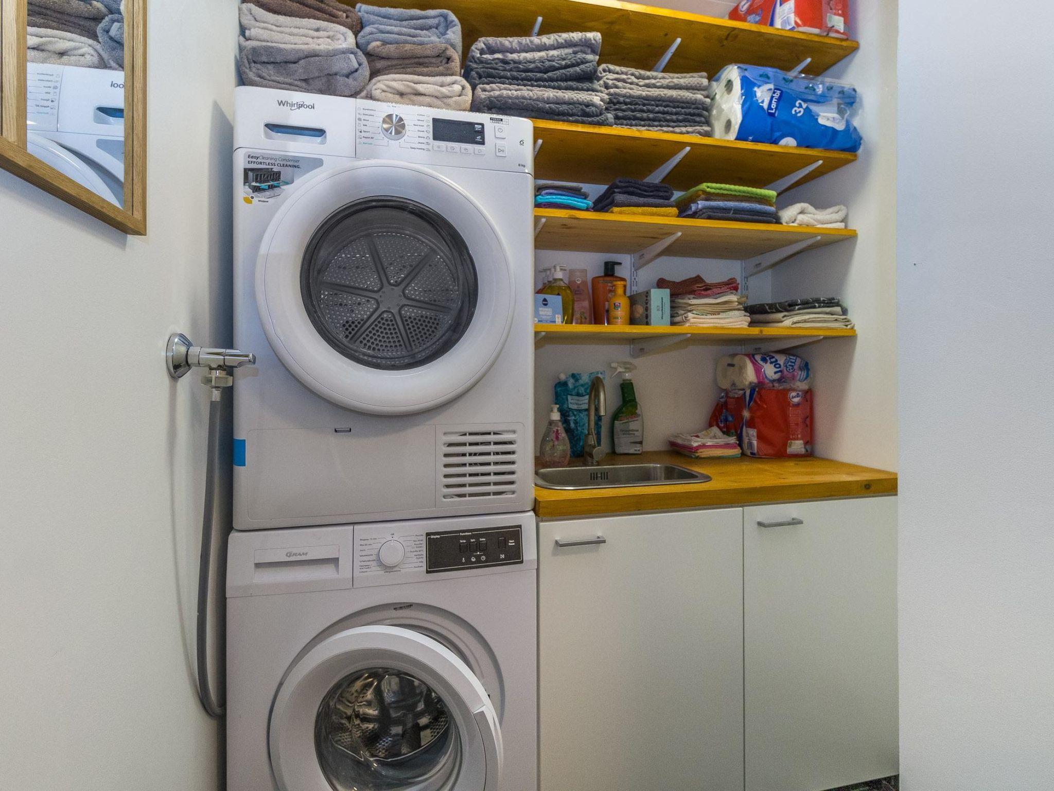 Originally built in 1947 and completely renovated in 2025, the cabin now offers approx. 150 m² of modern yet cozy living space across two floors. On the ground floor, a spacious living room welcomes you with a traditional baking oven — perfect for bringing warmth and ambiance to chilly winter evenings or rainy summer days. Adjacent to the living room is a fully equipped kitchen that makes holiday cooking easy. On the ground floor you’ll also find two bedrooms, each with two 80 cm wide beds. The entrance opens to a spacious hallway leading to a practical utility room. The downstairs bathroom includes a WC and a shower.