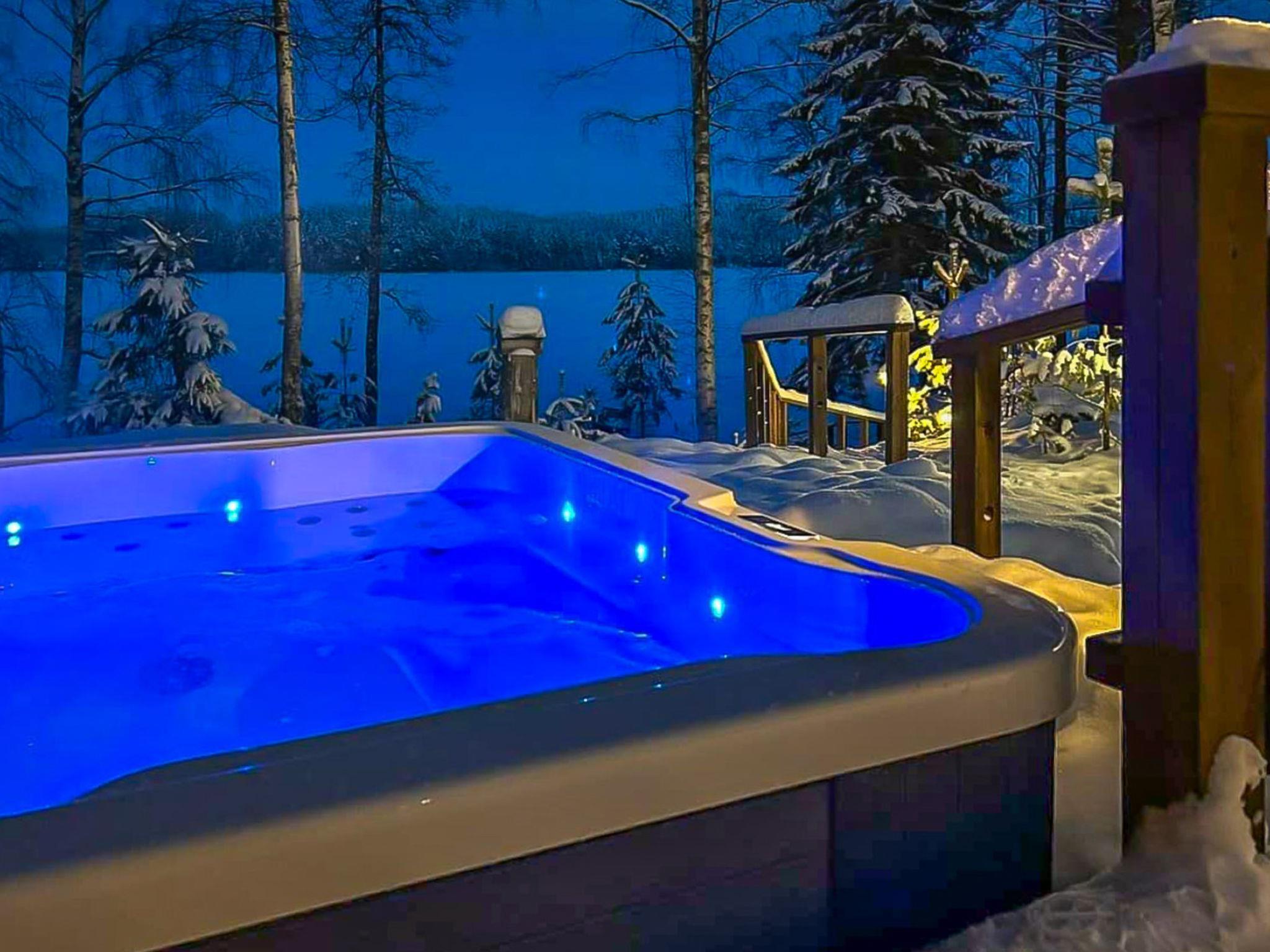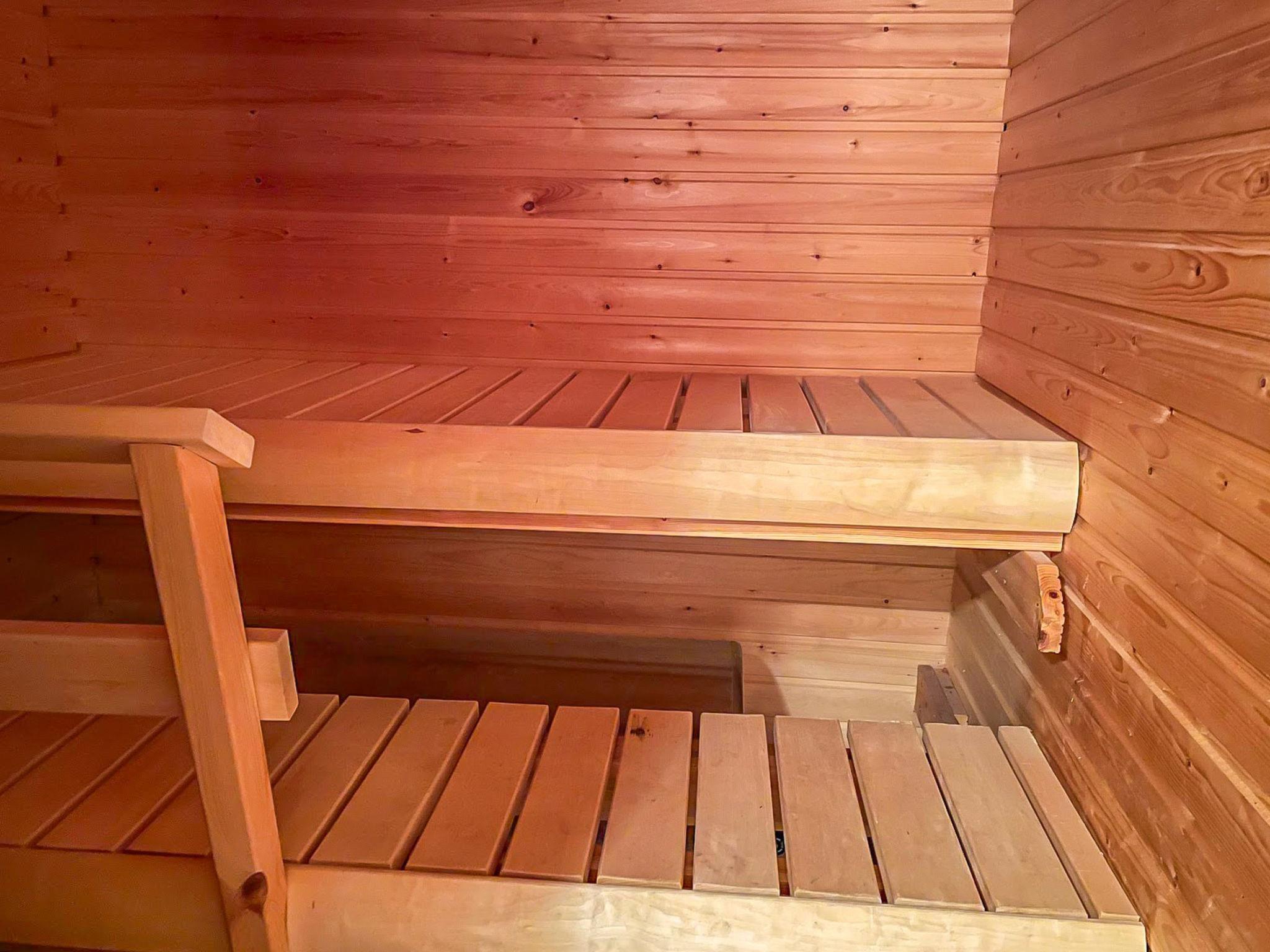 The year-round lakeside sauna has a wood-burning stove, washing water from the heater tank. There is an outdoor hot tub on the sauna terrace for free use.