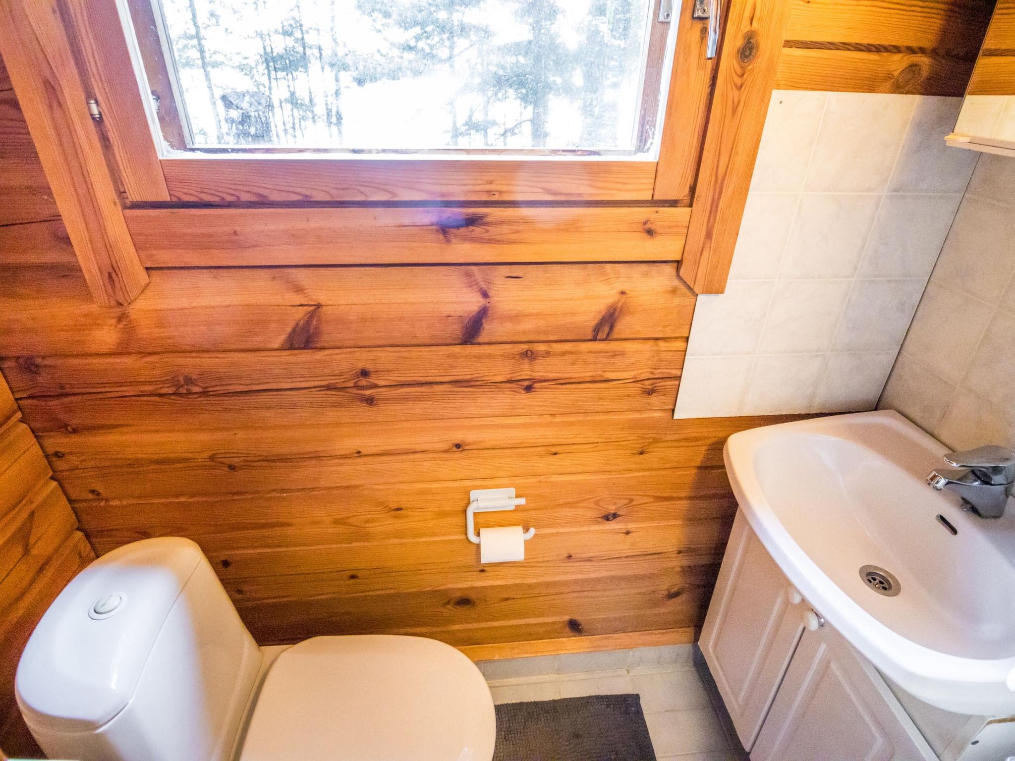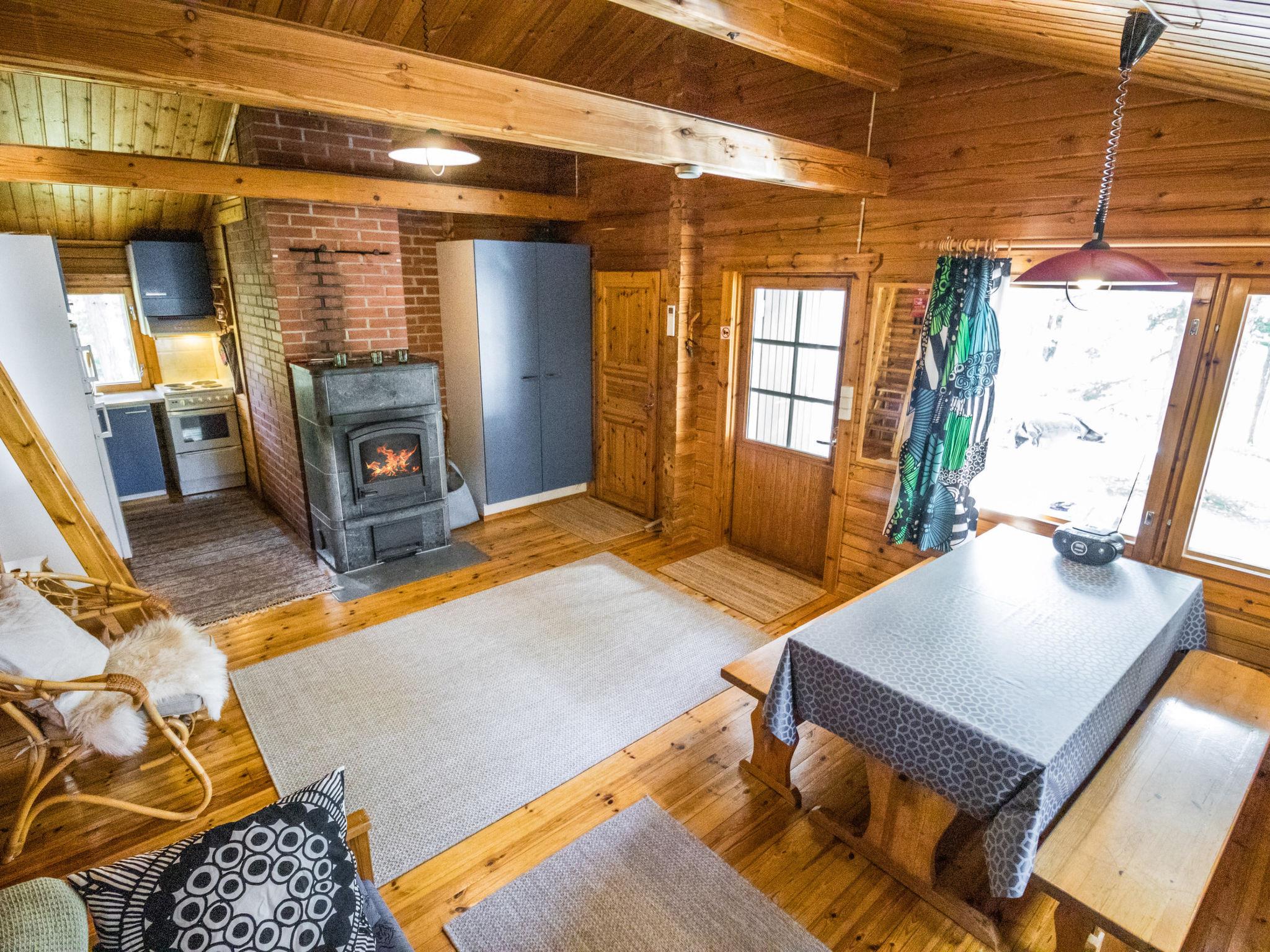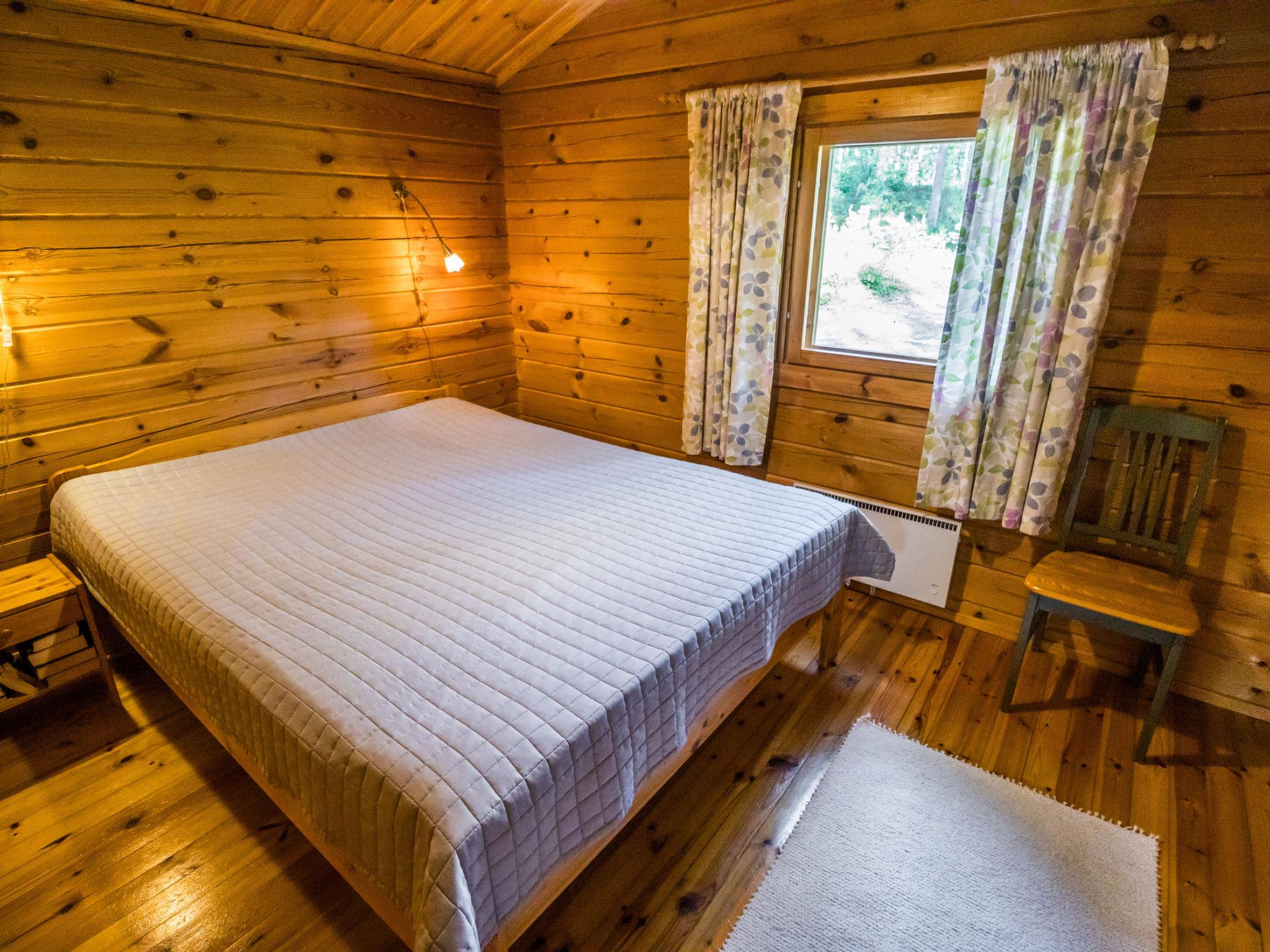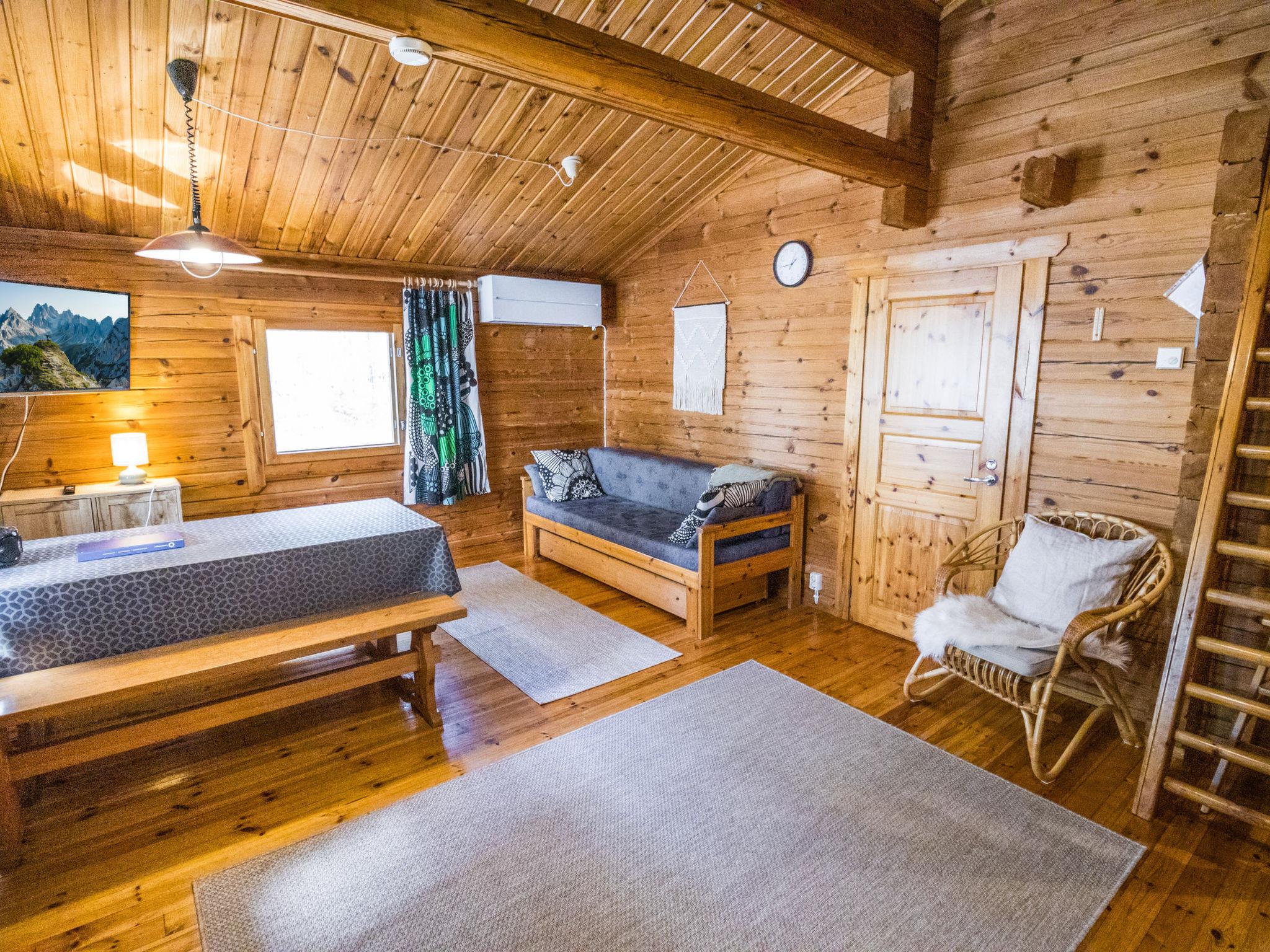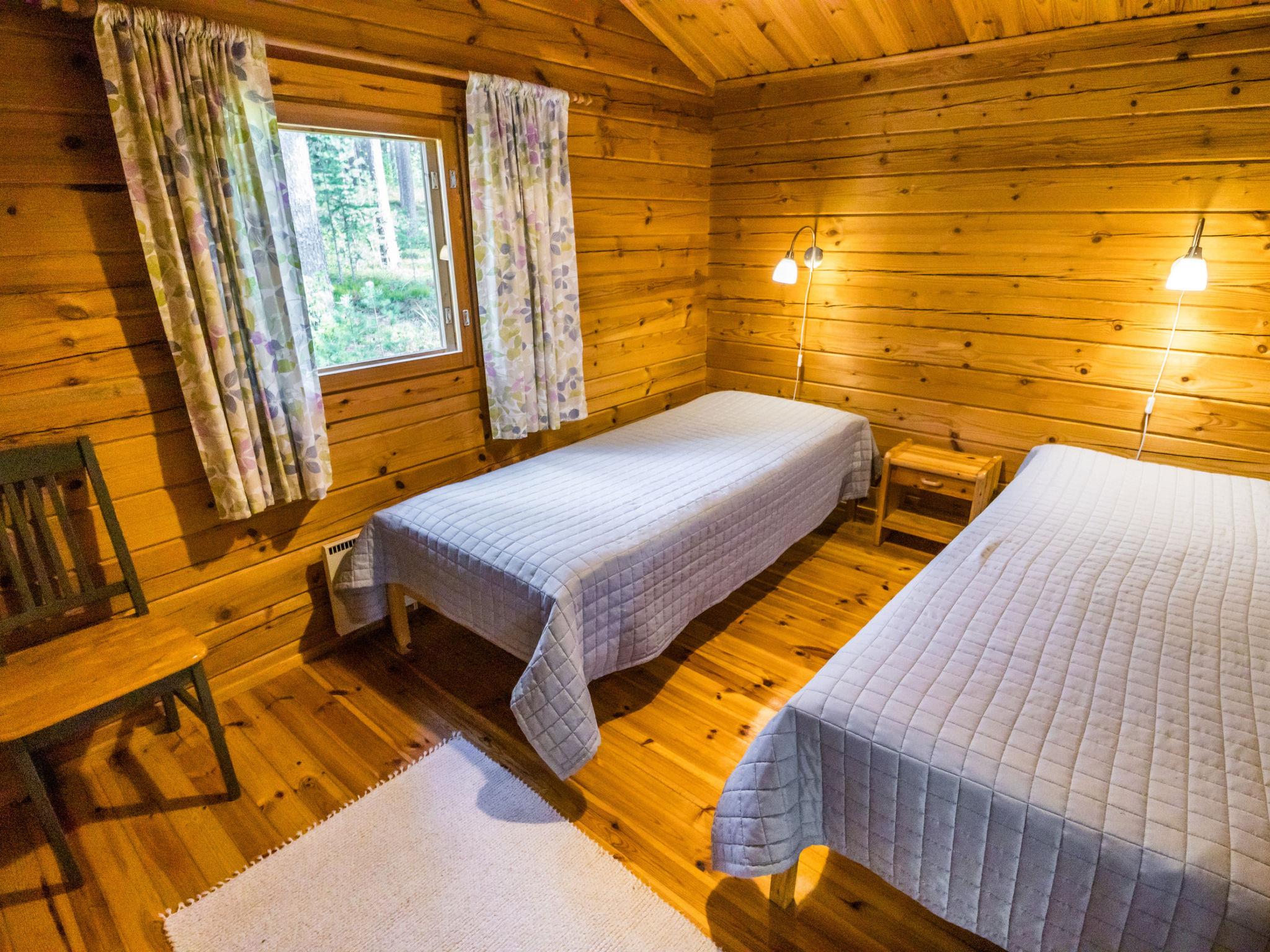 The cabin features a living room/kitchen with a sofa bed and two separate bedrooms (one with a double bed, the other with two single beds). The washroom provides access to a separate WC and a wood-heated sauna.