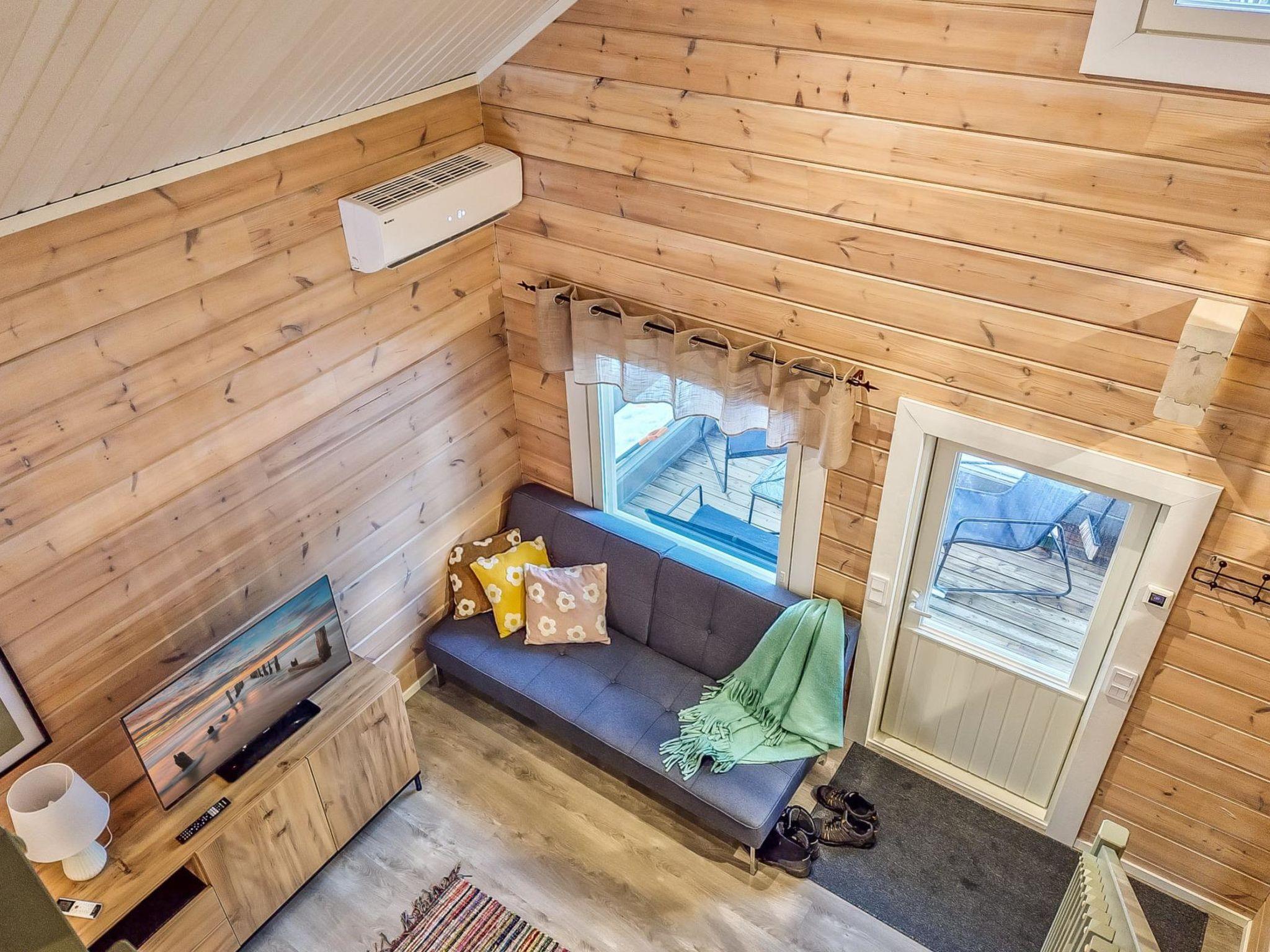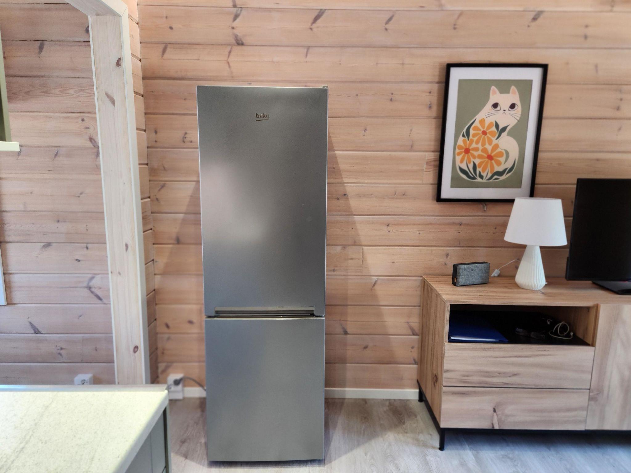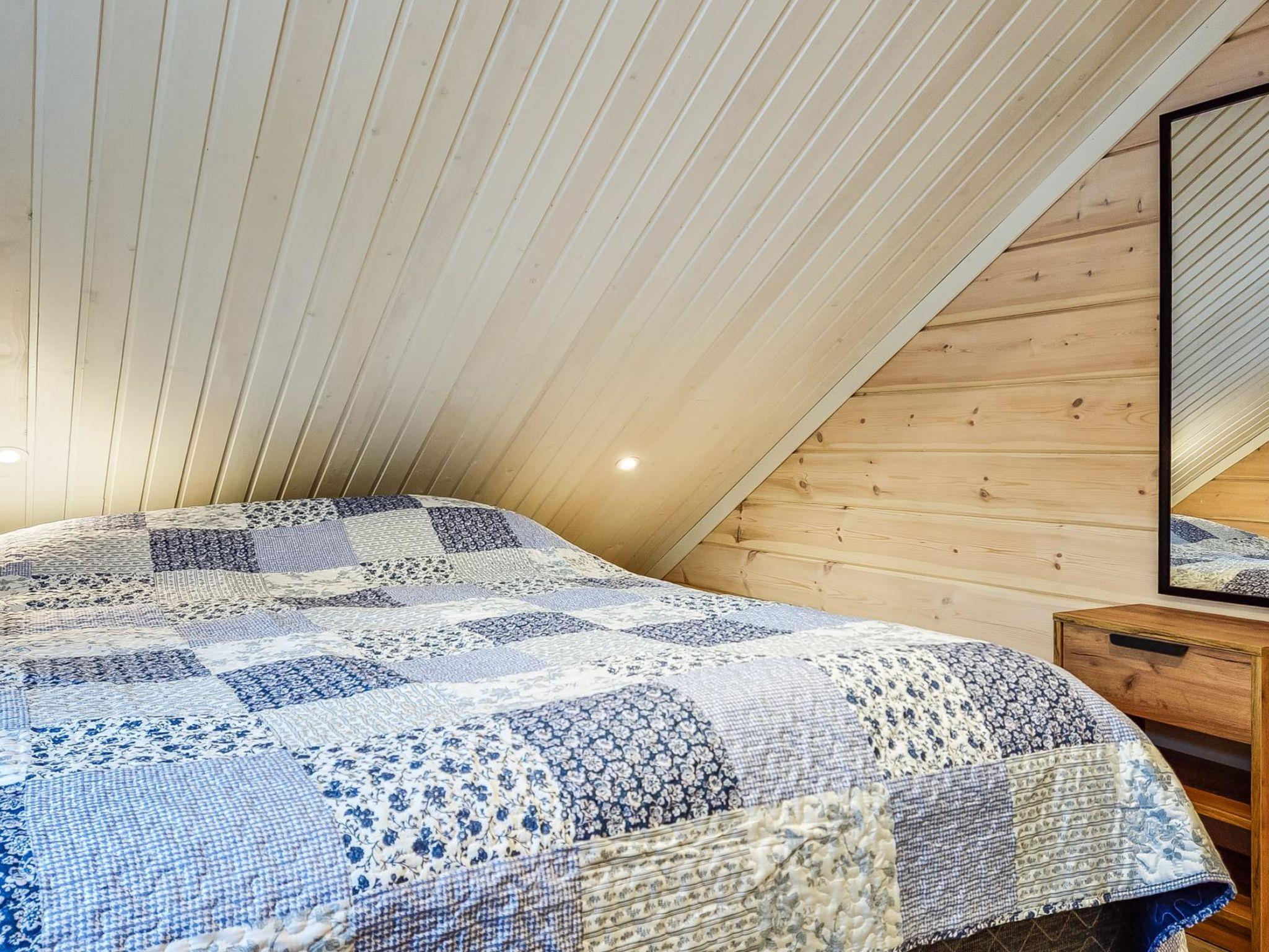 The cabin features two bedrooms, one on the ground floor and another on the upper floor, both furnished with double beds. The living room/kitchen includes a sofa bed that accommodates two guests. Additionally, the loft has a 140 cm wide mattress. However, the cabin is rented out for a maximum of 6 guests. The wood-heated sauna provides a soothing and relaxing steam experience. The dressing room includes a WC and a washing machine.