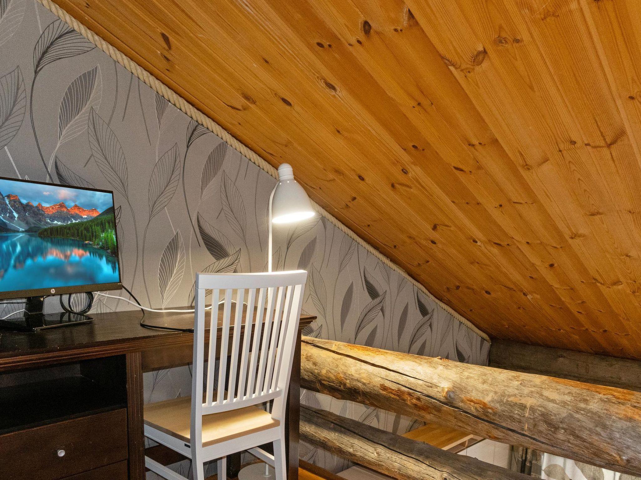 The apartment has a large living room/kitchen, three bedrooms, and a spacious loft. One bedroom has a double bed, another has two separate beds, and the third has a bunk bed. The loft includes two beds, a comfortable sleeping couch for two adults and a working desk. Please note that the stairs leading to the loft are steep, and the railing is low. The ground floor includes a sauna, washroom/WC, additional WC, and balcony.