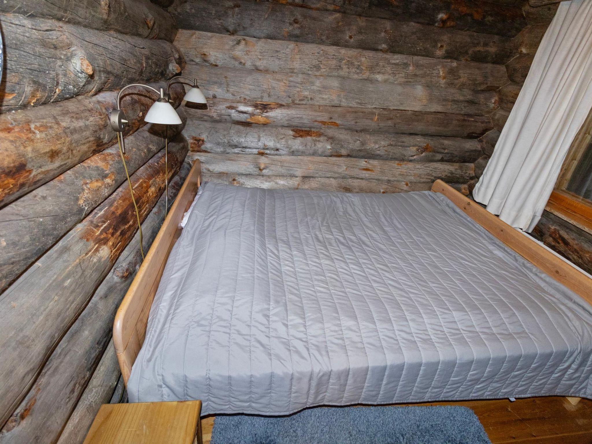 The cabin features a spacious living area combined with a kitchen where you can enjoy meals and relax by the fireplace. On the ground floor, there’s also a sauna with a washroom, perfect for unwinding after a day of outdoor activities. The downstairs bedroom includes a comfortable double bed for restful sleep, and the low loft upstairs has space for two 160 cm extra beds – an ideal spot for children. Note that the loft is accessed via steep ladders.