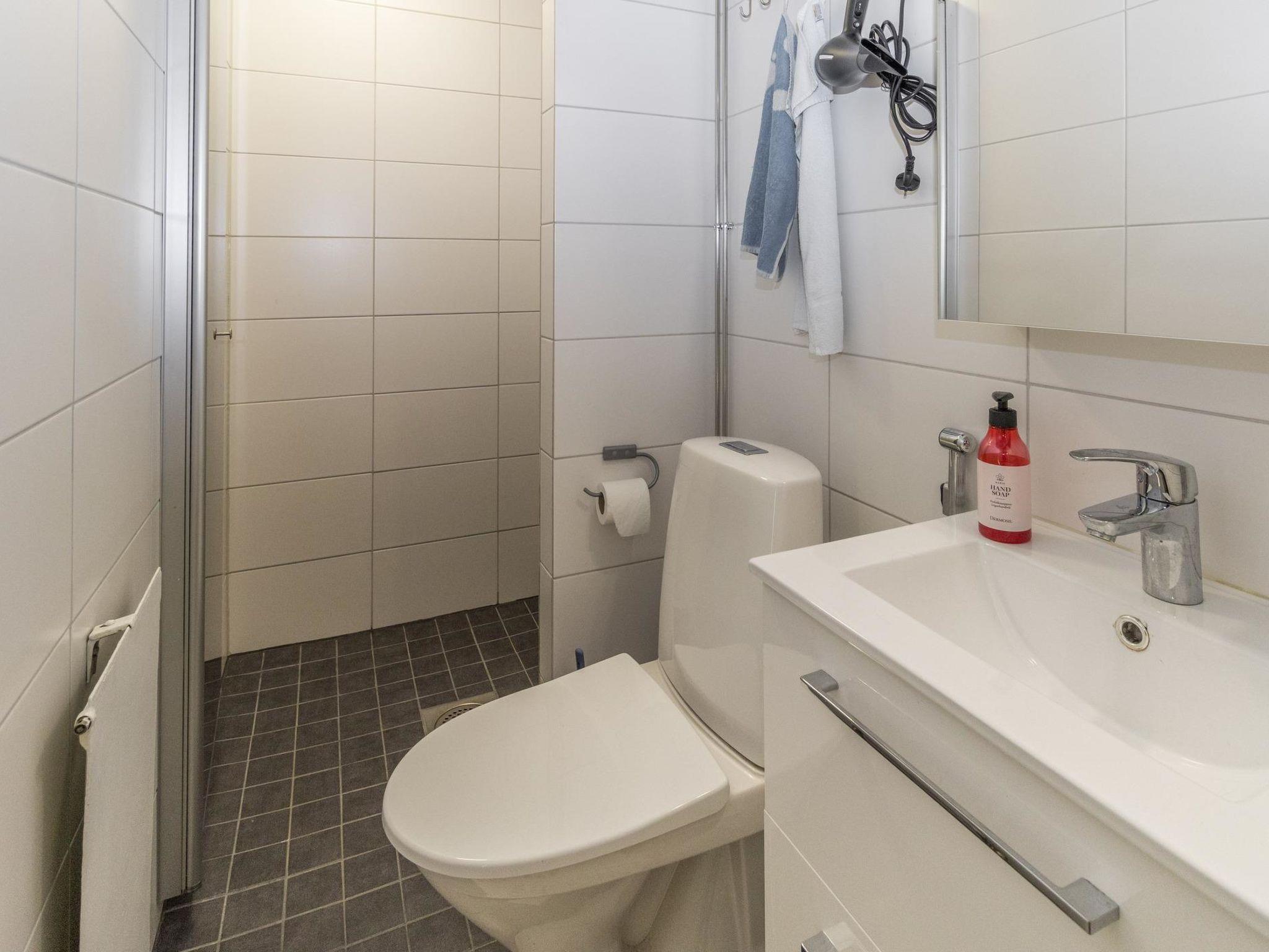 The apartment features a spacious living room and a bright, roomy kitchen. One bedroom has a 160 cm wide double bed, and the other bedroom has two separate 80 cm wide beds. The living room contains a sofa bed, which is 140 cm wide when opened. The washroom includes a shower and WC. In shared use with another apartment: a sauna, washing facilities, washing machine in the basement, and a tepee in the yard.
