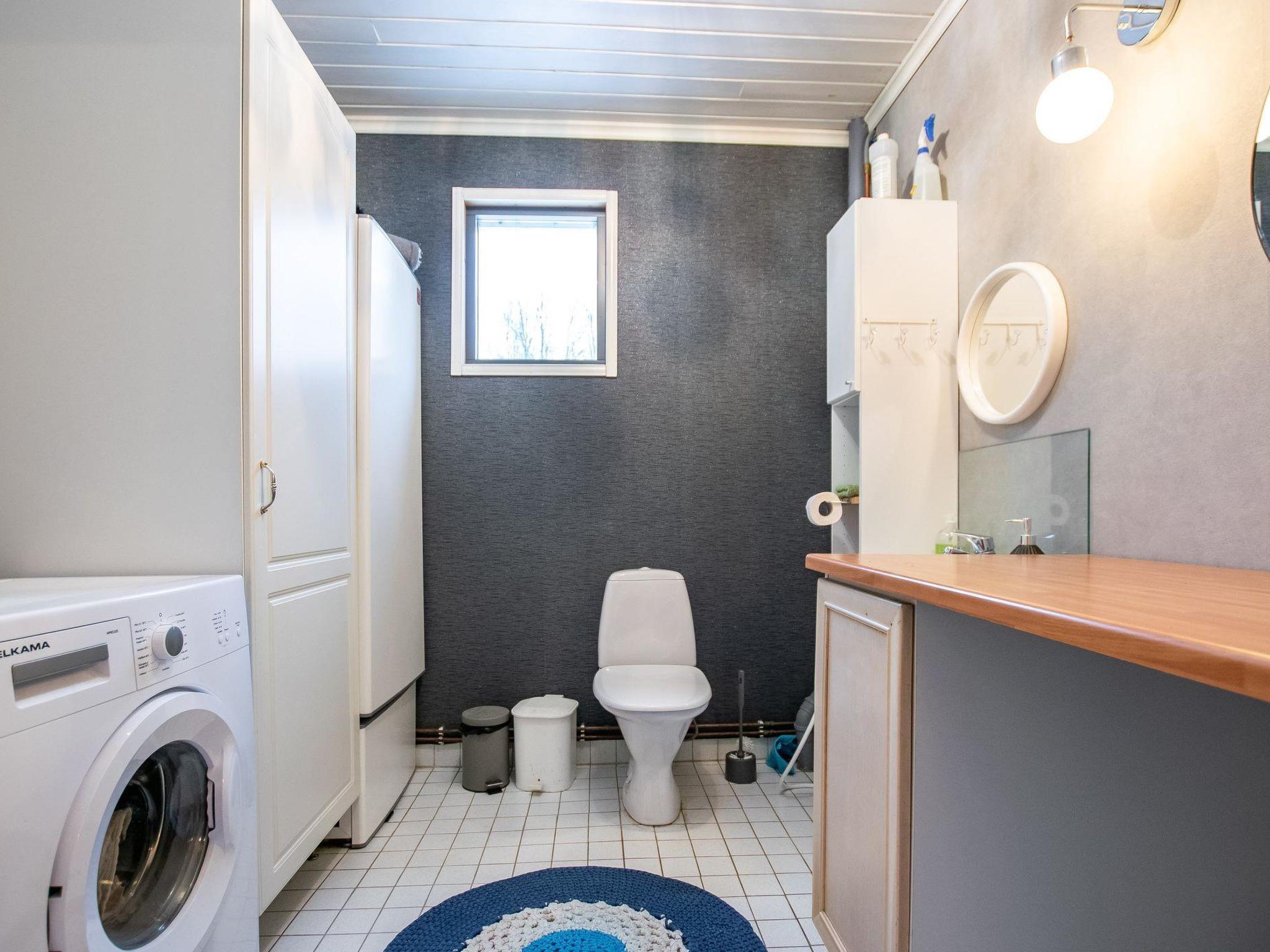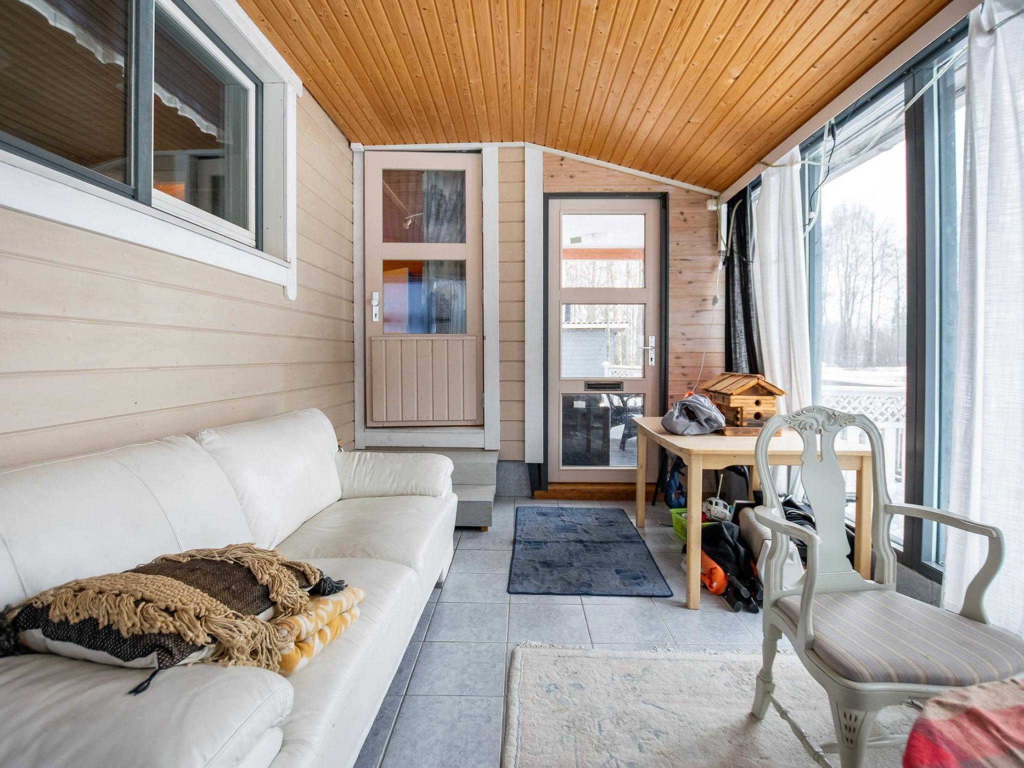 Washroom with a shower and access to the terrace. The sauna features a wood-heated sauna stove. Separate WC/utility room with a washing machine. The glazed porch has a sofa and chairs, as well as an additional 120x200 cm bed. This bed serves as an optional sleeping place and is not counted in the official accommodation capacity.