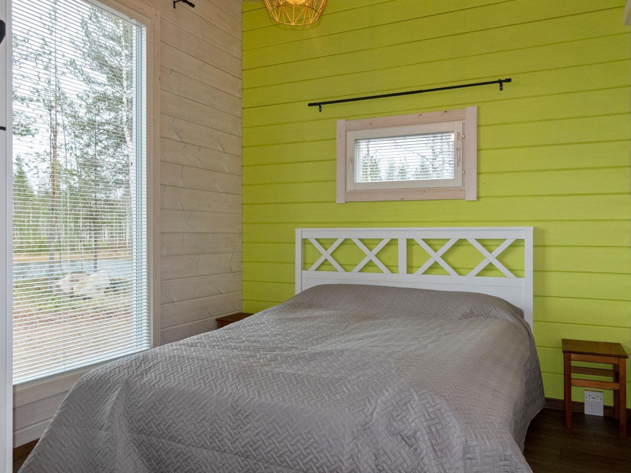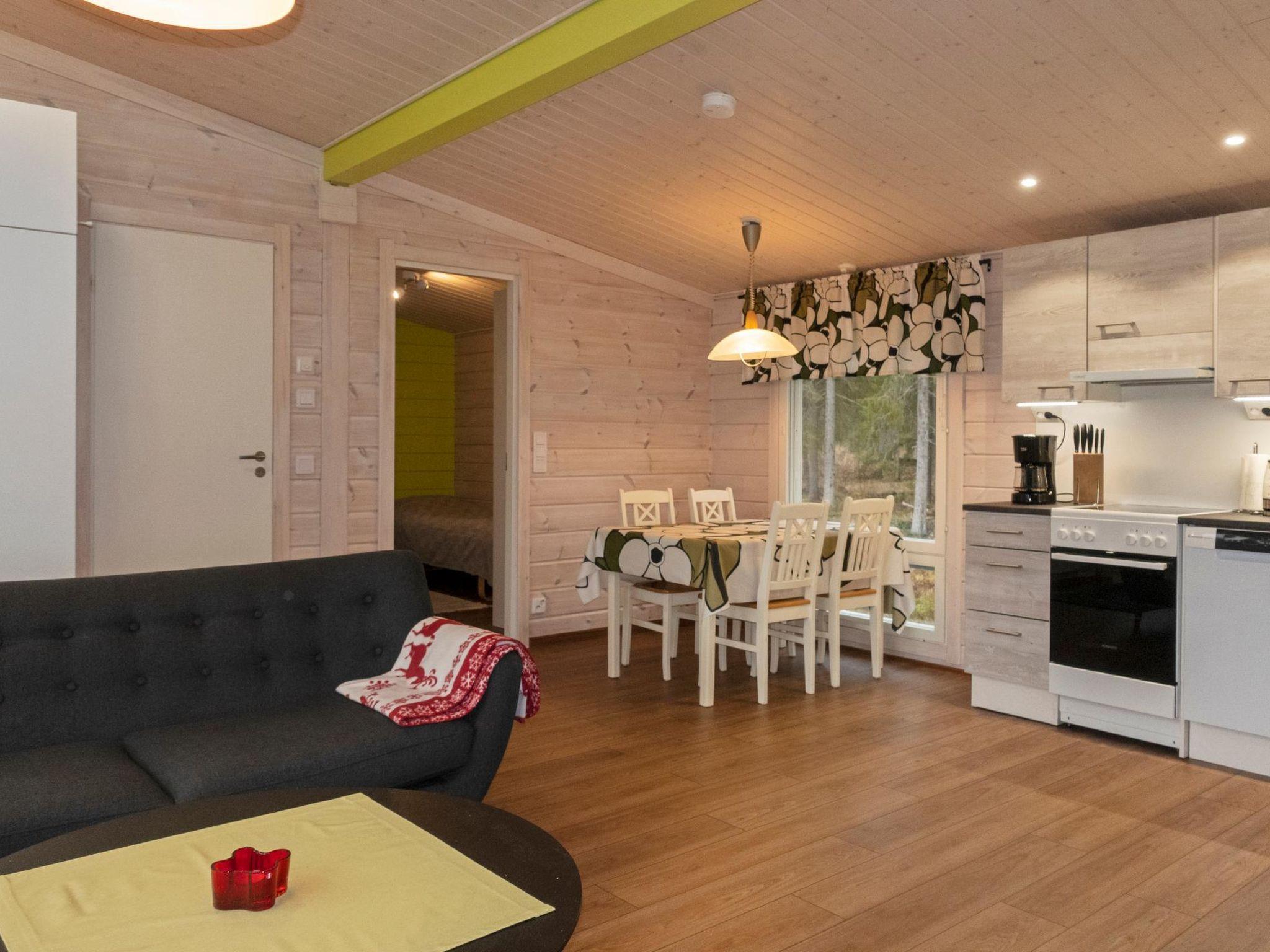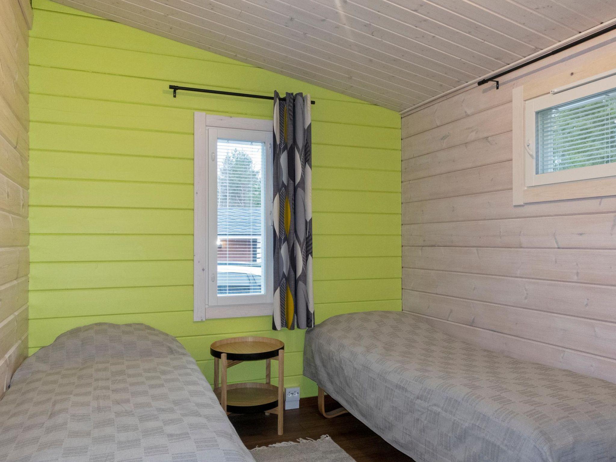 The cabin is built of planed logs, completed in 2022. Living room/kitchen, 2 bedrooms, both with 2 beds, sauna and washroom/WC.