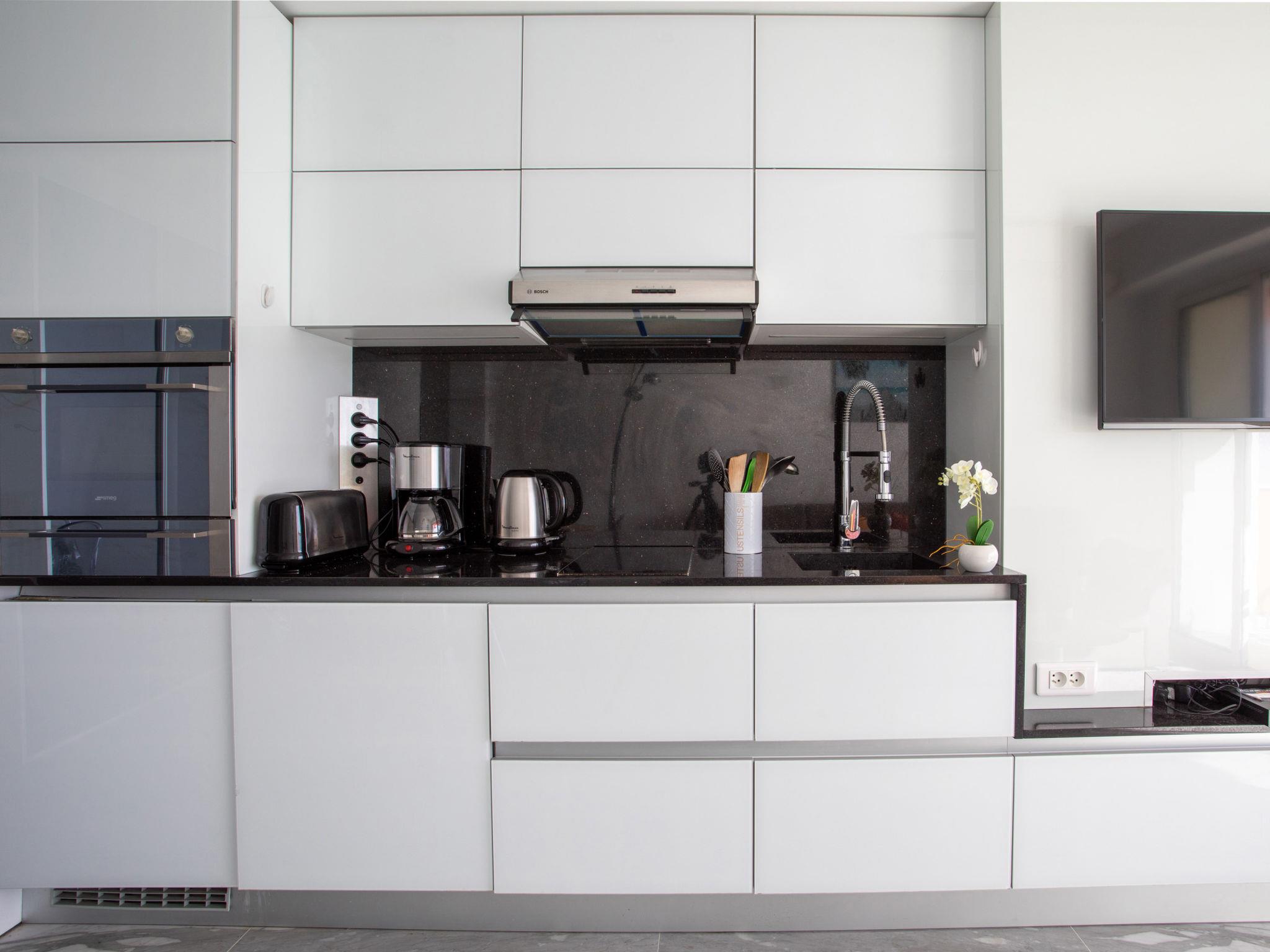 2-Zimmer-Wohnung 32 m2 im 5. Stock. Hell, komfortabel und modern eingerichtet: Wohn-/Esszimmer mit Panoramafenster mit 1 Doppeldiwanbett (140 cm, Länge 190 cm), TV, Flachbildschirm und Klimaanlage. Ausgang zur Terrasse. Schlafnische mit 1 franz. Bett (140 cm, Länge 190 cm). Offene Küche (Backofen, Geschirrspüler, 2 Induktionskochplatten, Toaster, Wasserkocher, Mikrowelle, elektrische Kaffeemaschine). Dusche/WC. Heizung. Grosse Terrasse 12 m2, Südlage. Terrassenmöbel. Panoramasicht auf das Meer. Zur Verfügung: Waschmaschine, Bügeleisen, Haartrockner. Internet (WLAN, gratis). Parkplatz (1 Auto). Bitte beachten: Maximal 1 Haustier/Hund erlaubt. Rauchmelder. Anstelle eines abgeschlossenen Schlafzimmers befinden sich manche Schlafplätze in einem offenen Bereich (Galerie, Nische etc.). 06027010946HT