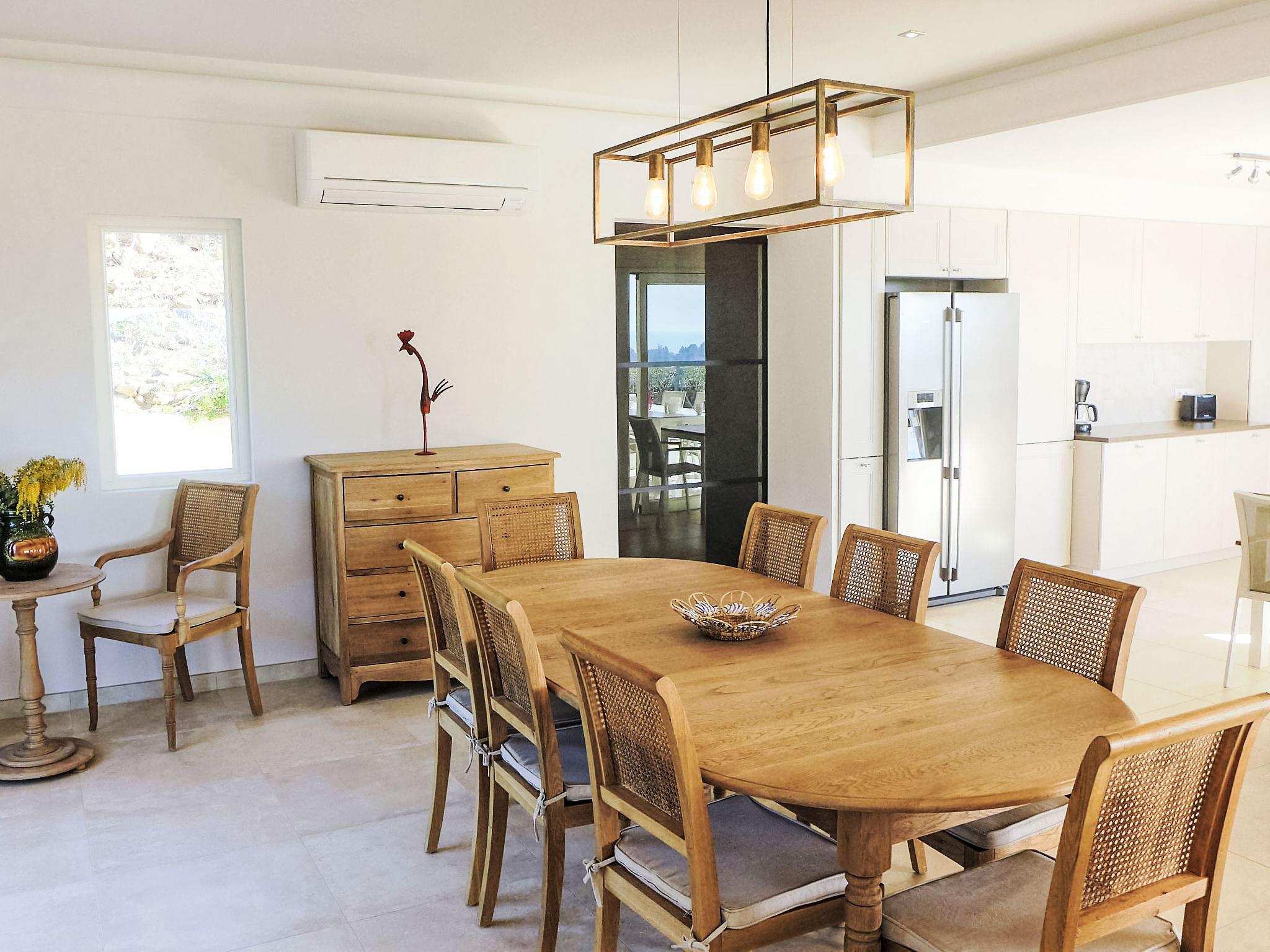 5-Zimmer-Haus 140 m2, Südlage. Geräumig, vollständig renoviert im Jahre 2016, komfortabel und modern eingerichtet: grosses Wohn-/Esszimmer mit Panoramafenster mit Sat-TV (Flachbildschirm), Stereoanlage. Ausgang zur Terrasse, zum Schwimmbad. 1 Zimmer mit 1 Doppelbett (160 cm, Länge 200 cm), Dusche/WC und Doppelwaschbecken. 1 Zimmer mit 1 Doppelbett (160 cm, Länge 200 cm). Ausgang zum Schwimmbad. 1 Zimmer mit 1 Doppelbett (160 cm, Länge 200 cm), Bad/WC und Waschbecken. Ausgang zum Schwimmbad. 1 Zimmer mit 1 Doppelbett (160 cm, Länge 200 cm), Waschbecken und Dusche/WC. Offene Küche (Backofen, Geschirrspüler, 3 Induktionskochplatten, Toaster, Wasserkocher, Tiefkühler, elektrische Kaffeemaschine, Kapseln für die Kaffeemaschine (Senseo) extra, Kombinationsmikrowelle). Ausgang zur Terrasse, zum Schwimmbad. Dusche/WC, sep. WC, Doppelwaschbecken. E-Heizung, Klimaanlage. Grosse Terrasse 30 m2. Terrassenmöbel, Gartengrill, Liegestühle (4). Schöne Sicht auf das Meer und das Tal. Zur Verfügung: Waschmaschine, Bügeleisen, Haartrockner. Internet (Wireless LAN, gratis). Parkplatz (eingezäunt, 4 Autos). Bitte beachten: TV nur FR. Rauchmelder.