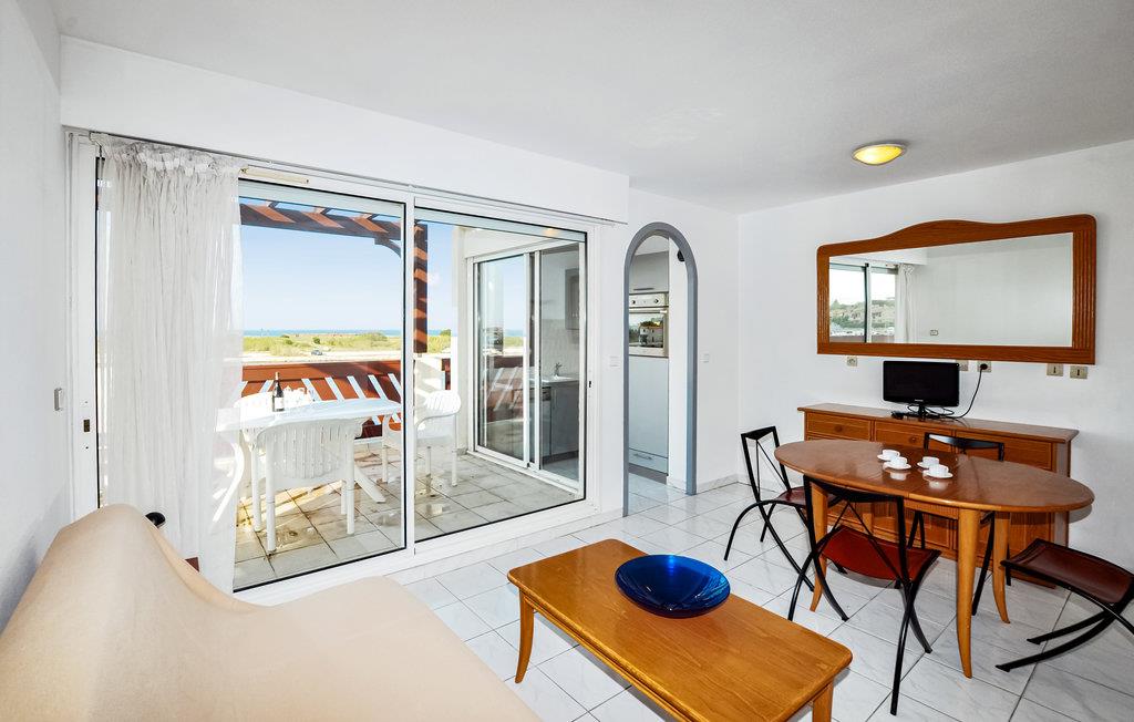 Im Wohnraum dieses Apartments erwartet Sie eine einfache Ausstattung und bequeme Einrichtung, die für einen unbeschwerten Urlaub sorgen. Auf der weitläufigen Terrasse lässt es sich gut für Mahlzeiten aushalten, vor allem am Morgen, um die Sonnenstrahlen willkommen zu heißen oder an lauen Sommerabenden.