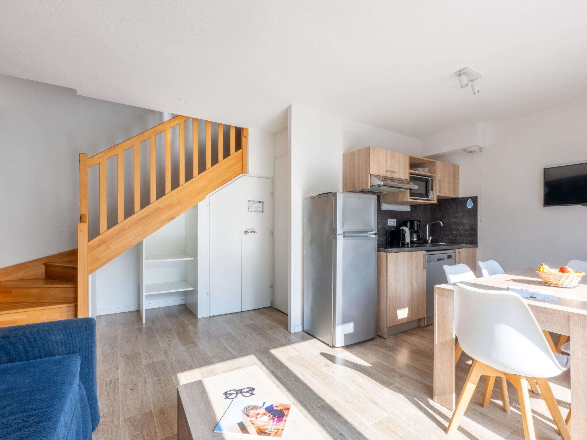 " Odalys Collection Le Domaine des Pins", 3-Zimmer-Wohnung 56 m2 auf 2 Stockwerken. Modern eingerichtet: Wohn-/Schlafzimmer mit 1 Bett, 1 Doppeldiwanbett, Esstisch und Sat-TV (Flachbildschirm). Offene Küche (Geschirrspüler, 4 Glaskeramikplatten, Toaster, Wasserkocher, elektrische Kaffeemaschine, Kombinationsmikrowelle). Obergeschoss: 1 Doppelzimmer. 1 Zimmer mit 1 x 2 Etagenbetten. Bad/WC. E-Heizung. Balkon oder Terrasse. Balkonmöbel. Zur Verfügung: Kinderhochstuhl, Babybett, Haartrockner. Internet (WLAN, gratis). Parkplatz. Bitte beachten: Nichtraucher-Unterkunft. Maximal 2 Haustiere/Hunde erlaubt. Rauchmelder, Feuerlöscher.