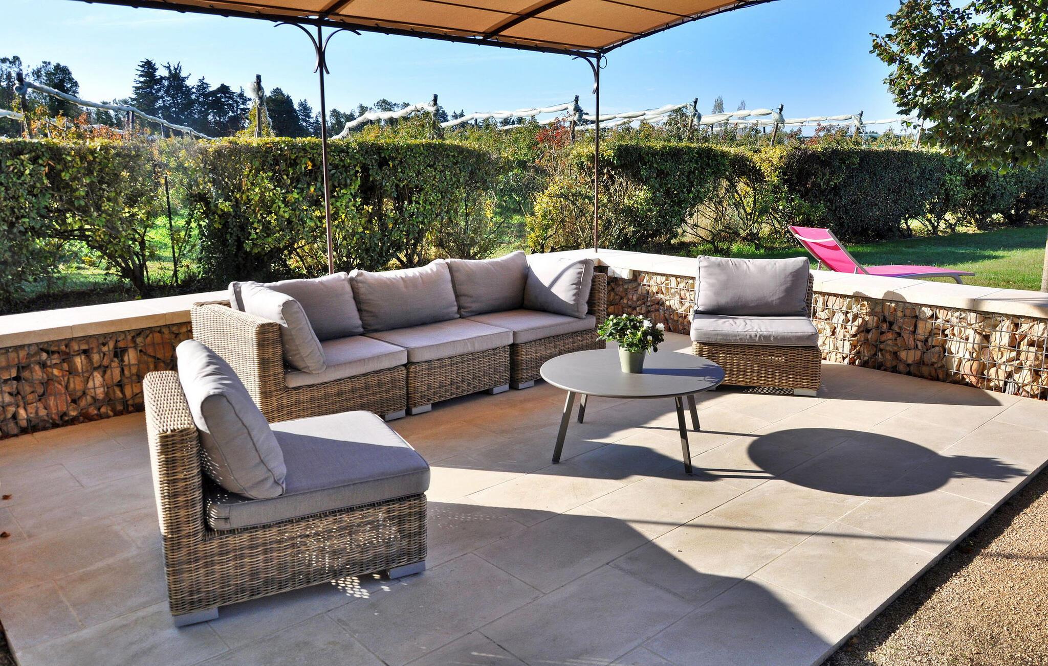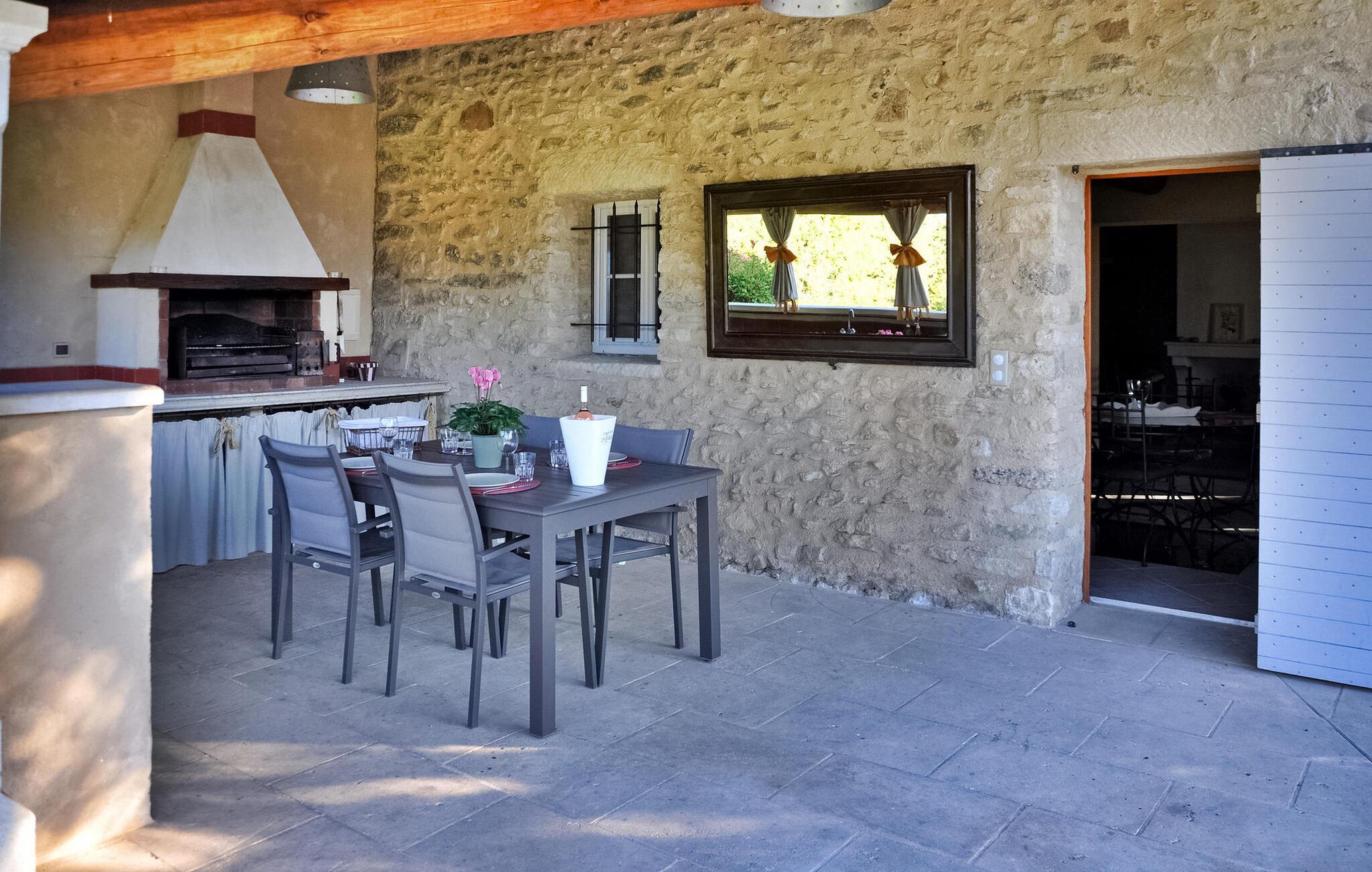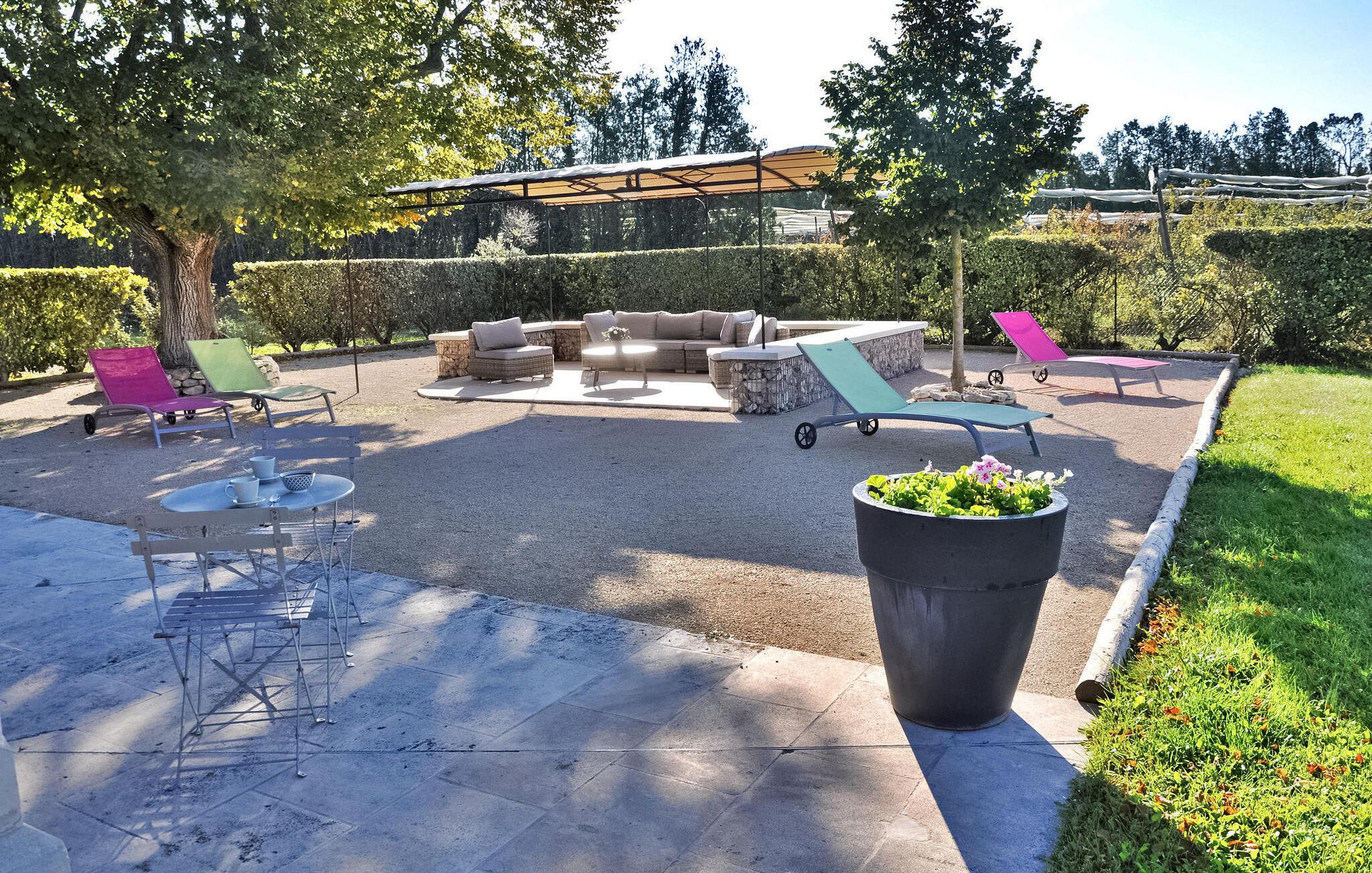 Genießen Sie die ruhige Landschaft von Isle-sur-la-Sorgue mit diesem herrlichen Ferienhaus, das einen ruhigen Rückzugsort nur 4 km von der Stadt entfernt bietet. Inmitten der ruhigen Umgebung gelegen, sorgt dieses Feriendomizil für einen komfortablen Aufenthalt für Ihre Urlaubsabenteuer. Das Anwesen verfügt über ein Erdgeschoss mit einer gut ausgestatteten Küche/Essbereich, der auf die einladende überdachte Terrasse und den Garten führt. Der offene Wohnbereich bietet einen gemütlichen Ort zum Entspannen, während das Schlafzimmer im Erdgeschoss einen einfachen Zugang bietet. Entdecken Sie im Obergeschoss die geschmackvoll eingerichteten Schlafzimmer, die für ruhige Nächte sorgen, ergänzt durch ein modernes Duschbad. Wenn man nach draußen geht, bietet das nicht eingezäunte Gelände flache Grasflächen, die von malerischen Apfelplantagen umgeben sind. Die überdachte Terrasse lädt zum Essen im Freien ein und ist mit einer Spüle, einem Kühlschrank und einem Holzkohlegrill ausgestattet, der sich perfekt für gemütliche Zusammenkünfte eignet. Darüber hinaus bietet eine schattige Terrasse einen ruhigen Ort zum Entspannen und Genießen des Pool- und Gartenblicks. Das Highlight bleibt der private Swimmingpool (10 x 5 m), der eine erfrischende Oase bietet. Auf den gepflegten Rasenflächen laden Sonnenliegen zum Entspannen in ruhiger Atmosphäre ein. Etwa 2 km entfernt liegt der Weiler „Le Petit Palais“, wo Sie lokale Geschäfte finden: Bäckerei, Lebensmittel, Zeitung, Tabakbar, Benzin. Isle-sur-la-Sorgue ist berühmt für seine Antiquitäten und seinen Markt am Donnerstag und Sonntag. In der Nähe besuchen Sie auch Fontaine de Vaucluse und die Bergdörfer des Luberon: Gordes, Roussillon, Bonnieux.