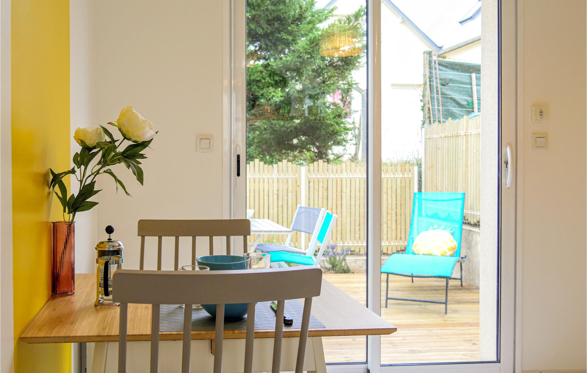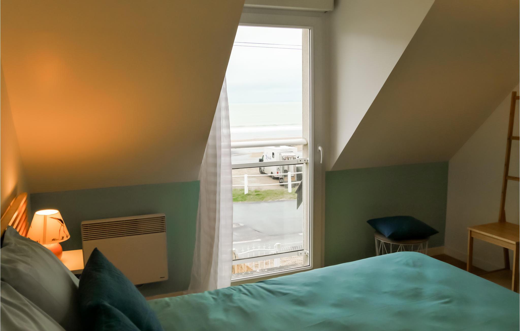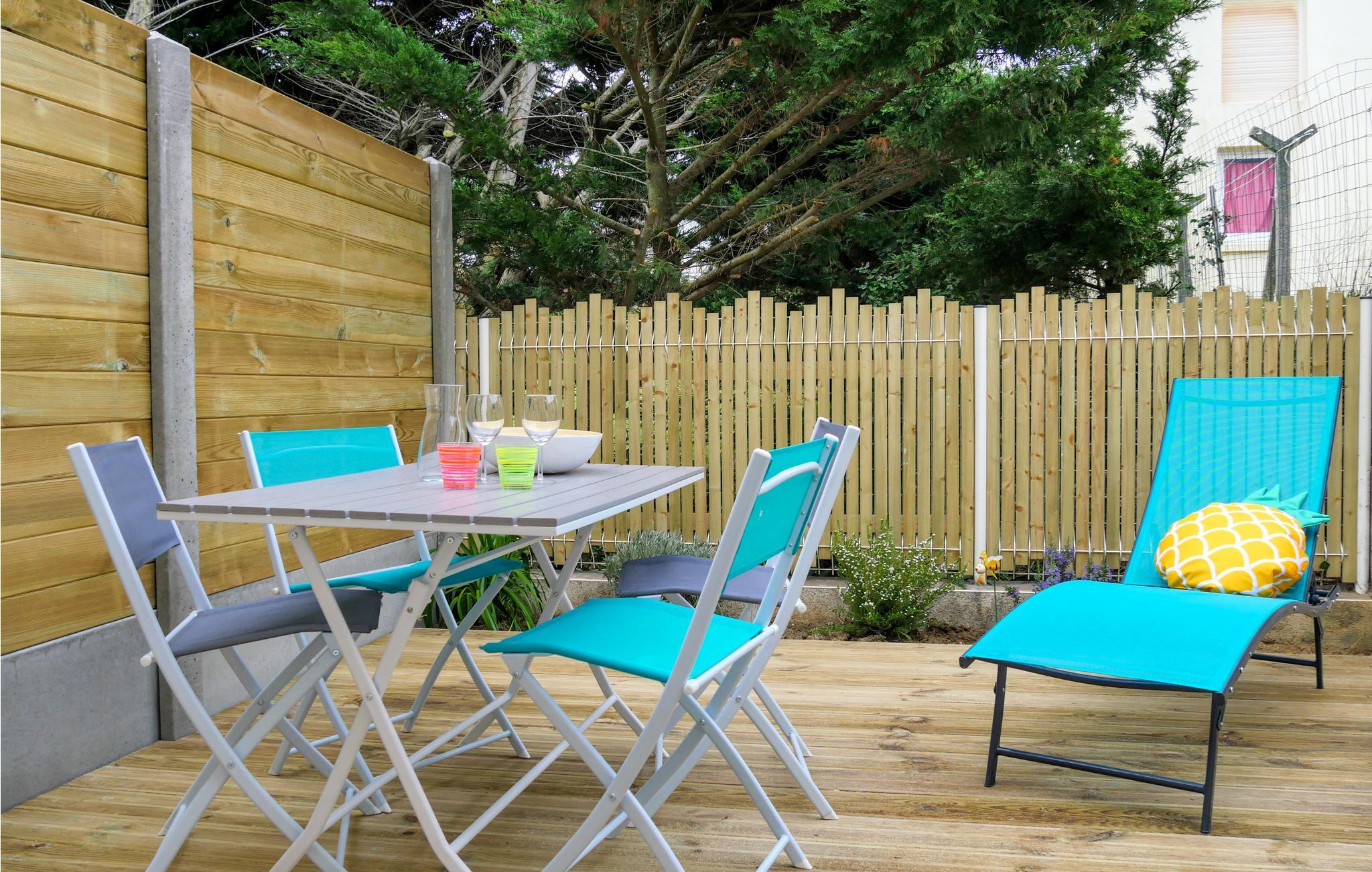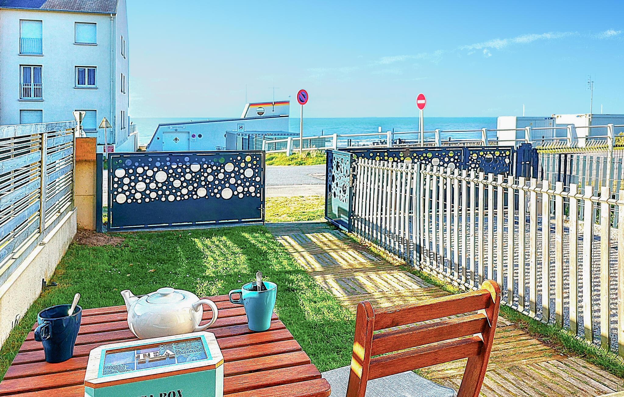 Schöne Ferienwohnung mit Terrasse und herrlichem Meerblick, nur 70 m vom Strand von Jullouville entfernt.