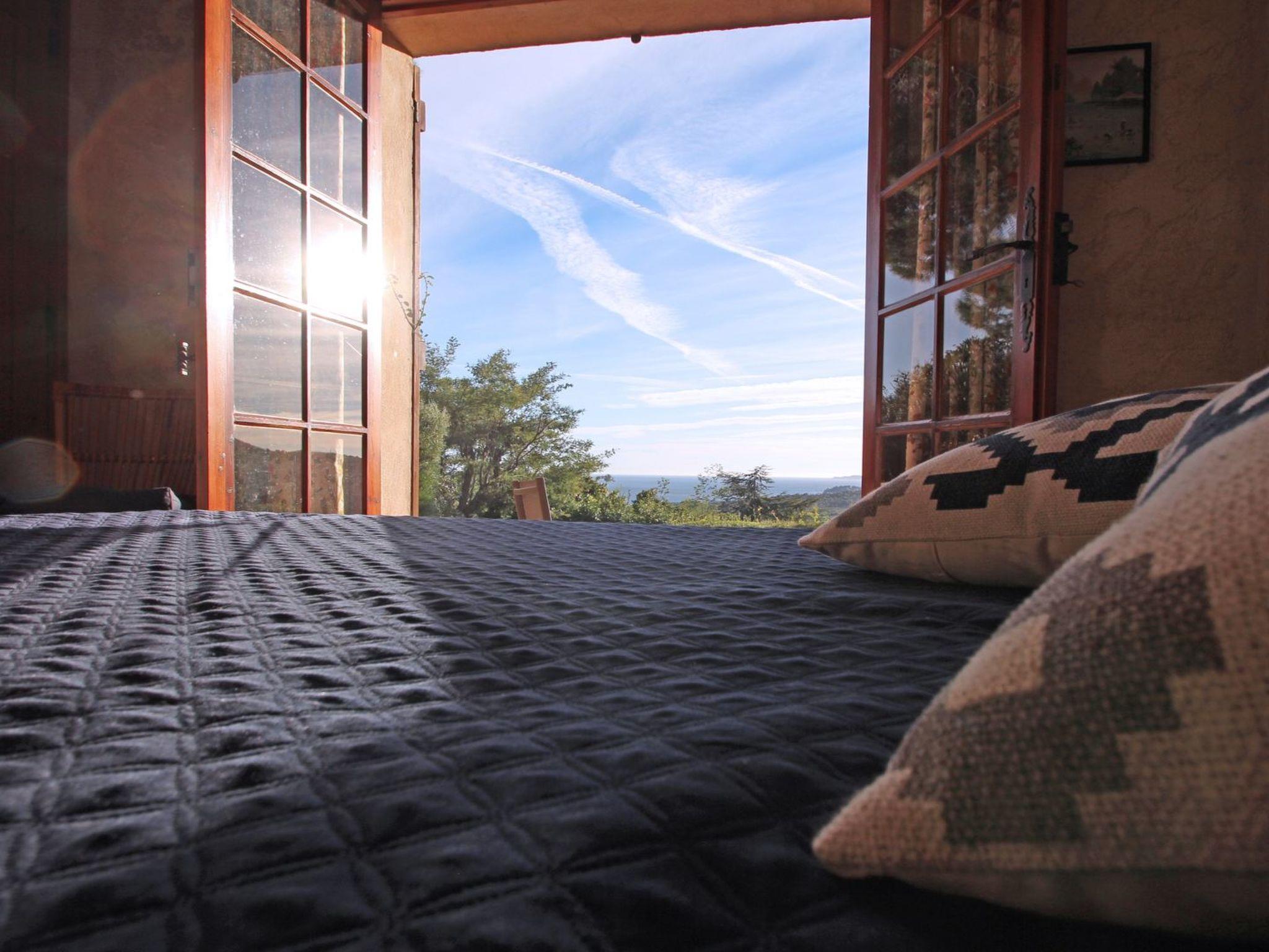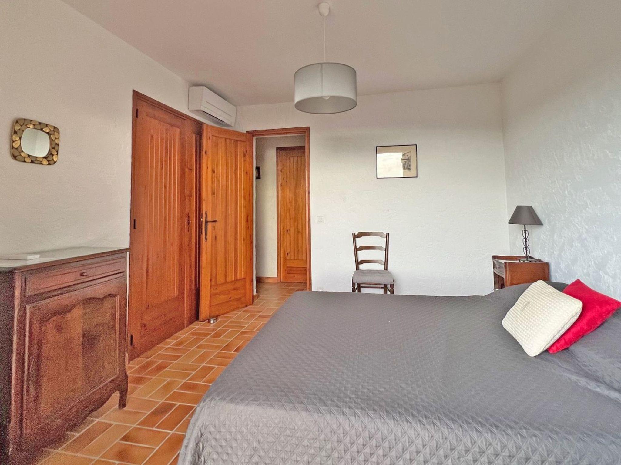 - Schlafzimmer 2 klimatisiert mit Doppelbett 160, Schränke, Zugang zum Garten und Meerblick.