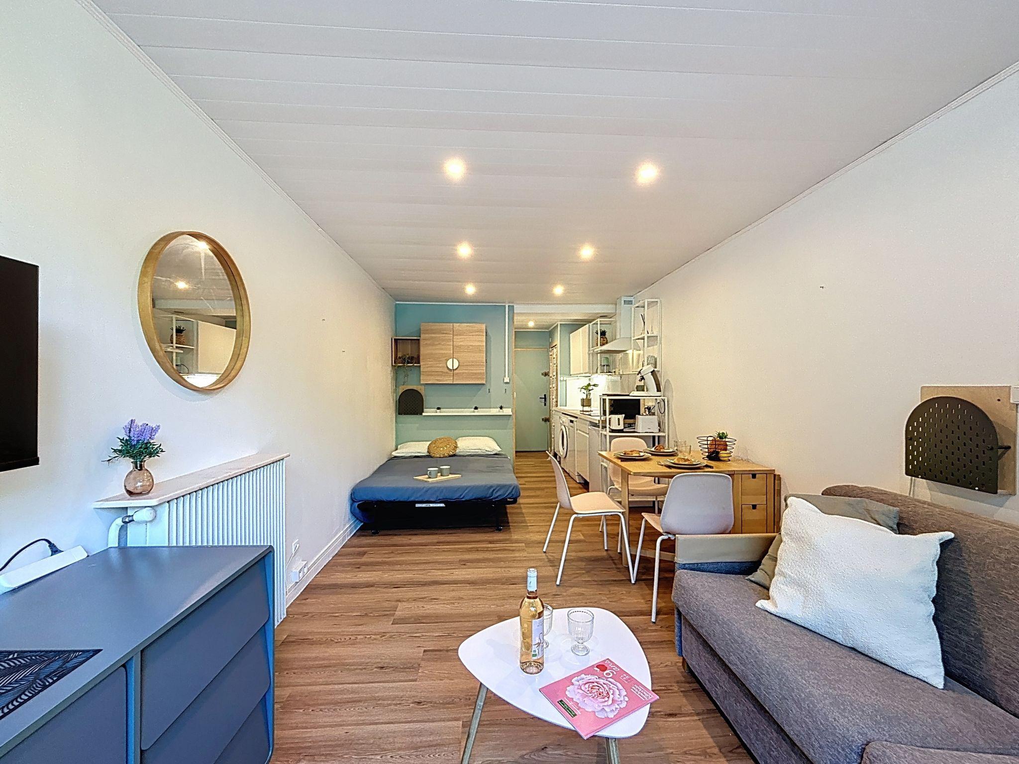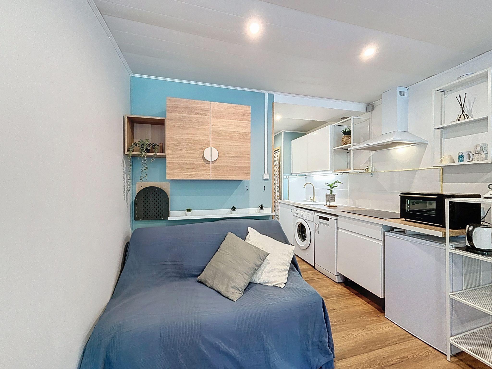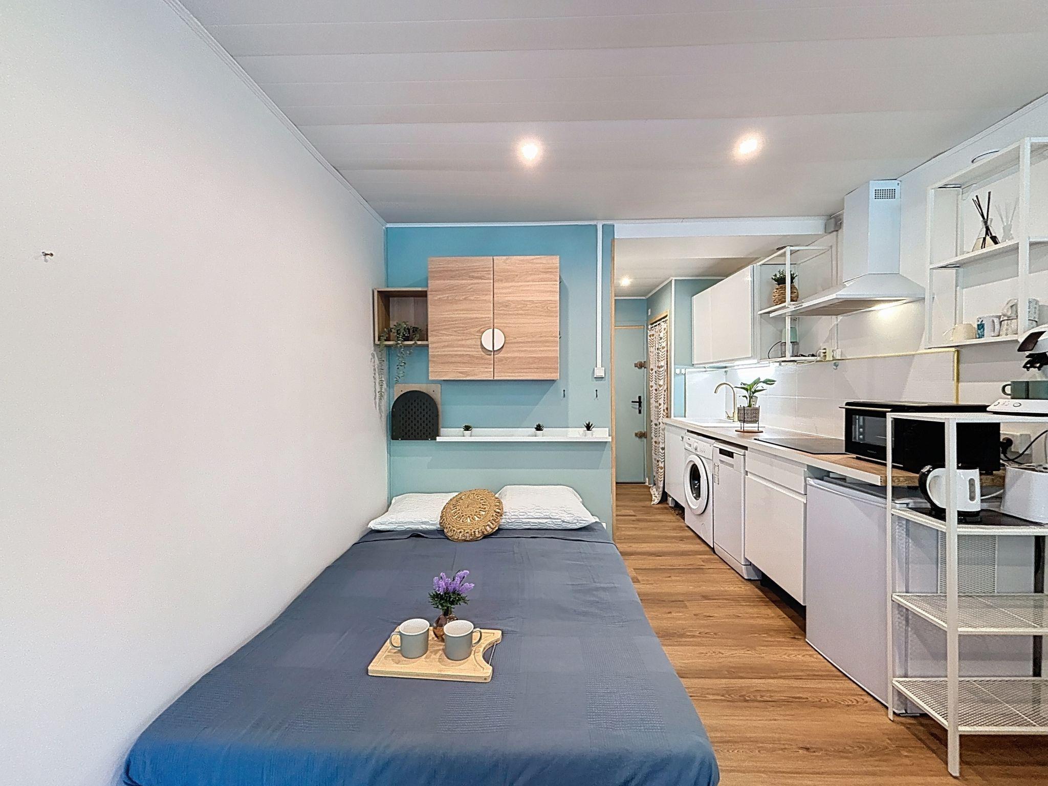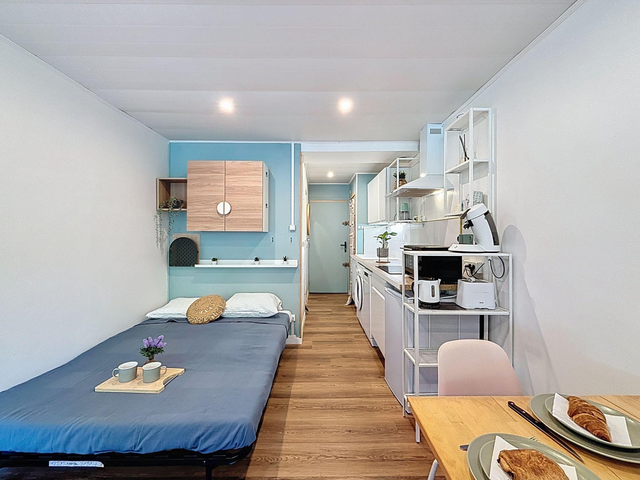1-Zimmer-Studio 25 m2 im 3. Stock, Nordostlage. Renoviert im Jahre 2024, zweckmässig und modern eingerichtet: Wohn-/Esszimmer, Richtung Norden und Richtung Osten mit 1 Diwanbett (90 cm, Länge 190 cm), 1 Doppeldiwanbett (1 x 140 cm, Länge 190 cm), TV (Flachbildschirm), E-Heizung und Ventilator. Kochnische (Mini-Backofen, Backofen, Geschirrspüler, 3 Induktionskochplatten, Mikrowelle, elektrische Kaffeemaschine, Kapseln für die Kaffeemaschine (SENSEO) extra). Dusche/WC. E-Heizung. Sicht auf den Garten. Zur Verfügung: Waschmaschine, Bügeleisen. Internet (WLAN, extra). Bitte beachten: Nichtraucher-Unterkunft, kein Parkplatz. Rauchmelder, kein Fahrstuhl. Inserat einer Privatperson nach Artikel 155, IV, CGI.