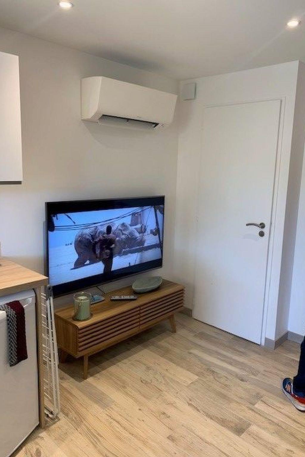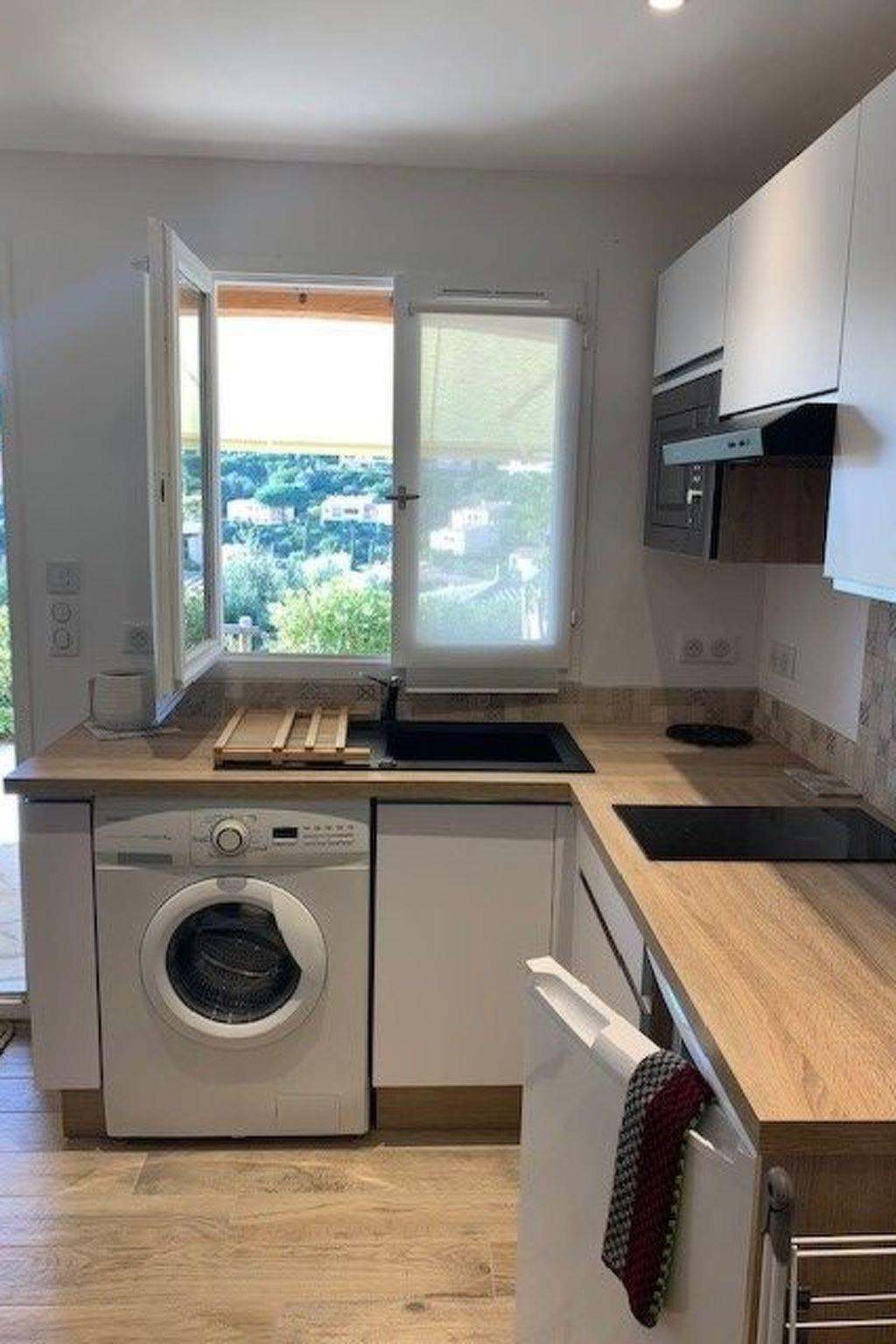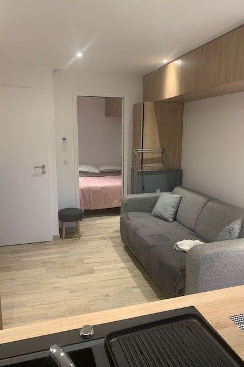 Ein Wohnraum mit einer voll ausgestatteten Küche mit Backofen, Waschmaschine, Kühlschrank, Gastgebern und Cerankochfeld. Küchenutensilien für 4 Personen, Kaffeemaschinen (klassisch und Nespresso), ein 2-Sitzer-Sofa, auf dem 2 Personen vor dem Flachbildfernseher schlafen können.