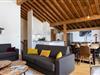 Wohnzimmer(Doppelschlafcouch(140 x 200 cm), TV(Flatscreen), Sitzecke), offene Küche(Kochplatte(Ceranfeld), Wasserkocher, Toaster, Kaffeemaschine, Backofen, Mikrowelle, Spülmaschine, ), Schlafzimmer mit Badezimmer(Doppelbett(160 x 200 cm), Dusche, Toilette), Hütte(Etagenbett(90 x 190 cm)), Badezimmer(Dusche), Toilette(Toilette), Balkon, Mountain view