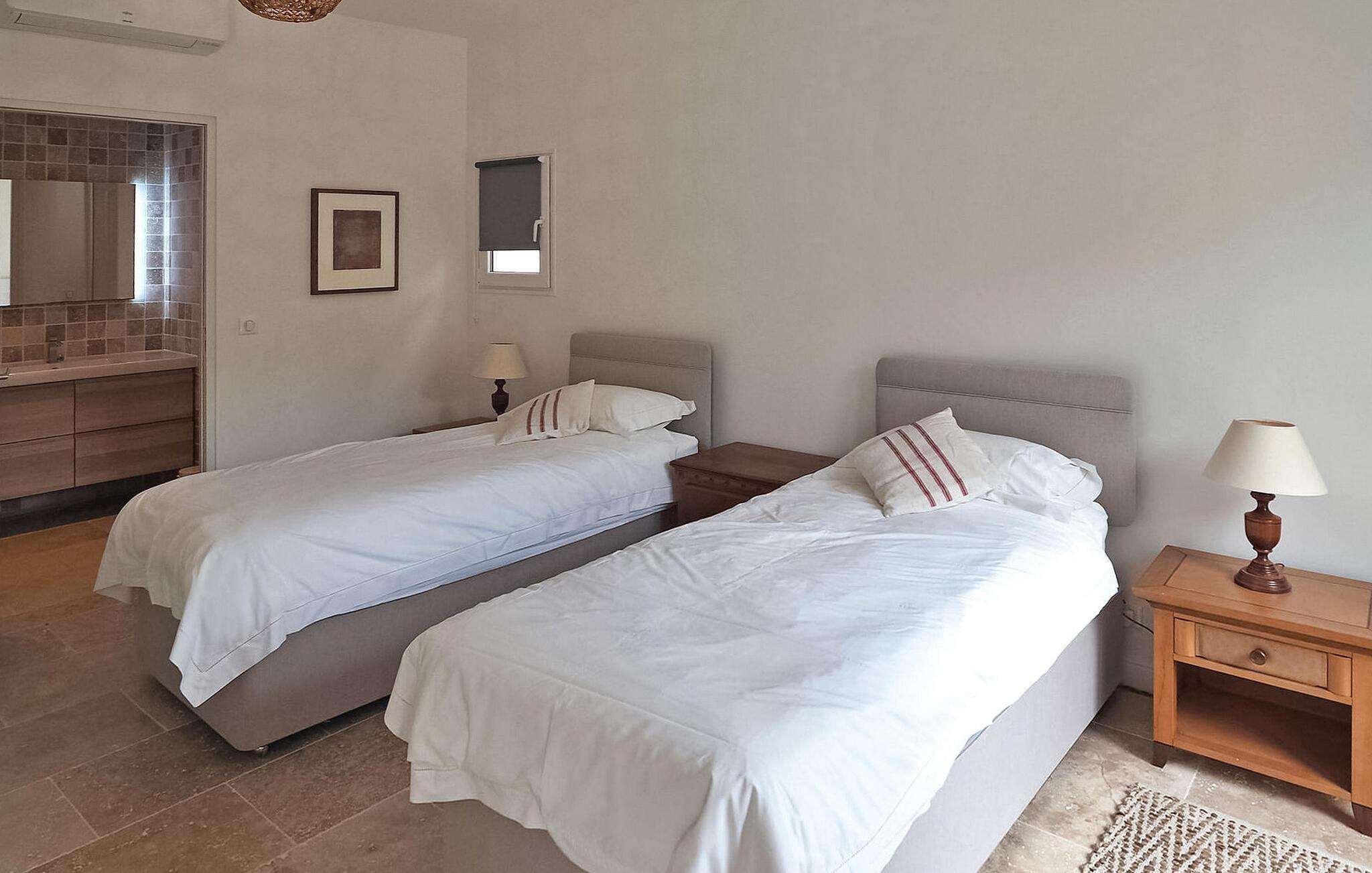 Die kürzlich renovierte Ferienvilla in Maussane les Alpilles bietet einen komfortablen Aufenthalt mit klimatisierten Schlafzimmern, die jeweils über ein eigenes Duschbad verfügen. Der umzäunte Pool im Gartenbereich bietet den Gästen einen sicheren und privaten Freizeitraum. Das Haus verfügt über einen klimatisierten Wohnbereich mit einer gemütlichen Sitzgruppe rund um einen Fernseher. Es gibt ein Esszimmer neben einer offenen Küche, die komplett mit modernen Annehmlichkeiten und einer Bartheke mit hohen Hockern ausgestattet ist. Draußen umgibt ein kleiner, angelegter Garten das Anwesen und beherbergt einen eingezäunten Pool von 6 x 3,5 m, der zum entspannten Schwimmen einlädt. Sowohl auf der West- als auch auf der Ostseite der Villa gibt es Tische und Stühle, die ausreichend Sitzgelegenheiten für Mahlzeiten im Freien bieten. Darüber hinaus gibt es eine schattige Bowlingbahn für Unterhaltung und Freizeitaktivitäten. Die Villa liegt 1 km von den Geschäften im Zentrum von Maussane-les-Alpilles entfernt. Der Eingang zum Golfplatz Manville ist 500 m entfernt.
