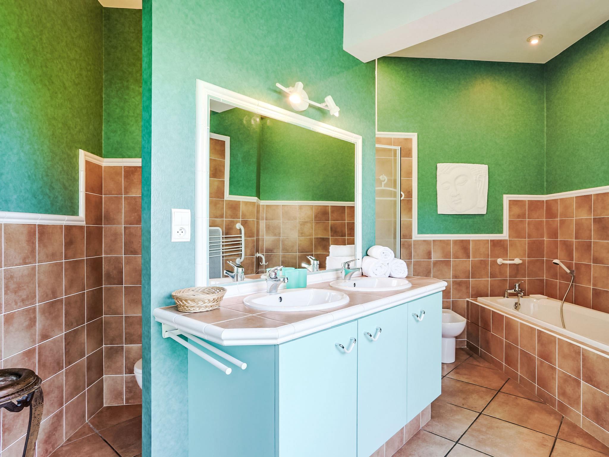 7-Zimmer-Haus 240 m2 auf 2 Stockwerken. Komfortabel eingerichtet: Wohn-/Esszimmer. Ausgang zur Terrasse. 1 Zimmer mit 1 franz. Bett (1 x 140 cm, Länge 190 cm), Dusche. 1 Zimmer mit 1 franz. Bett (1 x 140 cm, Länge 190 cm), Bad/WC. 1 Zimmer mit 2 Betten (90 cm, Länge 190 cm). 1 Zimmer mit 2 Betten (90 cm, Länge 190 cm). Kochnische (4 Kochplatten, Backofen). Dusche, sep. WC. Obergeschoss: Wohn-/Esszimmer mit Sat-TV und Internationale TV-Sender (Flachbildschirm). Ausgang zum Balkon. 1 Zimmer mit 1 franz. Bett (1 x 140 cm, Länge 190 cm), Bad/Dusche/WC und Doppelwaschbecken. Kochnische (Backofen, Geschirrspüler, 4 Glaskeramikplatten, Mikrowelle). Sep. WC. E-Heizung. Balkon, Südlage, Terrasse teilweise überdacht, Südlage. Terrassenmöbel, Balkonmöbel, Gartengrill, Liegestühle (6). Schöne Sicht auf den Fluss. Zur Verfügung: Waschmaschine. Internet (Wireless LAN, gratis). Bitte beachten: geeignet für Familien. Rauchmelder.