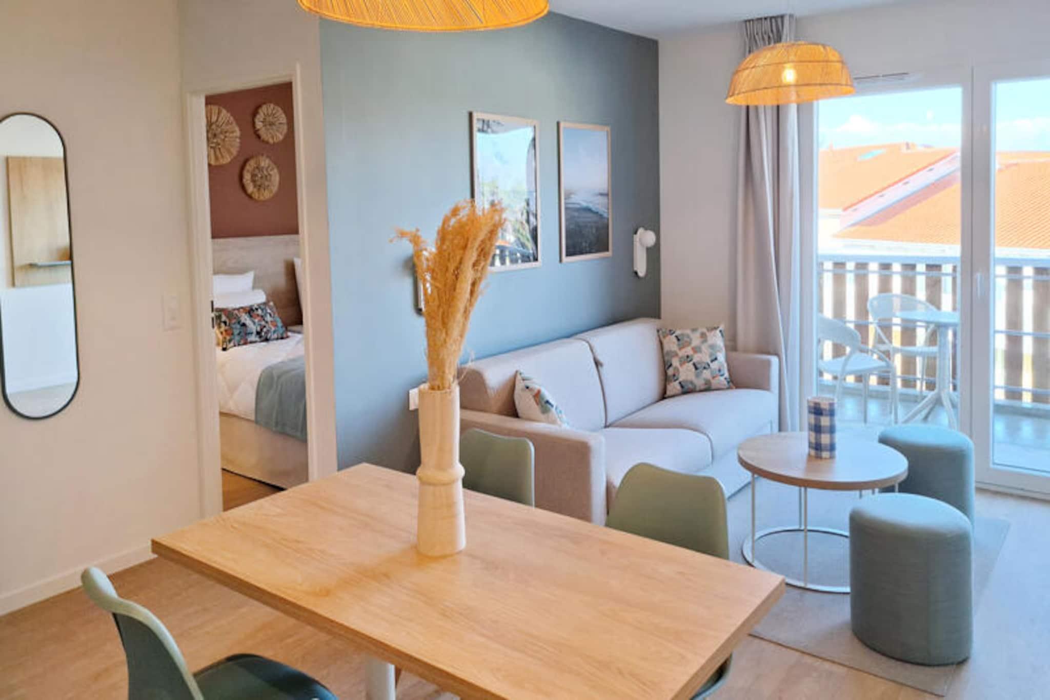 Im Herzen von Mimizan, wo der Duft der Pinienwälder auf die erfrischende Brise des Atlantiks trifft, bietet die Odalys Bleu Canopée Residence einen ruhigen Rückzugsort für Reisende, die sowohl Entspannung als auch Abenteuer suchen. Diese kürzlich erbaute Residenz liegt nur 650 Meter von den goldenen Sandstränden entfernt und ist somit ein idealer Ausgangspunkt, um die natürliche Schönheit und die lebendige Kultur der Region Landes zu erkunden. Ob Sie Wassersportler sind oder einfach nur das Meer lieben, dieses Reiseziel verspricht unvergessliche Momente. Die Residenz bietet modernen Komfort und durchdachte Annehmlichkeiten, die Ihren Aufenthalt noch angenehmer machen. Die Unterkünfte verfügen über ein gemütliches Wohnzimmer mit einem Ausziehsofa oder Schlafsofa, eine voll ausgestattete Küchenzeile und zwei einladende Schlafzimmer mit Doppelbetten. Jede Einheit verfügt außerdem über einen privaten Balkon oder eine Terrasse, von denen aus Sie die ruhige Umgebung genießen können. Entspannen Sie sich am Außenpool oder lassen Sie die Kleinen im Planschbecken planschen. Für diejenigen, die einen aktiven Urlaub suchen, bietet der Fitnessraum vor Ort ein großartiges Training, während die Sauna nach einem erlebnisreichen Tag einen wohltuenden Rückzugsort bietet. Der Charme von Mimizan erstreckt sich über die Residenz hinaus. Die nahe gelegenen Strände sind ein Paradies für Surfer, Paddleboarder und Jetski-Fans, während die Stadt selbst mit sommerlicher Energie, lokalen Märkten und reizvollen Restaurants pulsiert. Erkunden Sie die malerischen Radwege, die sich durch den üppigen Wald der Landes schlängeln, oder entspannen Sie einfach am Meer, genießen Sie die Sonne und die entspannte Atmosphäre an der Küste. Ob Sie nun wegen des Nervenkitzels des Wassersports, der Faszination der Natur oder einfach wegen der Freude an einem ruhigen Urlaub hier sind, die Odalys Bleu Canopée Residence ist Ihr Tor zu einem unvergesslichen Urlaub an der Atlantikküste.