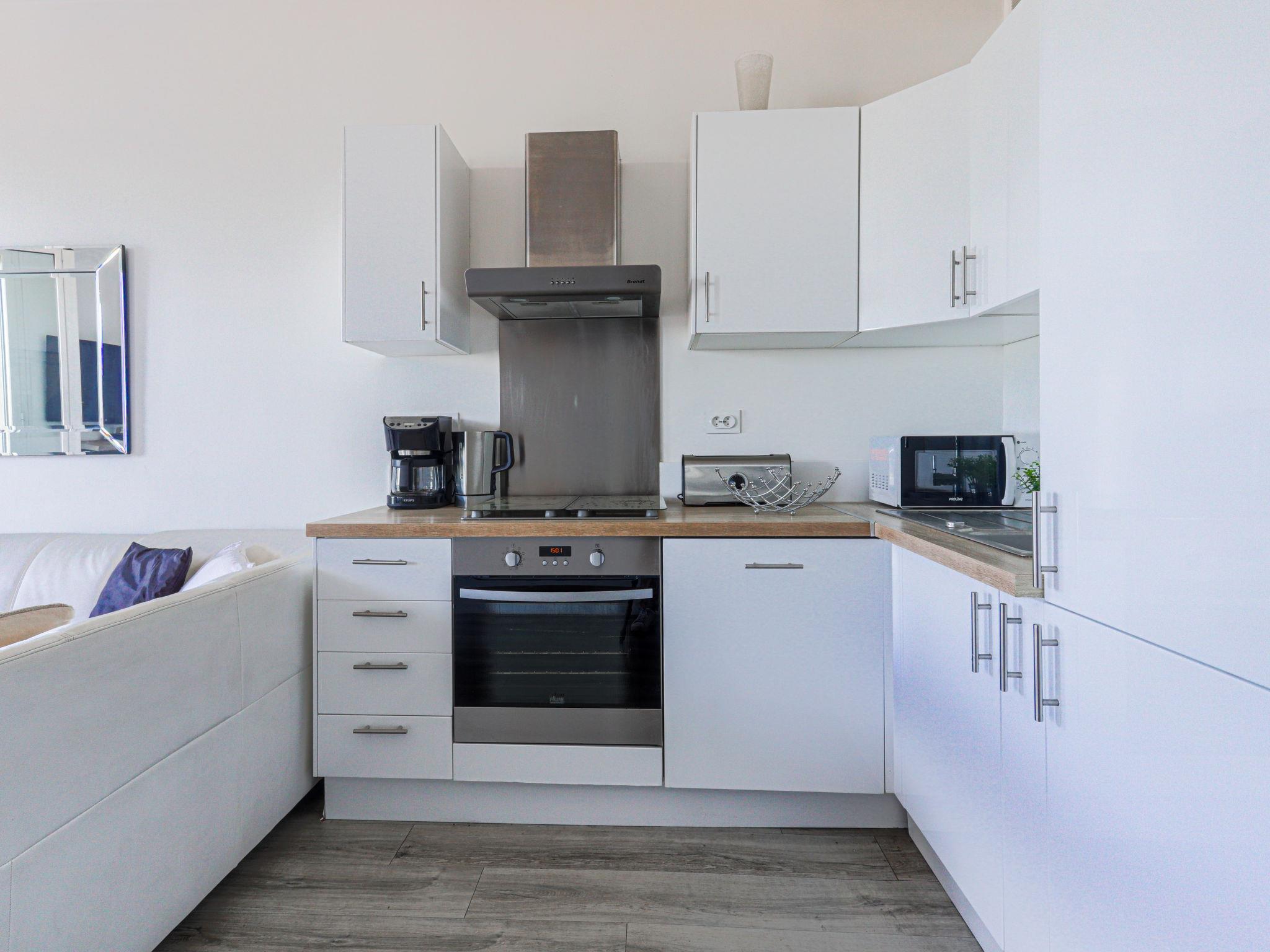 1-Zimmer-Studio 40 m2 im 2. Stock, Südlage. Geräumig und hell, renoviert, schön und modern eingerichtet: Wohn-/Esszimmer mit 1 franz. Bett (1 x 140 cm, Länge 190 cm), TV und Internationale TV-Sender (Flachbildschirm), Klimaanlage. Ausgang zur Terrasse. Offene Küche (Backofen, Geschirrspüler, 4 Induktionskochplatten, Wasserkocher, Mikrowelle, Tiefkühler, elektrische Kaffeemaschine). Dusche/WC. Heizung, Klimaanlage. Parkettboden. Terrasse 7 m2, Südlage. Terrassenmöbel. Herrliche Panoramasicht auf das Meer. Zur Verfügung: Waschmaschine, Wäschetrockner, Bügeleisen, Haartrockner. Internet (WLAN, gratis). Bitte beachten: Maximal 1 Haustier/Hund erlaubt. Rauchmelder. 06088009340HT
