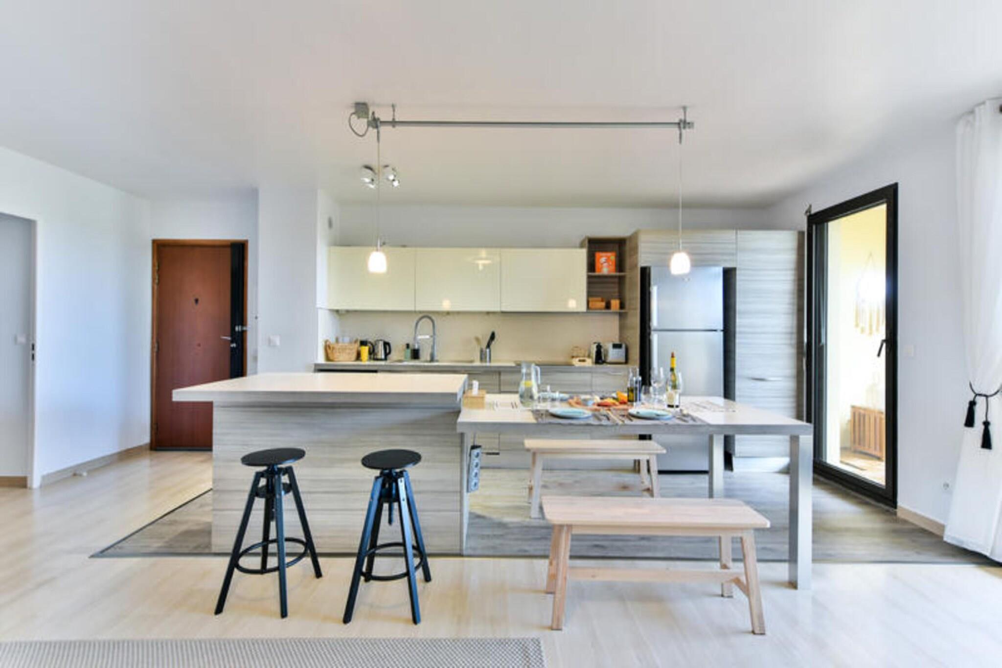 Dieses charmante Apartment bietet einen ruhigen Rückzugsort und liegt gleichzeitig günstig, nur 5 Autominuten vom Meer und 10 Minuten vom Stadtzentrum entfernt. In einer Residenz mit Swimmingpool gelegen, verspricht es sowohl Entspannung als auch Komfort. Das geräumige Wohnzimmer sorgt für eine einladende Atmosphäre und die voll ausgestattete amerikanische Küche eignet sich perfekt für die Zubereitung von Mahlzeiten zu Hause. Das Apartment verfügt über zwei gut ausgestattete Schlafzimmer: eines mit einem Kingsize-Bett und das andere mit zwei Einzelbetten, was es ideal für Familien oder kleine Gruppen macht. Das Badezimmer und die separate Toilette tragen zum Komfort des Raumes bei. Sie werden es lieben, Ihr Frühstück auf der mit Sitzgelegenheiten im Freien ausgestatteten Terrasse zu genießen, wo Sie die ruhige Umgebung genießen können. Die Wohnung ist voll klimatisiert und sorgt das ganze Jahr über für Komfort. Darüber hinaus bietet sie den zusätzlichen Vorteil eines privaten Garagenplatzes zum sicheren Parken. Für diejenigen, die die Gegend erkunden möchten, sind alle Geschäfte und Transportmöglichkeiten nur 200 Meter entfernt, und eine Straßenbahnhaltestelle ist nur 10 Gehminuten vom Apartment entfernt. Die Lage dieser Wohnung ist ideal für eine Saisonmiete in Nizza, mit einfachem Zugang zu den schönen Stränden und Sehenswürdigkeiten der Stadt. Von der Entspannung am Meer bis zur Erkundung des pulsierenden Stadtzentrums ist dieses Apartment der perfekte Ausgangspunkt für Ihren Aufenthalt. Darüber hinaus ermöglicht die nahe gelegene Straßenbahnhaltestelle eine einfache Fortbewegung in Nizza und ist somit eine großartige Option für diejenigen, die die Gegend erkunden möchten.