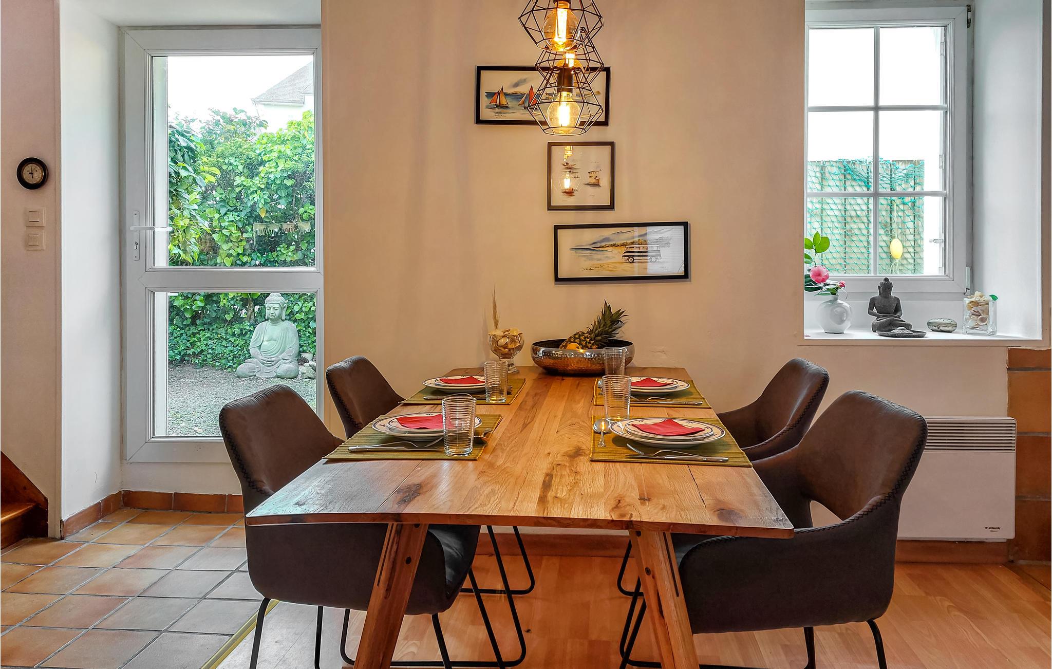 Reisen Sie in die Bretagne und verbringen in diesem geschmackvollen Ferienhaus einen unvergesslichen Urlaub. Betreten Sie das Haus und erkunden den gemütlichen Wohnraum, der das Kochen, Essen und Relaxen miteinander verbindet. Der Kaminofen kann an kühlen Abenden für ein wärmendes Klima im Haus sorgen, wo Sie sich für einen Film auf das Sofa zurückziehen können. Im 1. Stockwerk erwarten Sie schöne Schlafzimmer mit ausgesuchter Dekoration. Die Morgen können Sie mit einem Frühstück auf der Terrasse beginnen und dabei Ihre Aktivitäten besprechen.