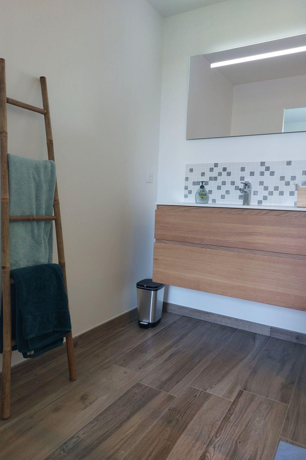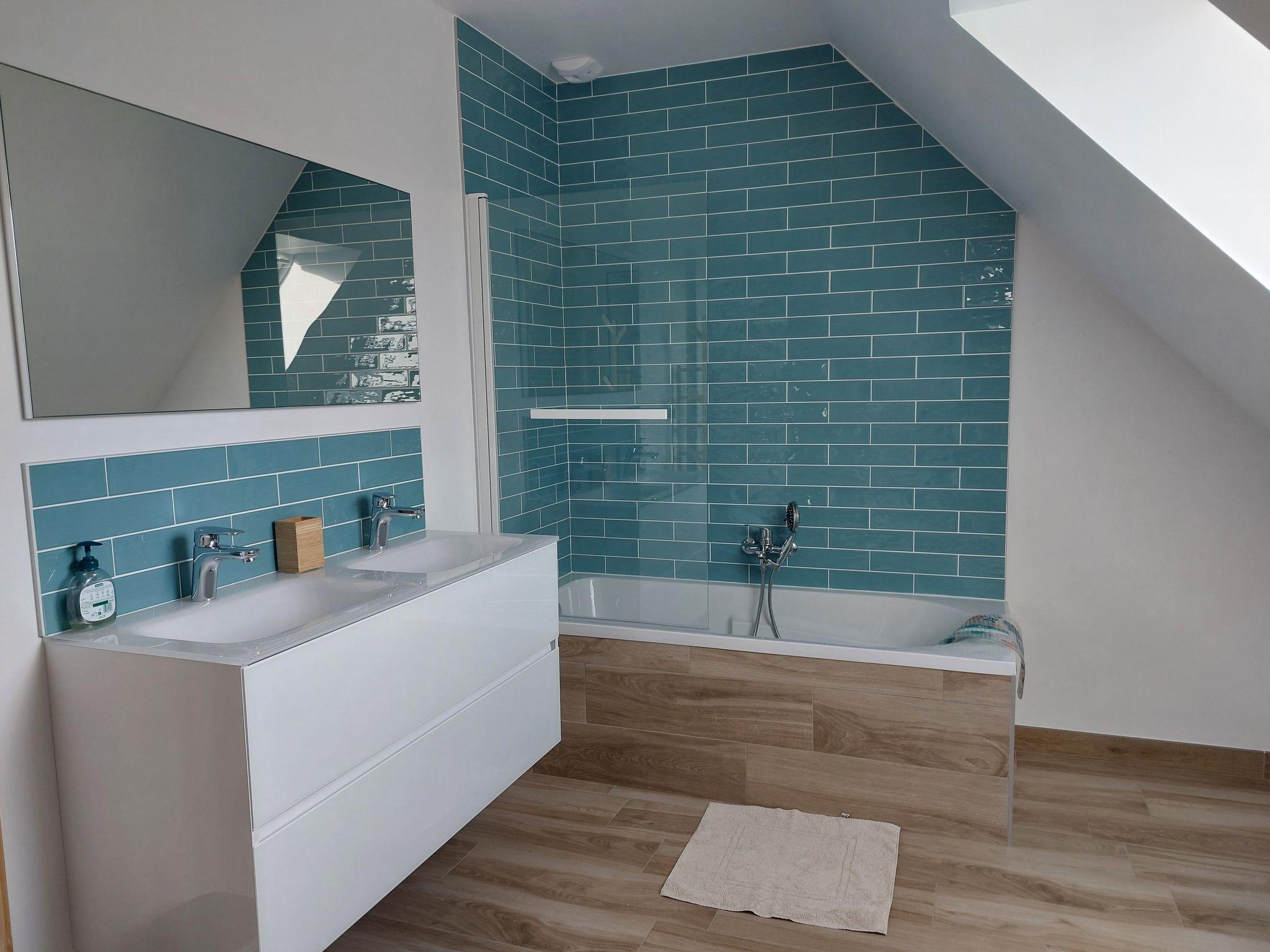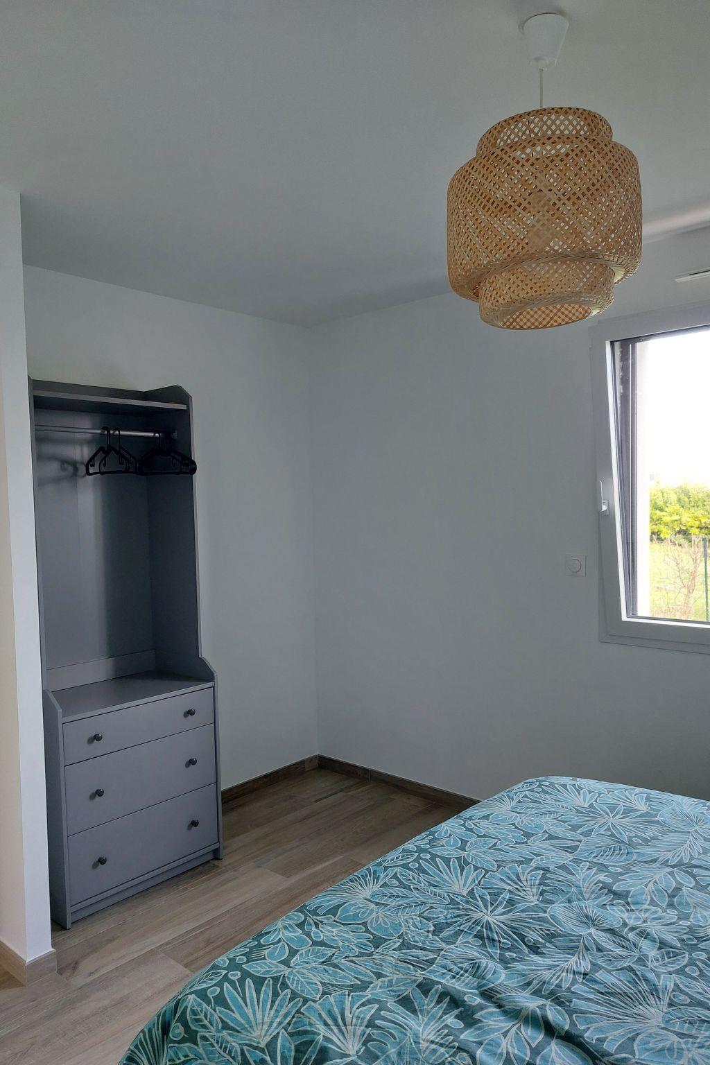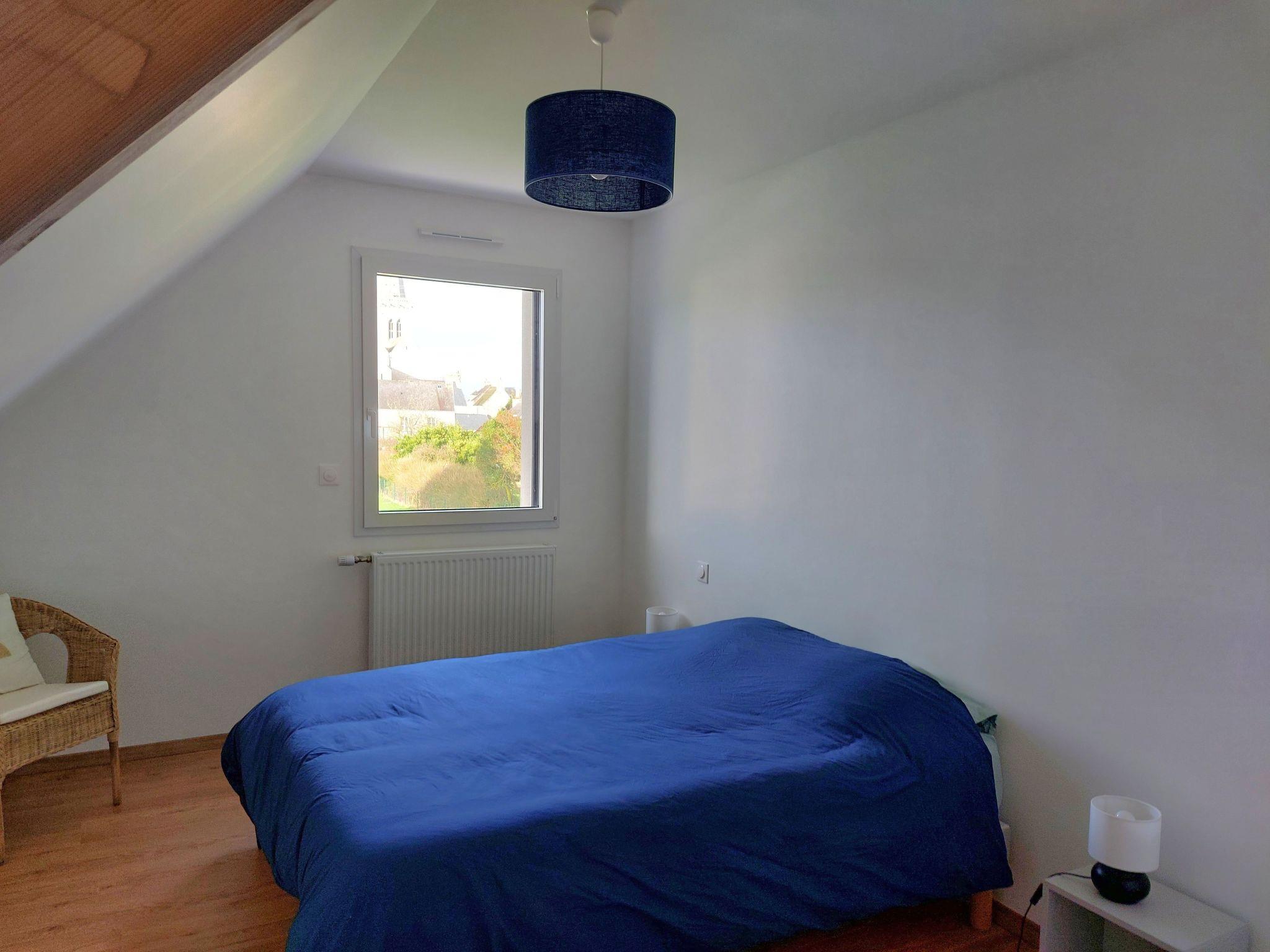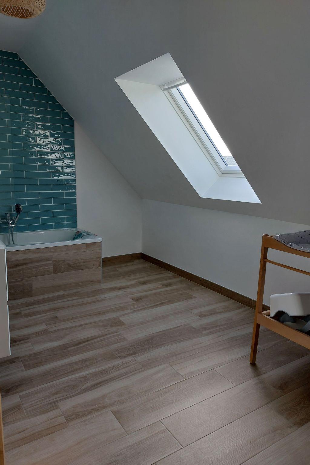 Treppe zum Obergeschoss mit einem Doppelzimmer mit Telearbeitsplatz (RJ45-Anschluss für Glasfaser-Internetverbindung), einem zweiten Doppelzimmer und einem dritten Zimmer mit Etagenbett, Babybett und einem zusätzlichen Schubladenbett. Ein Badezimmer mit Badewanne und Wickeltisch sowie eine Toilette vervollständigen die Etage.