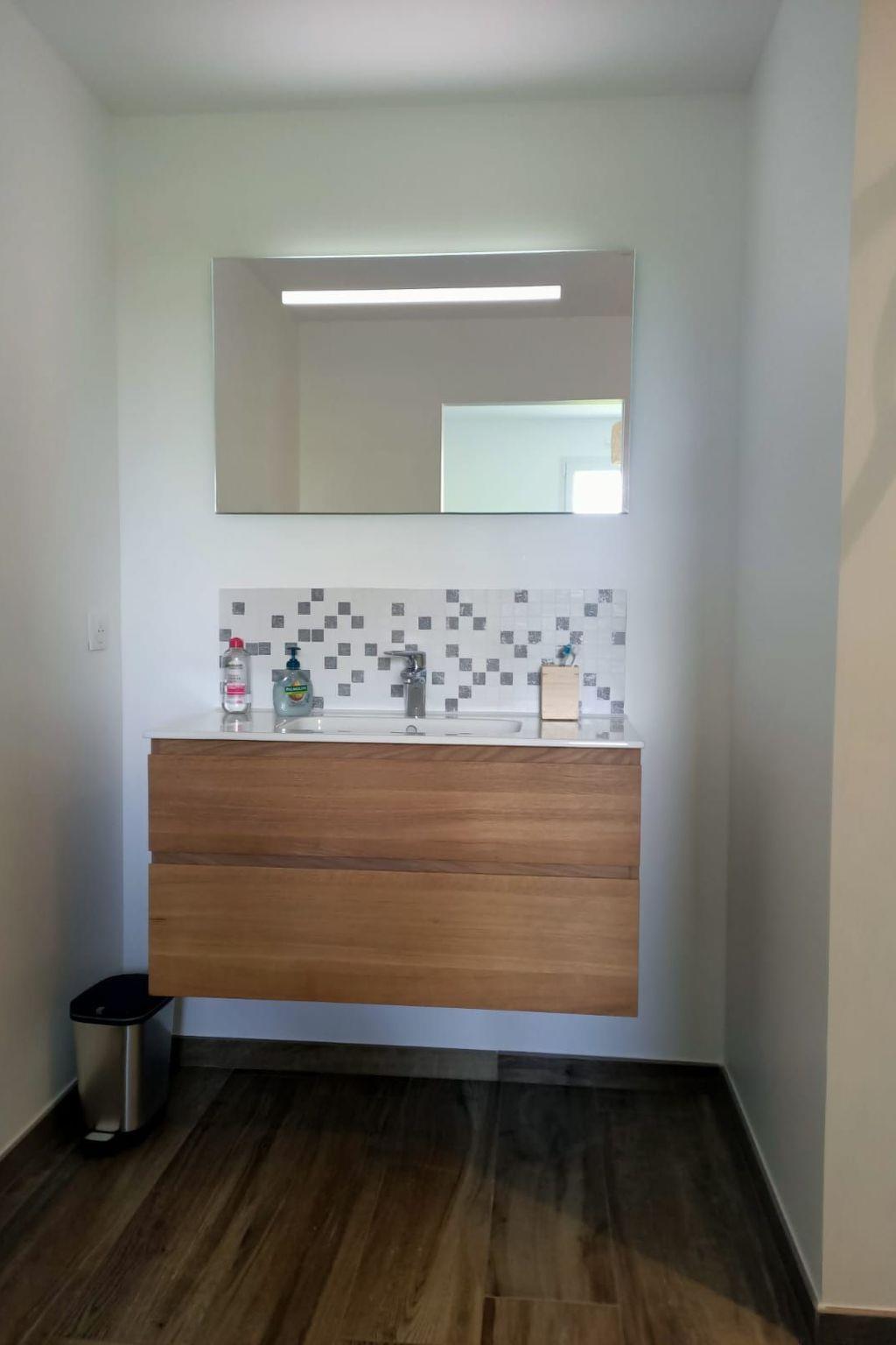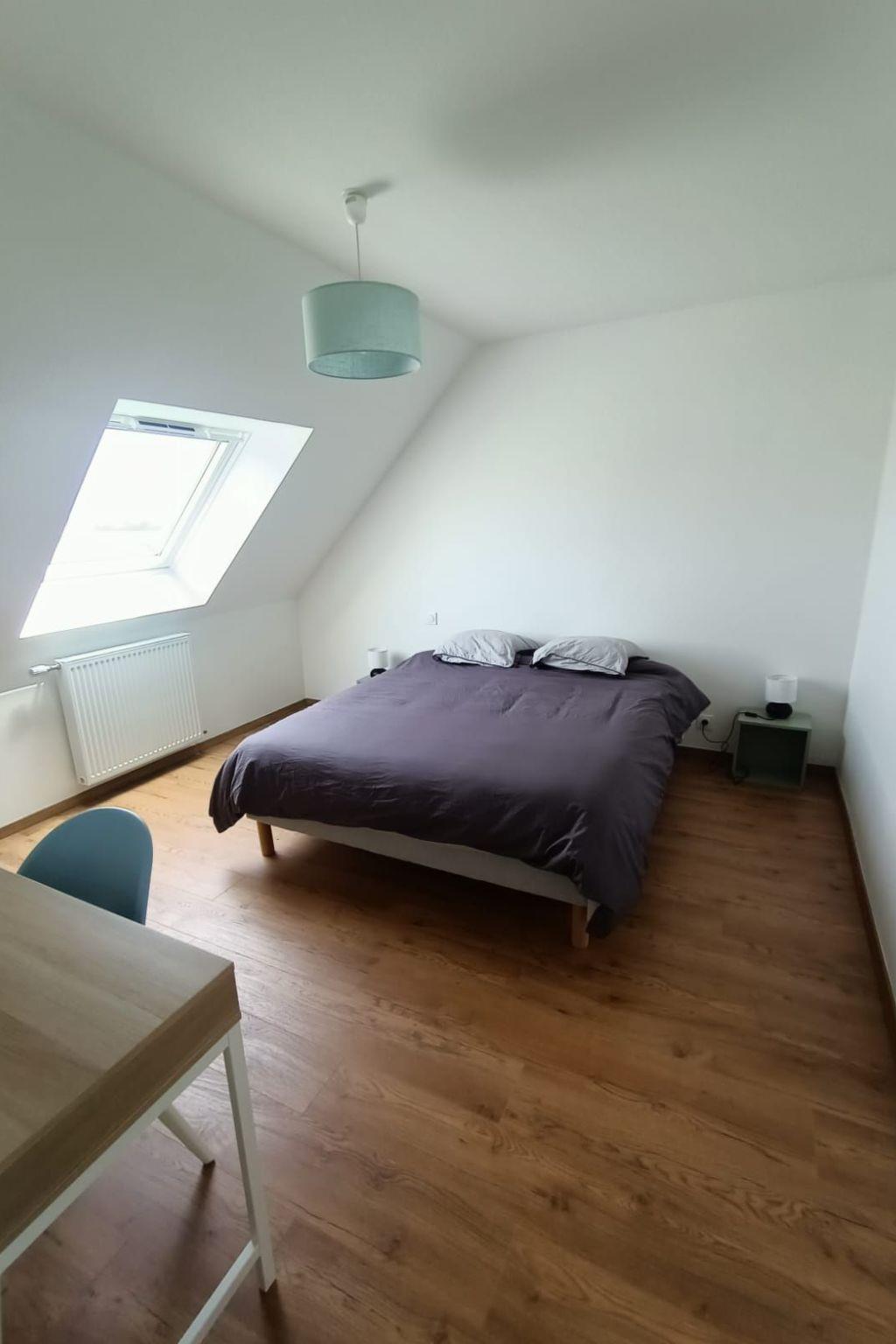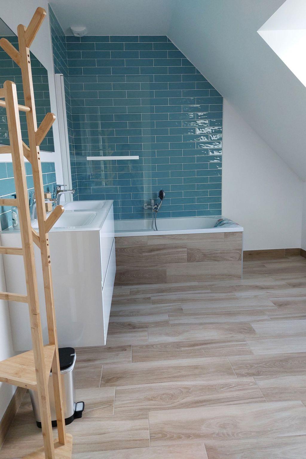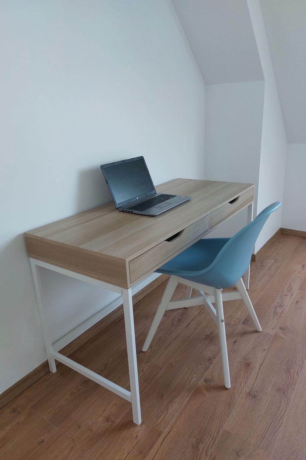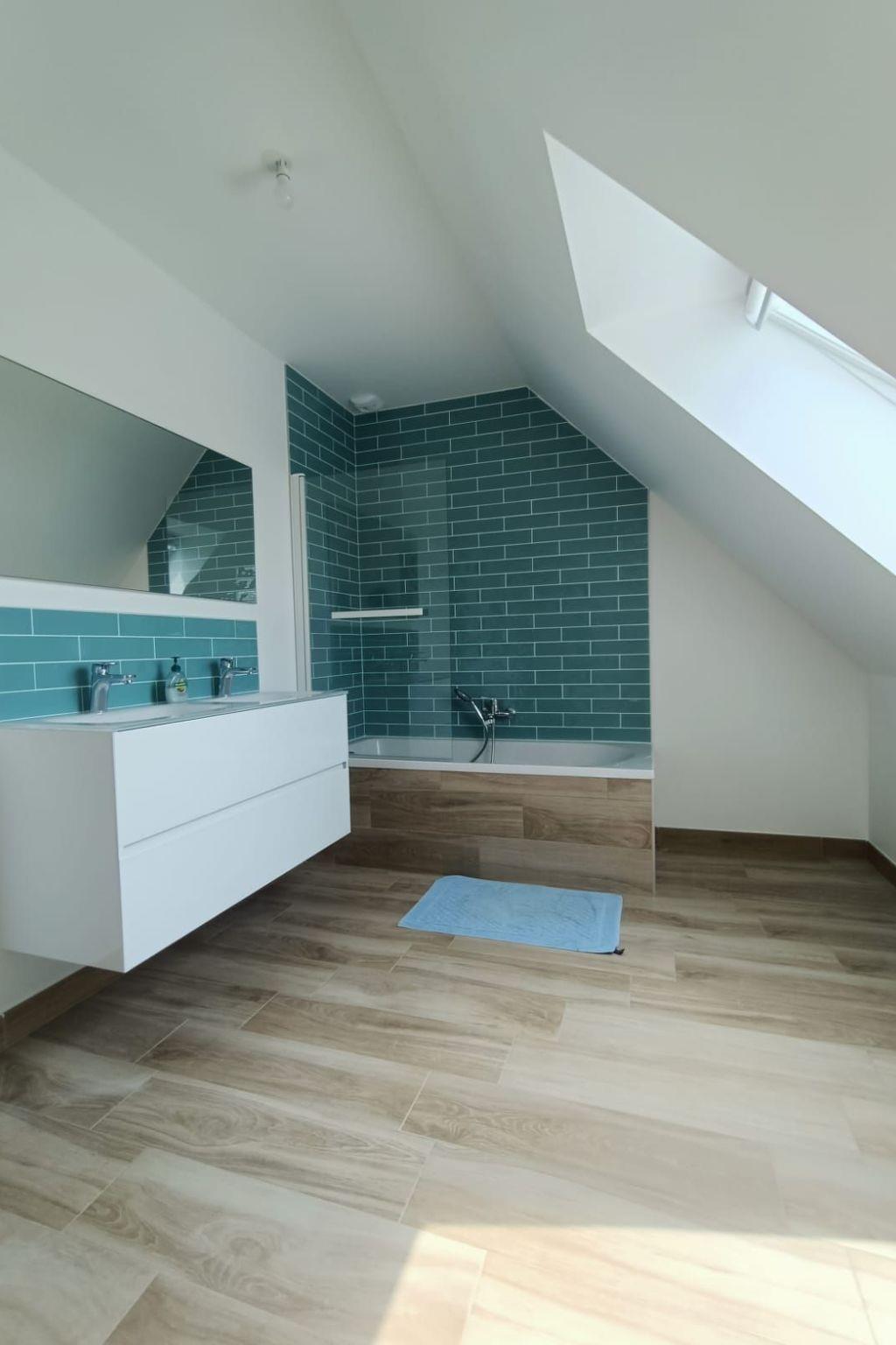 Treppe zum Obergeschoss mit einem Doppelzimmer mit Telearbeitsplatz (RJ45-Anschluss für Glasfaser-Internetverbindung), einem zweiten Doppelzimmer und einem dritten Zimmer mit Etagenbett, Babybett und einem zusätzlichen Schubladenbett. Ein Badezimmer mit Badewanne und Wickeltisch sowie eine Toilette vervollständigen die Etage.