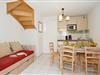 Wohnzimmer(2x Schlafcouch 1 Pers., TV), Kochnische(Kochplatte(Ceranfeld), Wasserkocher, Kaffeemaschine, Mikrowelle, Spülmaschine, Kühlschrank), Schlafzimmer(Doppelbett), Badezimmer(Badewanne oder Dusche, Waschbecken, Toilette), Balkon oder Terrasse, Gartenmöbel, Pool(Gemeinschaftliche Nutzung mit anderen Gästen, erwärmt, Einschließlich Kinderschwimmbad (Tiefe 50cm), geöffnet von 1/2 Mai bis einschließlich 1/2 Sep)